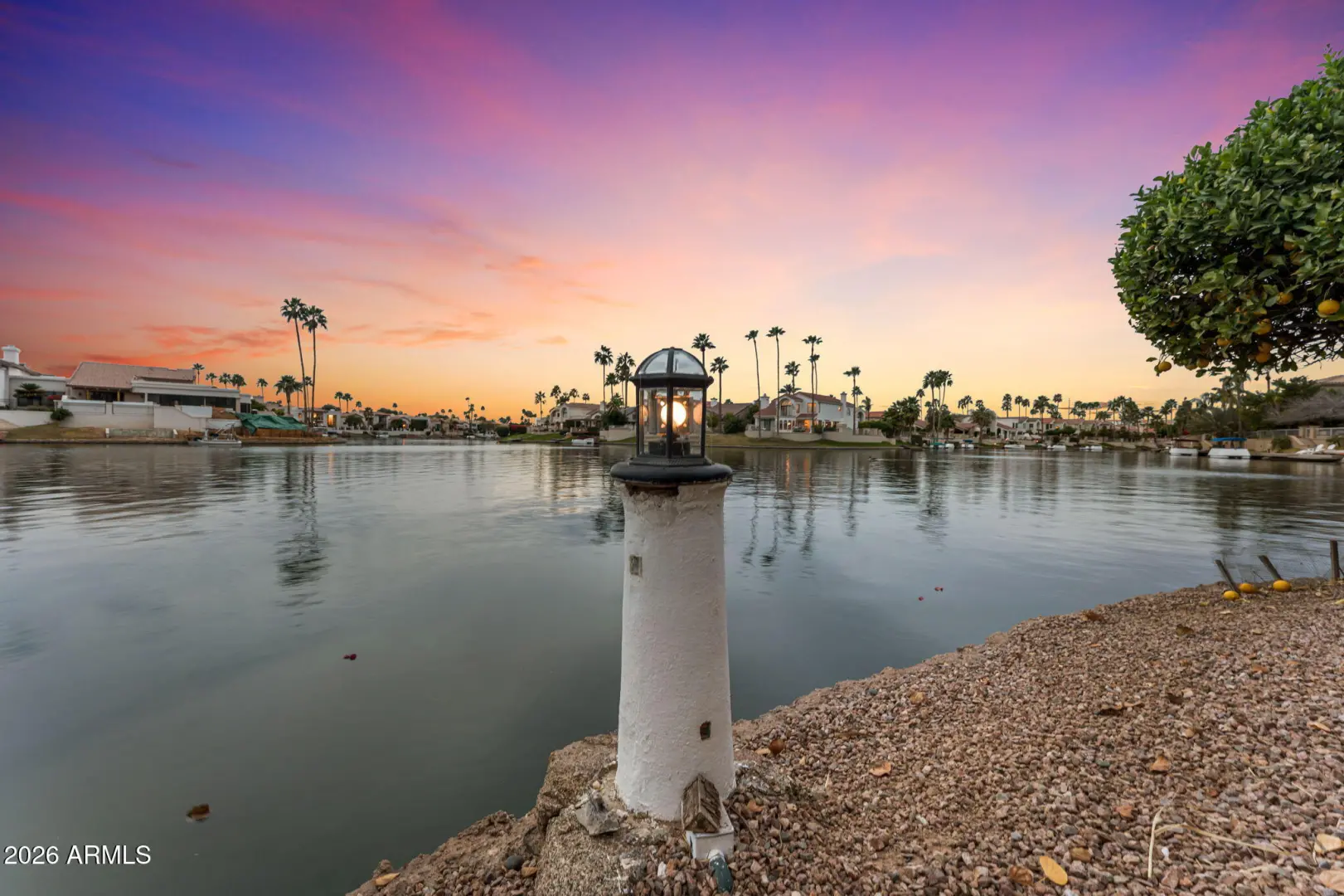 This rare waterfront peninsula property is ready to be yours! It sits peacefully along the water in coveted Monterey Point an intimate gated community in Scottsdale Ranch. This bright and thoughtfully designed layout has vaulted ceilings, 3 large sliders to the expansive manicured outdoor space with a private pool, aluminum view fence, lake, private dock, mature lemon tree and it's very own lighthouse. Freshly painted interior/exterior and is situated on a 14,500 sqft lot as it enjoys a premier setting on Lake Serena, a stunning 42-acre man-made lake where you can enjoy fishing and boating with scenic mountain views. The mesmerizing waterfront views from all directions steal the show, creating a dramatic yet serene backdrop for daily living. Move in ready or ready for a fresh vision..