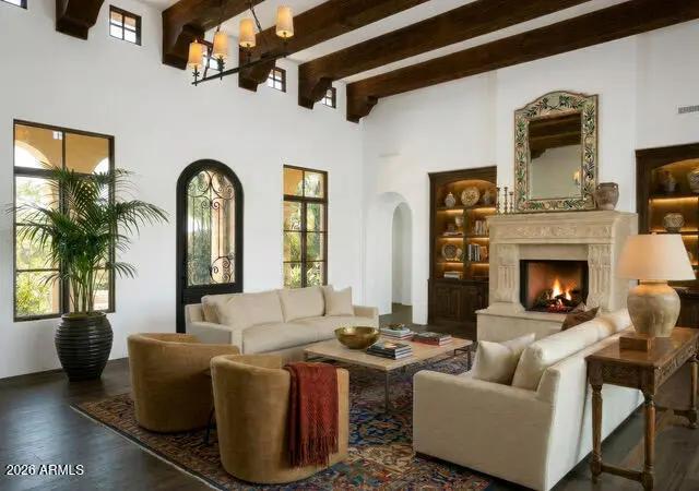 This timeless styled Spanish Colonial home rests in guard gated Windy Walk Estates has just been updated and has stunning views of Pinnacle Peak, Troon Mountain and city lights. The luxurious home is all on one level except for a large 875/sf 2nd level game/bedroom with its own fireplace, full bath and balcony overlooking city light views. You enter the main home through a hand forged iron gate into a charming front courtyard with bubbly fountain. The iron front door opens to the formal living and dining areas with rough sawn beams and stone fireplace. 3 bedrooms on the main level plus an office. The large family room opens to the kitchen and includes a corner fireplace, walk-up wet bar with ice maker, dishwasher, Sub-Zero wine and beverage drawers, and plenty seating area plus room for...
