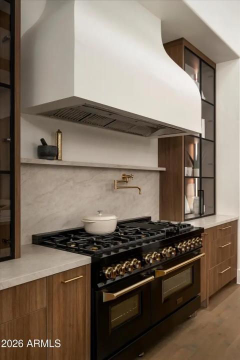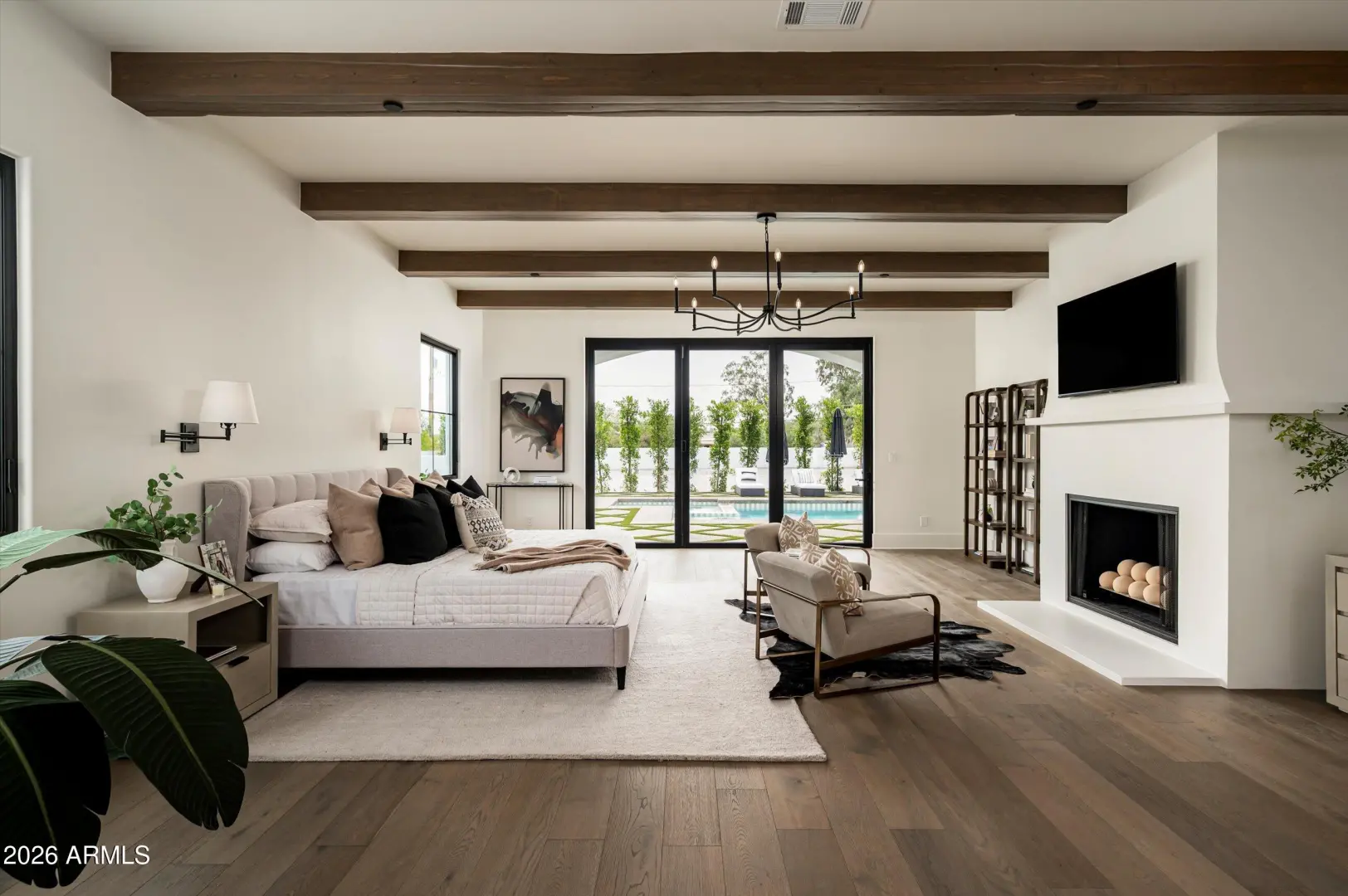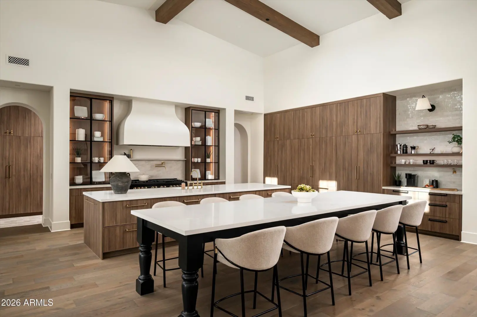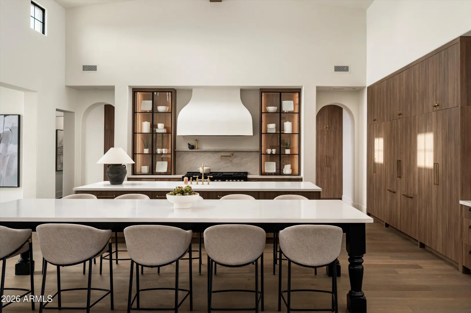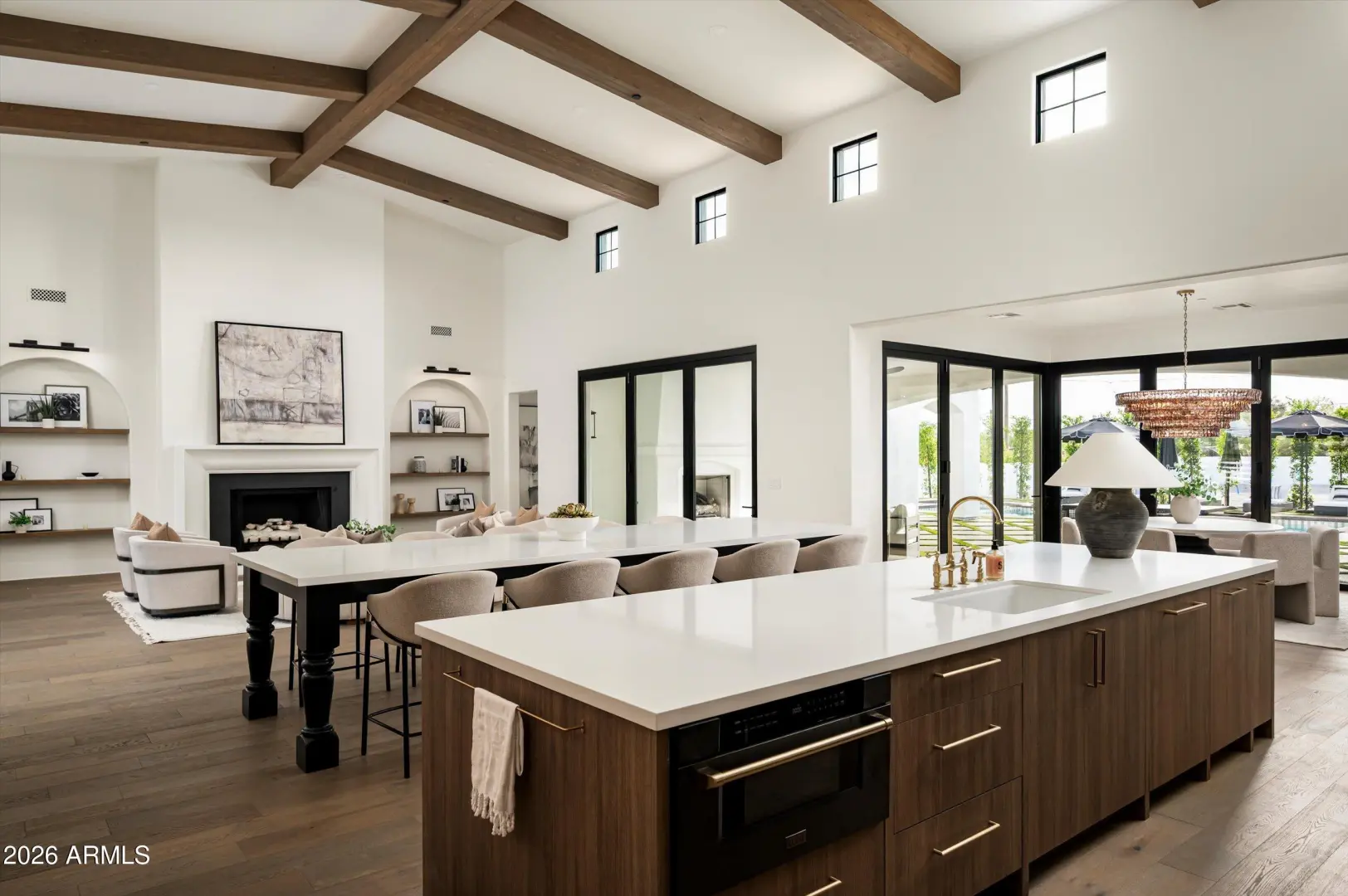 A modern Santa Barbara estate set across a full acre, where scale, light, and architecture come into quiet alignment. Volume is expressed through soaring 18-foot ceilings and expansive living spaces, while a softened palette of designer finishes brings warmth and balance to the structure. Five bedrooms unfold with intention, accompanied by a generous bonus room that adapts easily over time. Light moves deliberately through the home, tracing clean lines and shaping a rhythm that feels both open and composed.At its center, the kitchen and great room form a natural gathering space, defined by wood beam detail and a measured sense of proportion.A wall of glass dissolves the boundary to the outdoors, where a covered patio, outdoor kitchen and pool & spa extend the experience into the landscape