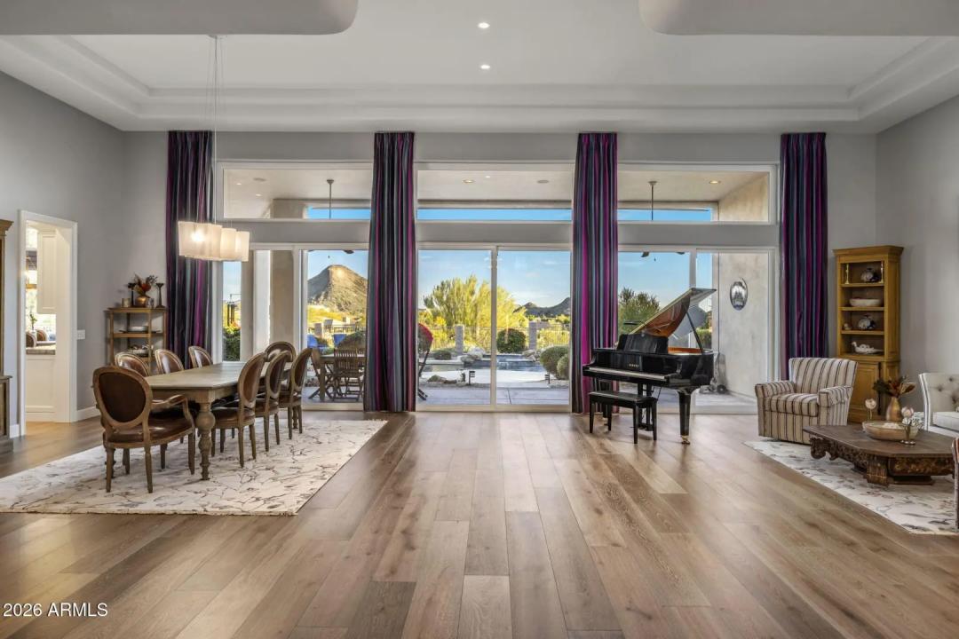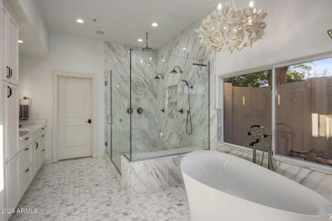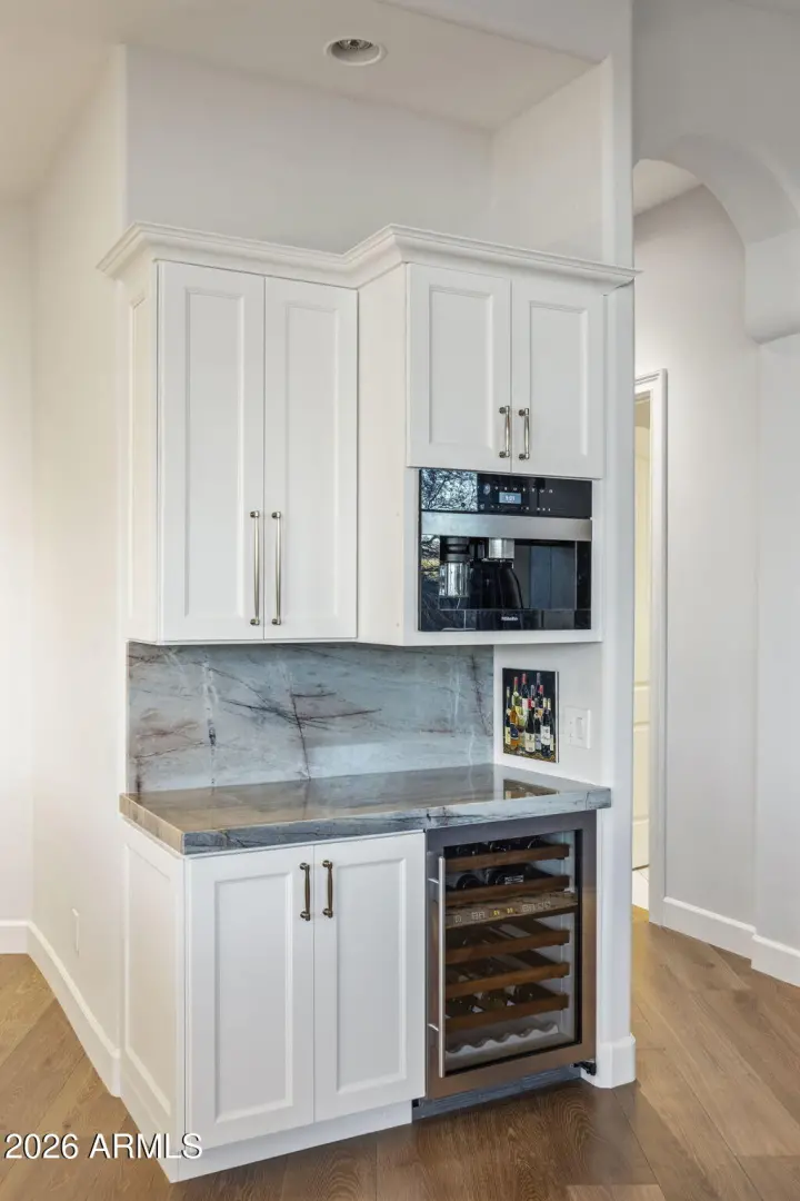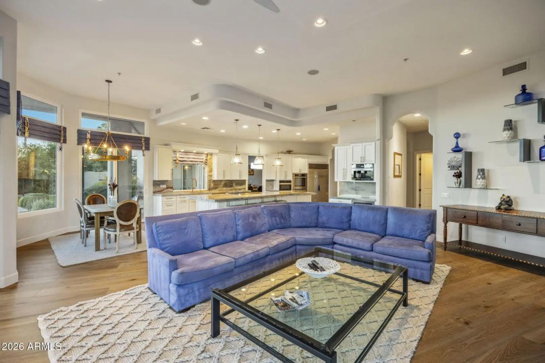 Elevated living, panoramic views and an ideal location set the stage for a sophisticated Scottsdale lifestyle. Nestled in the prestigious gated community of Sabino Estates, this updated single-level residence captures breathtaking McDowell Mountain panoramas and twinkling city lights, backing to an expansive canyon wash for exceptional privacy on a premium homesite with southern exposure. Timeless finishes - highlighted by rare Italian Calacatta marble and engineered wide-plank wood flooring - complement an open, light-filled interior with soaring 12ft ceilings and expansive tinted windows that frame serene desert vistas. The gourmet kitchen welcomes gatherings around a striking oversized Ljen Blue quartzite island with seating, and paired with professional-grade Miele appliances for