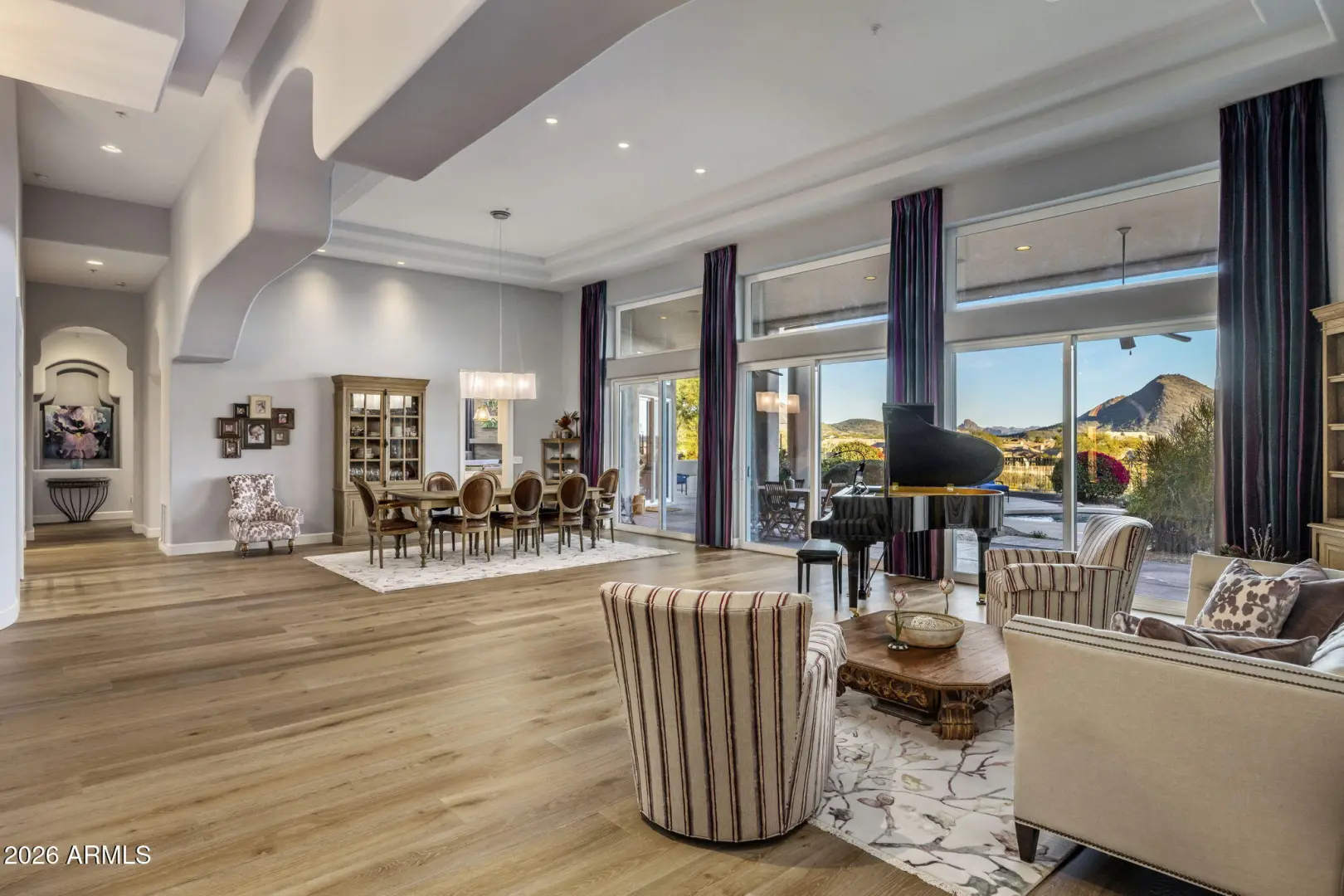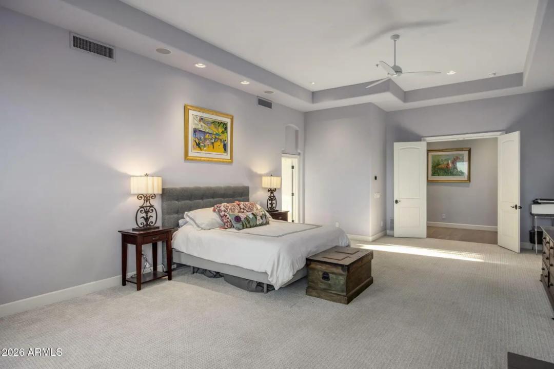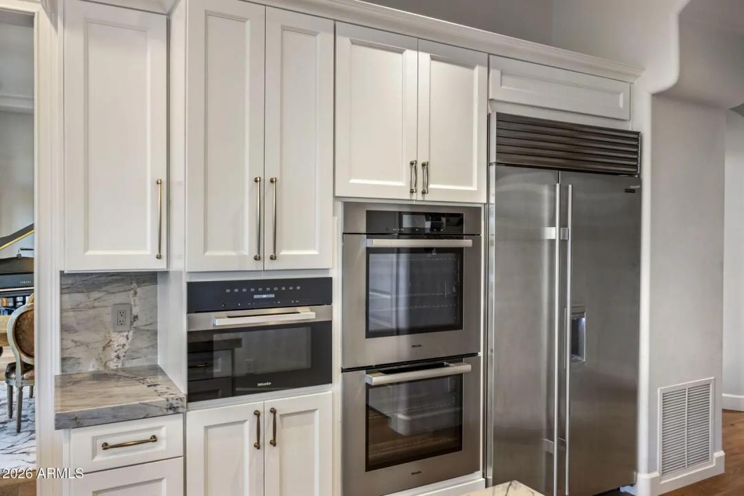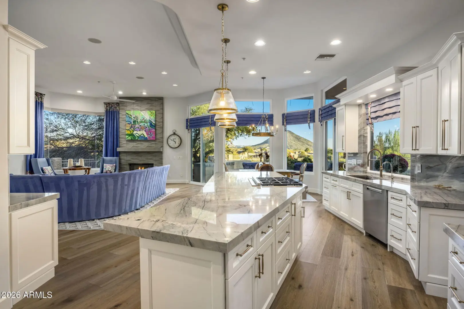Elevated living, panoramic views and an ideal location set the stage for a sophisticated Scottsdale lifestyle. Nestled in the prestigious gated community of Sabino Estates, this updated single-level residence captures breathtaking McDowell Mountain panoramas and twinkling city lights, backing to an expansive canyon wash for exceptional privacy on a premium homesite with southern exposure. Timeless finishes - highlighted by rare Italian Calacatta marble and engineered wide-plank wood flooring - complement an open, light-filled interior with soaring 12ft ceilings and expansive tinted windows that frame serene desert vistas. The gourmet kitchen welcomes gatherings around a striking oversized Ljen Blue quartzite island with seating, and paired with professional-grade Miele appliances for
