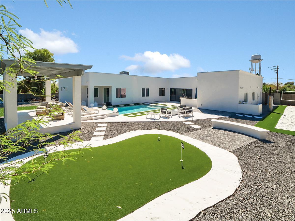 WELCOME TO YOUR OASIS IN THE HEART OF THE CACTUS CORRIDOR NEWLY BUILT ESTATE OF MODERN LUXURY, COMPLETED 2022 EXPANSIVE ALMOST 1-ACRE LOT FEELS LIKE 2 ACRES -NO HOA , A++ LOCATION MINUTES AWAY KIERLAND COMMONS- SCOTTSDALE QUARTER! HIGHLIGHTS: MAIN HOUSE: 4 SPACIOUS BEDROOMS PLUS AN OFFICE, 5 BATHS-HUGE MASTER 1500SQ FT -2 CLOSETS 400 BOTTLE CUSTOM WINE CLOSET-AUTOMATED BLINDS-EAST BACKYARD VIEWS MCDOWELLS MOUNTAINS -QUIET DEAD END STREET! ATTACHED 2024 GUEST HOUSE : 2-BEDROOM, 1-BATH-FULL GOURMET KITCHEN - LAUNDRY. PERFECT FOR GUESTS OUTDOOR PARADISE. $500K LOOK! OVER$100K WHITE MARBLE DECKING - SALT WATER POOL-LARGE GAZEBO-PICKLEBALL-SPORT COURT-TURF SOCCER FIELD WITH GOALS-PUTTING GREEN-WHITE SAND BEACH VOLLEYBALL AVAILABLE FOR LEASE PURCHASE AT $4,500,000.OR $25K MO UNFURNISED