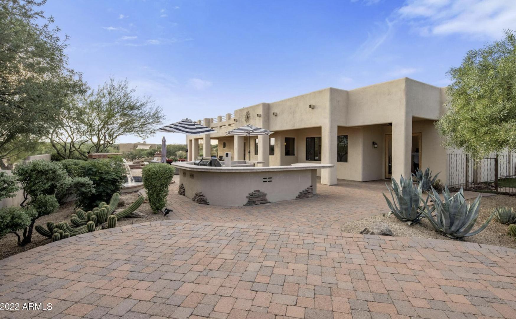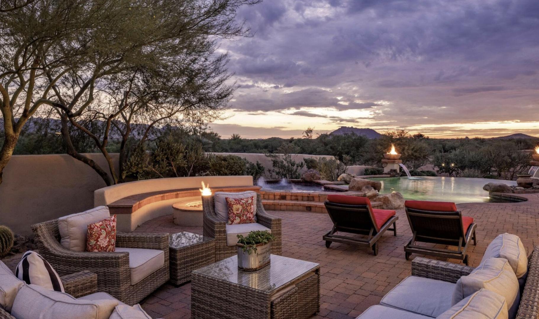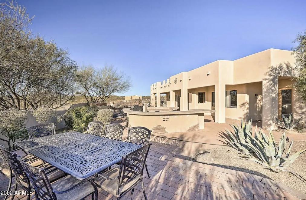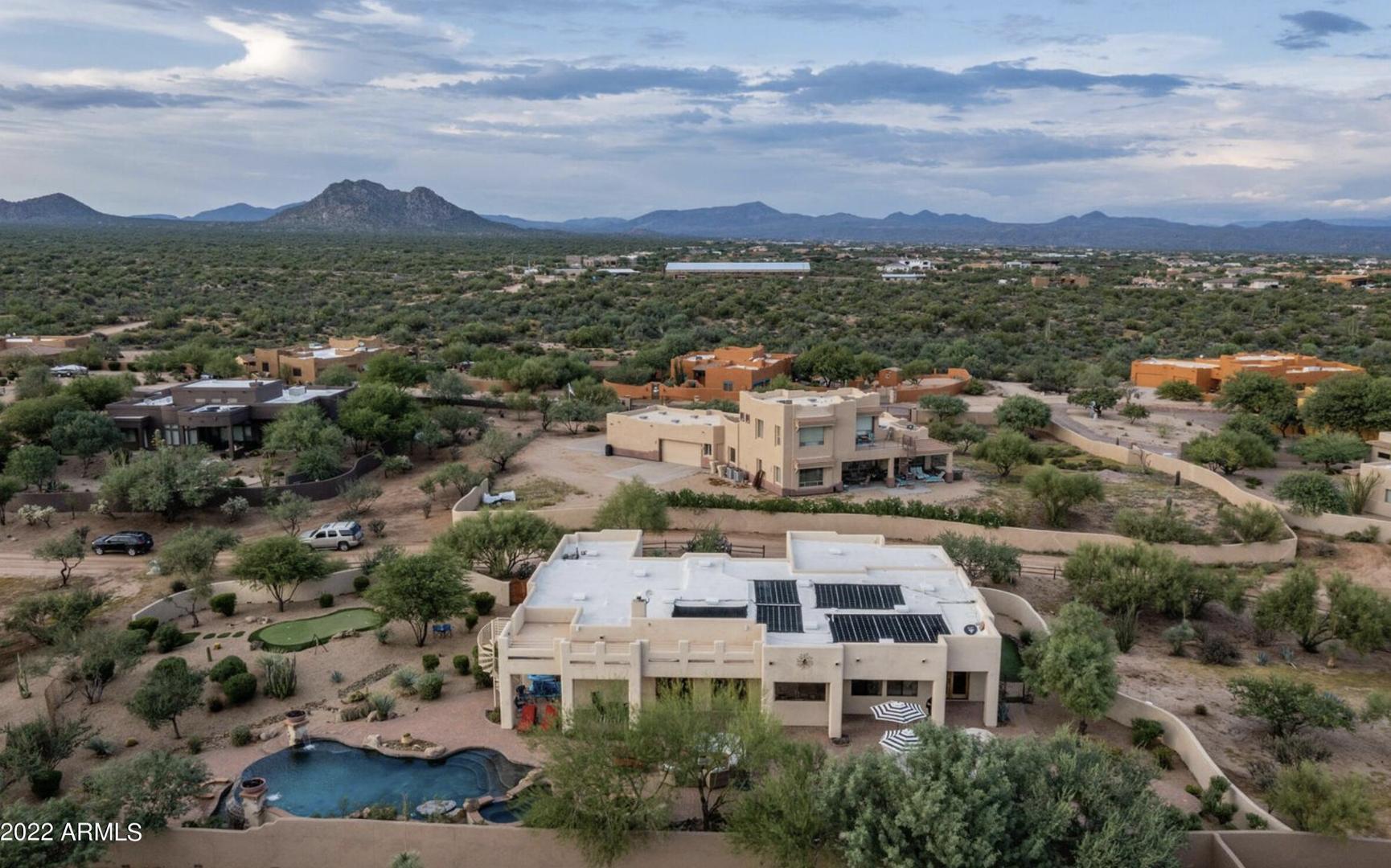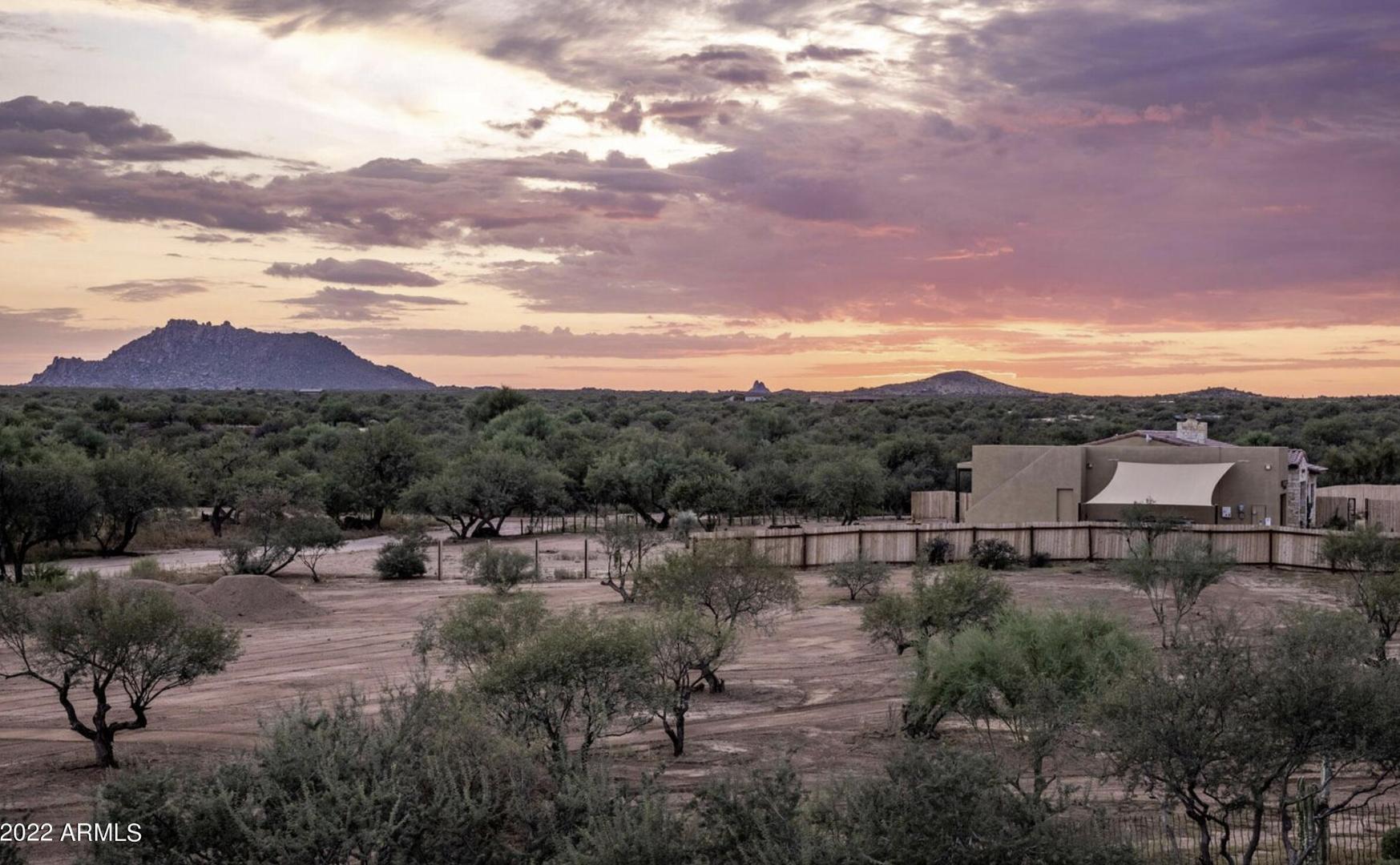 Spectacular mountain and sunset views define this outstanding No HOA horse property. Professionally furnished and truly suitcase ready, this home is an exceptional opportunity for those seeking a high-performing Arizona investment or a private vacation retreat. Designed for effortless indoor-outdoor living, the gorgeous low-maintenance backyard offers exceptional privacy and features an oversized paver patio, multiple fire features, putting green, rooftop view deck, and a professional-grade built-in BBQ. The flexible floor plan includes 4 bedrooms, 4 bathrooms, a dedicated office that could easily serve as a 5th bedroom, plus an additional office or nursery space connected to the primary suite. With ideal north-south exposure and thoughtfully designed living spaces throughout, this
