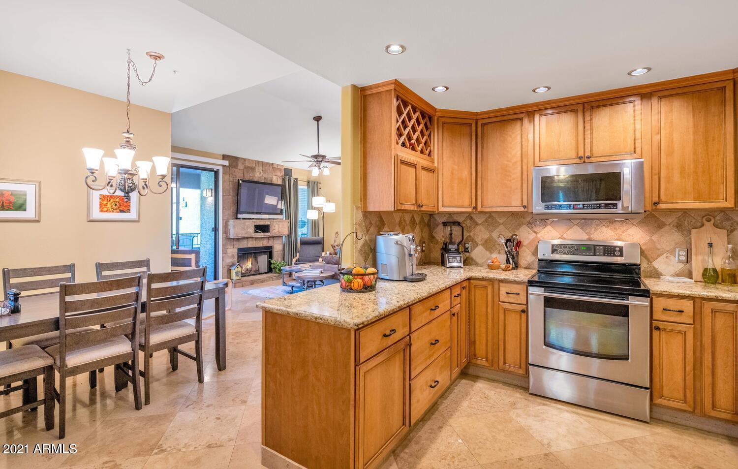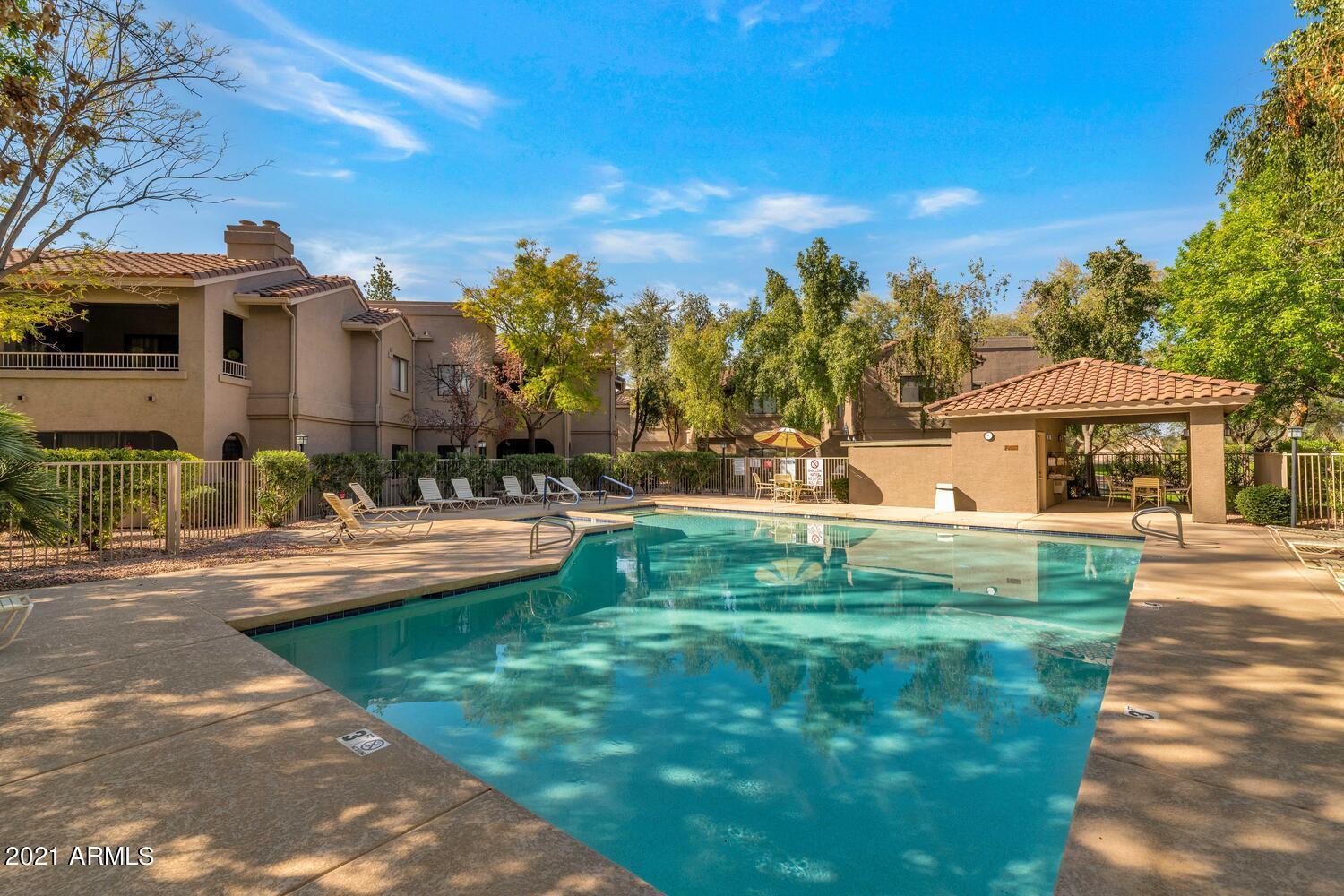 Attractive and convenient Scottsdale Condo/Townhome with a spacious well-lit office, 2 bedrooms and 2 baths. Move-in date flexible. Beautifully upgraded, well-maintained interior with impressive stone fireplace, well-appointed split bedroom layout and a fluid, open floor plan. Offers both privacy and room for gathering of friends and family. Gourmet kitchen highlighted by granite counters, stainless steel appliances, abundant cabinetry for added storage and a custom backsplash. Master includes en suite with glass framed shower. Enjoy morning coffee and unwind with a beverage on the cozy tree-lined private patio at day's end. Storage area for bikes and seldom-used items. Walking pathways to AJ's, Flo's, Safeway, Pita Jungle and more. Gated community benefits include: nearby biking, hiking,