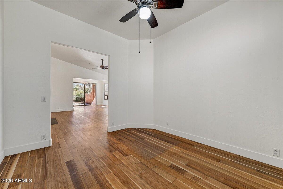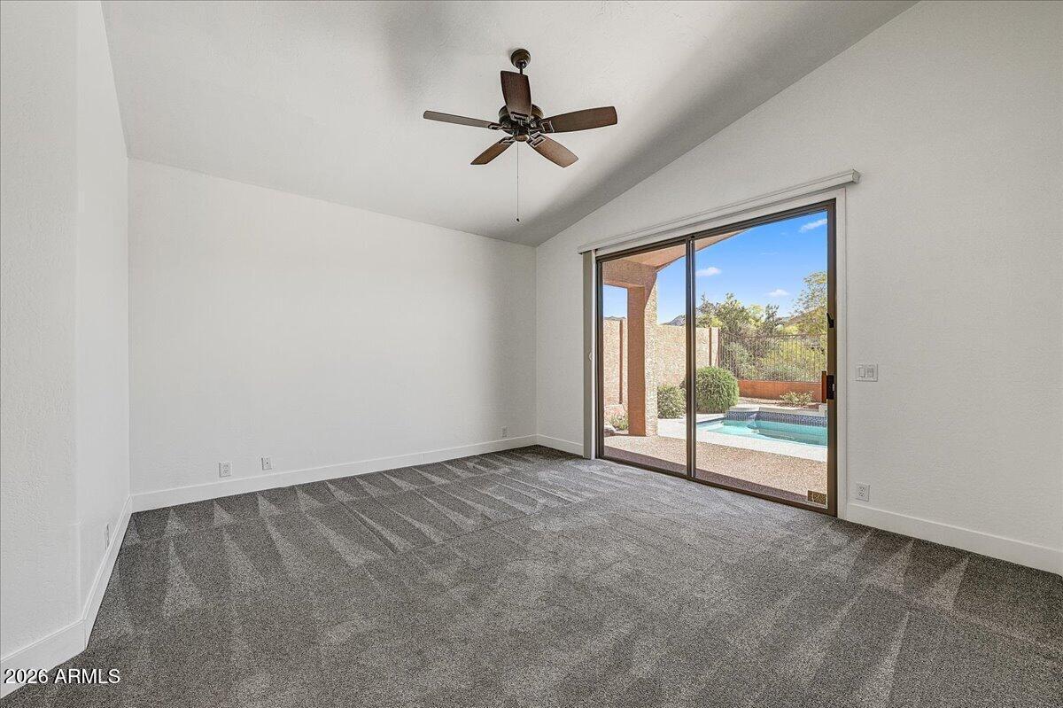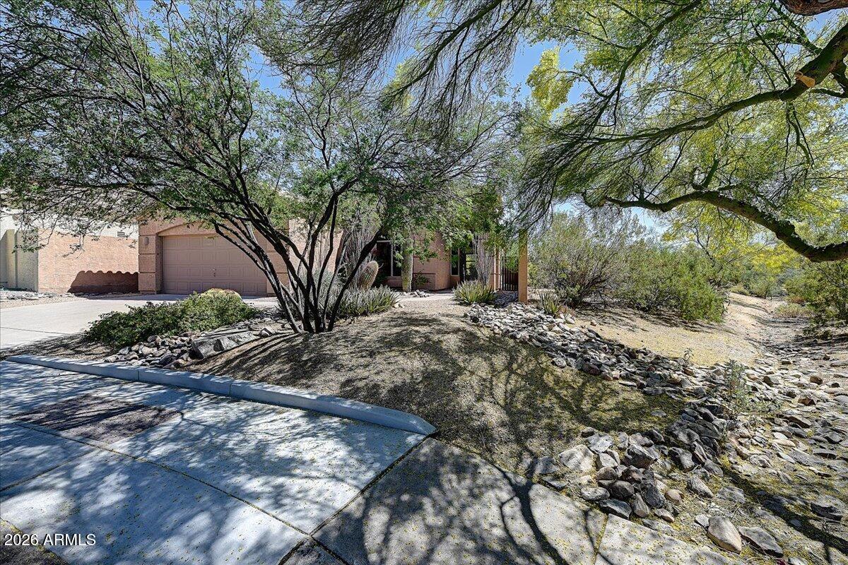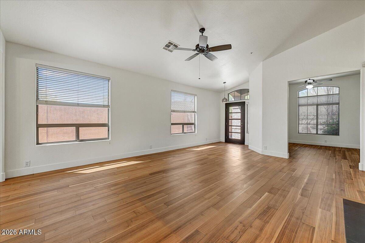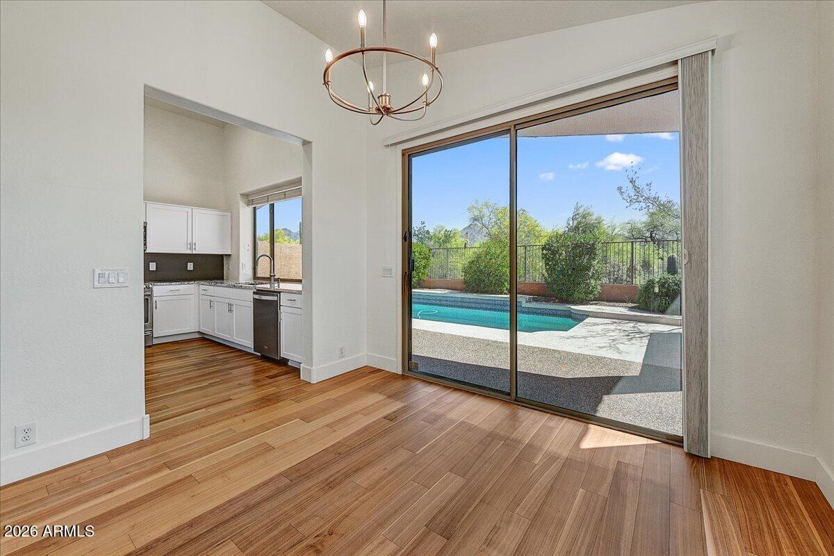 Stunning 2-bed + den home with elegant walnut flooring and a desirable split floor plan. Vaulted ceilings and abundant windows flood the space with light. Spacious primary suite and updated bathrooms with a walk-in shower and tub. Stylish kitchen features newer appliances, granite counters, and beautiful cabinetry. Enjoy amazing mountain and pool views while you cook. A generous great room with a fireplace is perfect for entertaining. Resort-like backyard features a newly resurfaced pool, and the patio is ideal for morning coffee, with sunrise views over the McDowell Mountains. Best lot with open space surrounding the home. Prime location near top restaurants, shops, and the 101.