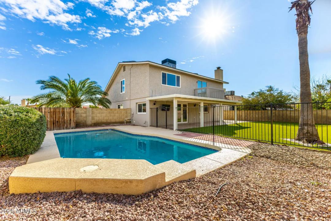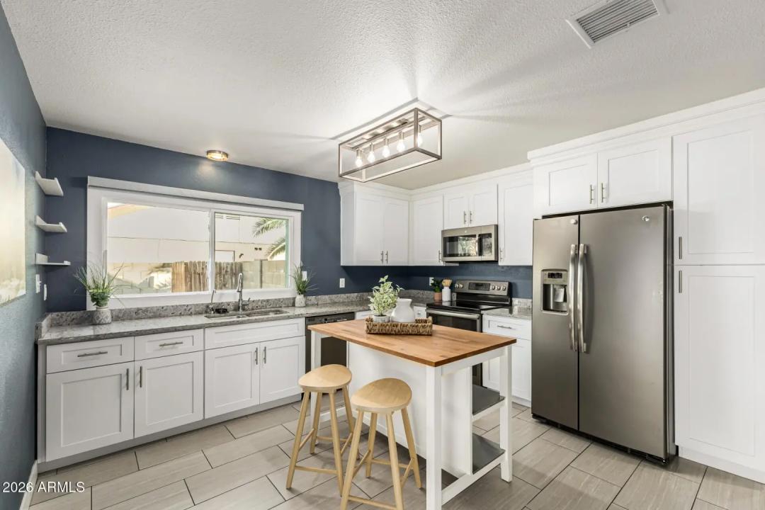 Welcome to Dobson Ranch to your next home designed for both everyday living and easy entertaining. You're greeted by double front doors that open to grand living room with exposed beams and 19' vaulted ceilings, flowing into a formal dining space. From there, the layout continues into the kitchen, filled with natural light from french doors to the patio and a large window overlooking the pool. The kitchen features modern white cabinetry and a removable island for additional storage. The adjacent family room offers a beautiful beehive fireplace and ample space for gatherings and movie nights. The laundry room has been enhanced with additional cabinetry and a folding counter, providing valuable extra storage and workspace.