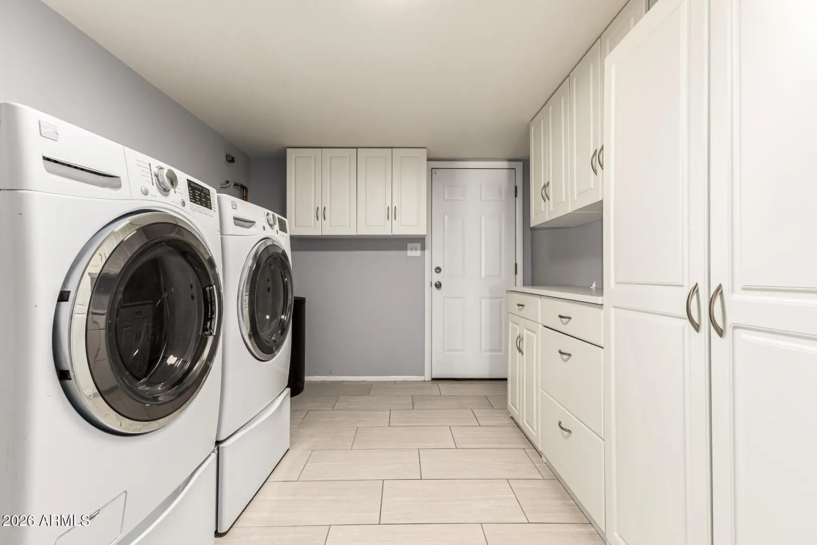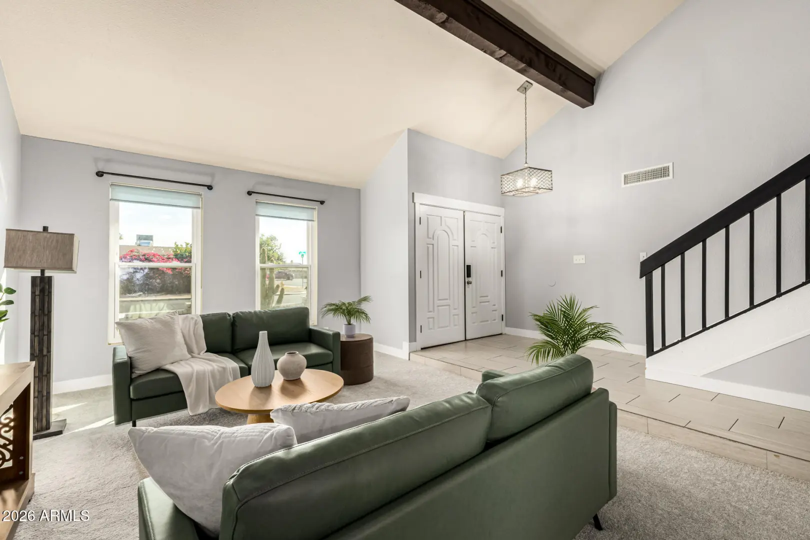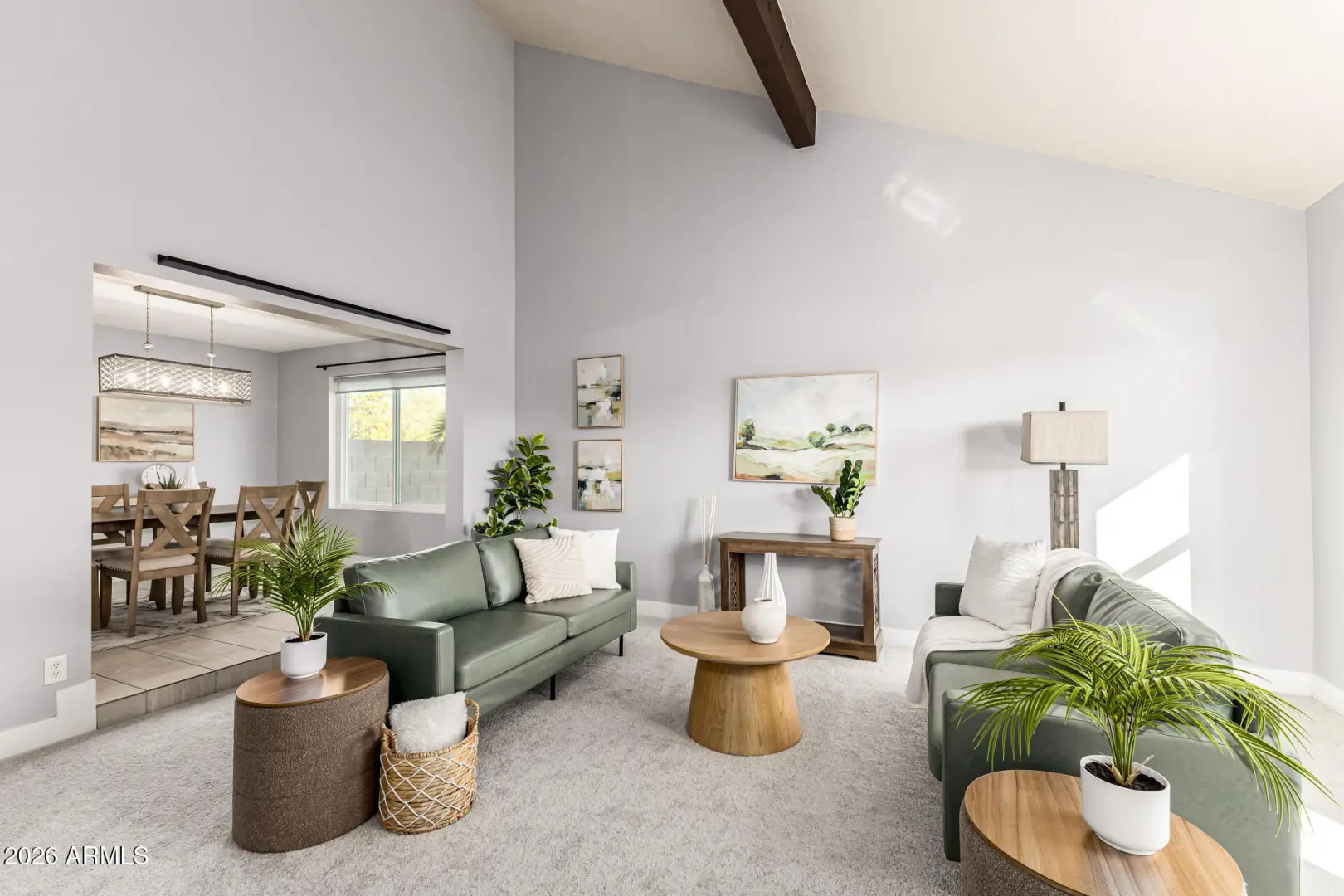 Welcome to Dobson Ranch to your next home designed for both everyday living and easy entertaining. You're greeted by double front doors that open to grand living room with exposed beams and 19' vaulted ceilings, flowing into a formal dining space. From there, the layout continues into the kitchen, filled with natural light from french doors to the patio and a large window overlooking the pool. The kitchen features modern white cabinetry and a removable island for additional storage. The adjacent family room offers a beautiful beehive fireplace and ample space for gatherings and movie nights. The laundry room has been enhanced with additional cabinetry and a folding counter, providing valuable extra storage and workspace.