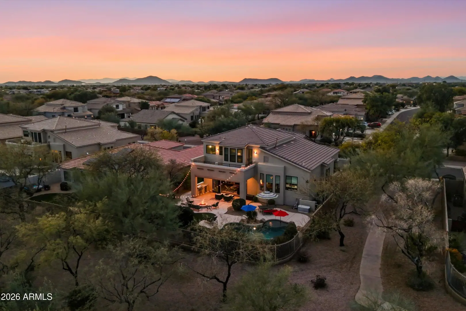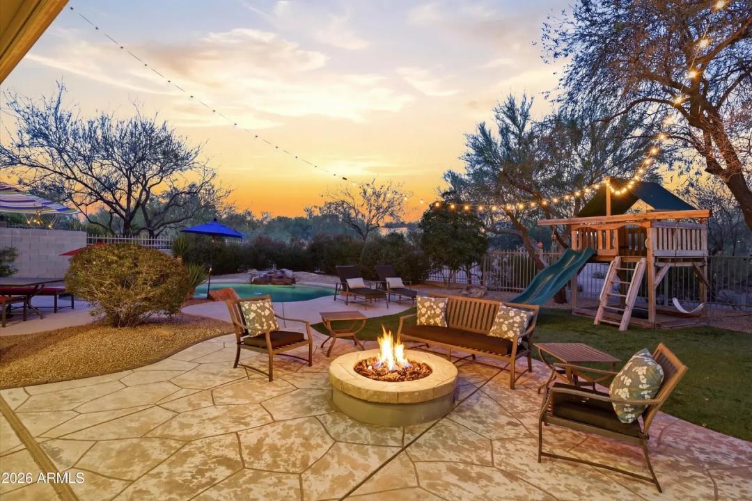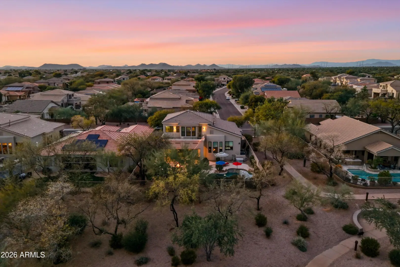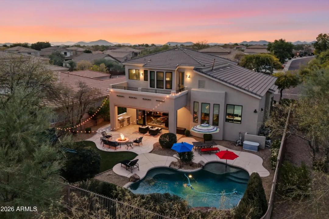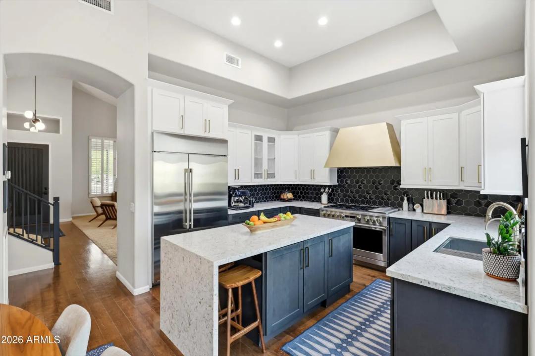 Thoughtfully remodeled by local mid-century modern designers, this Desert Ridge home is a rare find for buyers with a design eye. In a neighborhood where many homes feel similar, this one stands apart -- curated, cohesive, and architecturally expressive. The showpiece kitchen features waterfall quartz countertops, two-tone custom cabinetry, a statement vent hood, and designer lighting, all seamlessly connected to the dining and living areas for effortless entertaining. Soaring ceilings, real wood flooring, expansive floor to ceiling multi-slide glass doors, and a dramatic fireplace feature wall create light-filled spaces with exceptional indoor-outdoor flow.