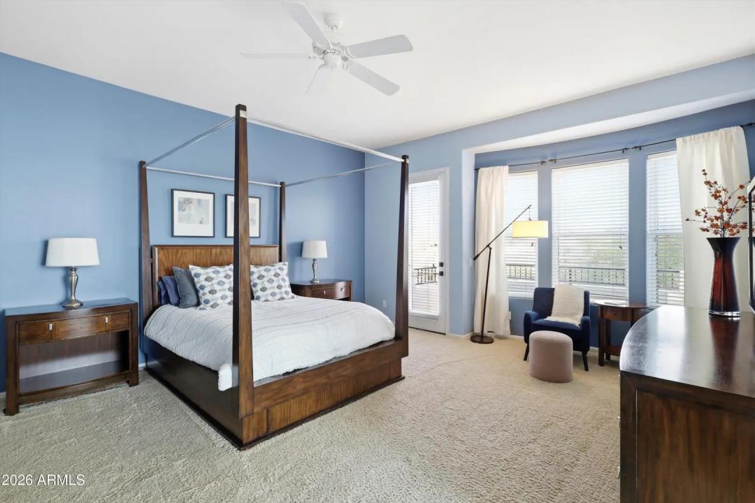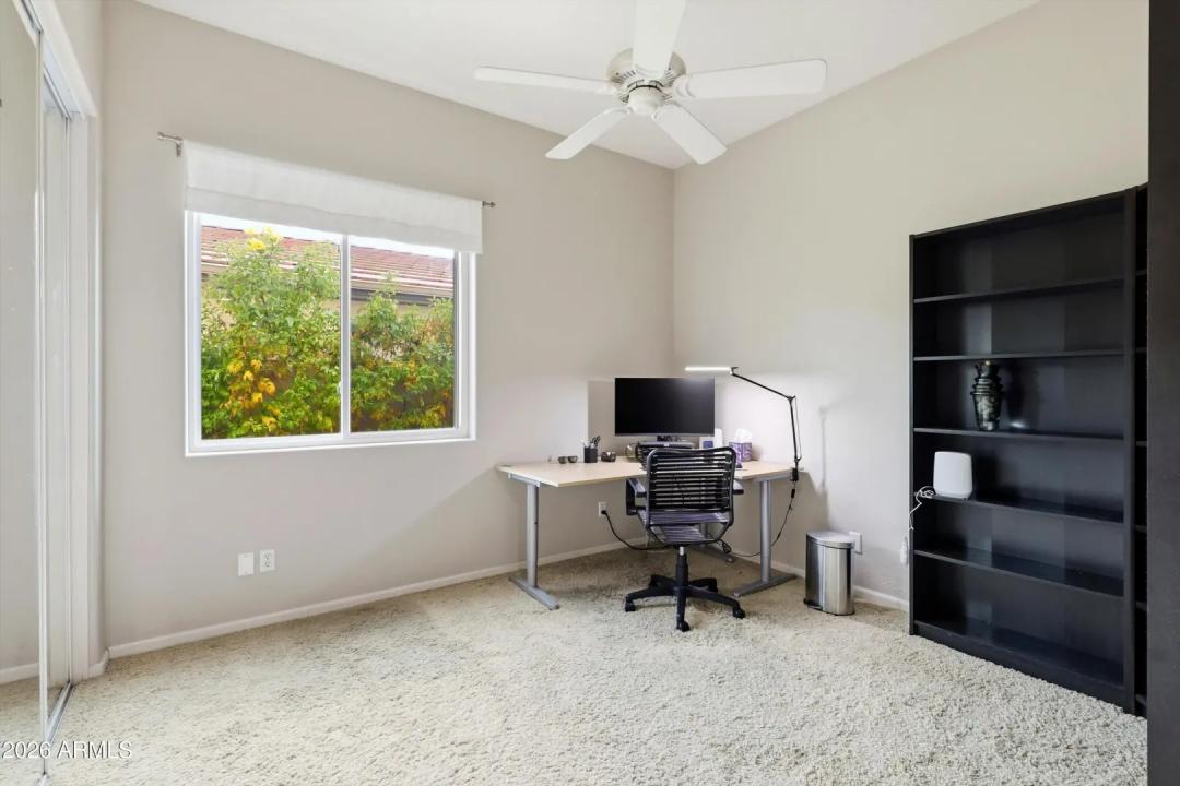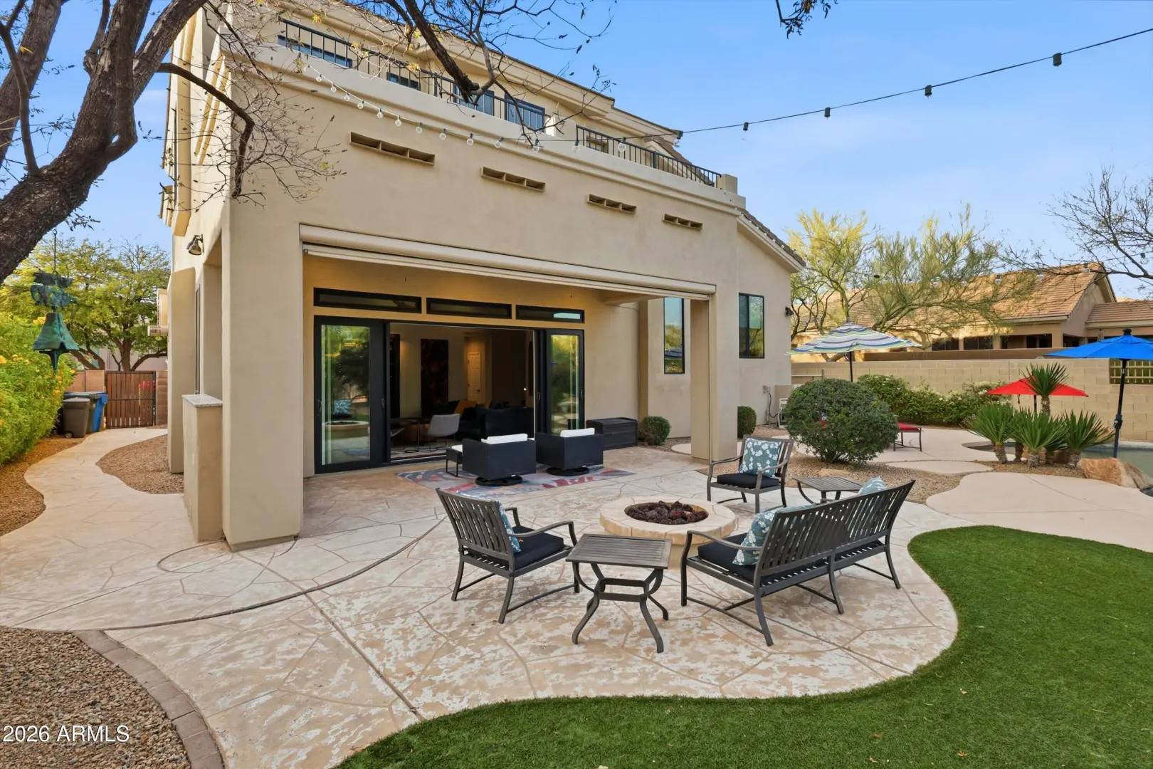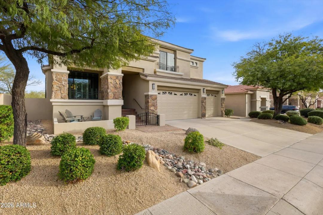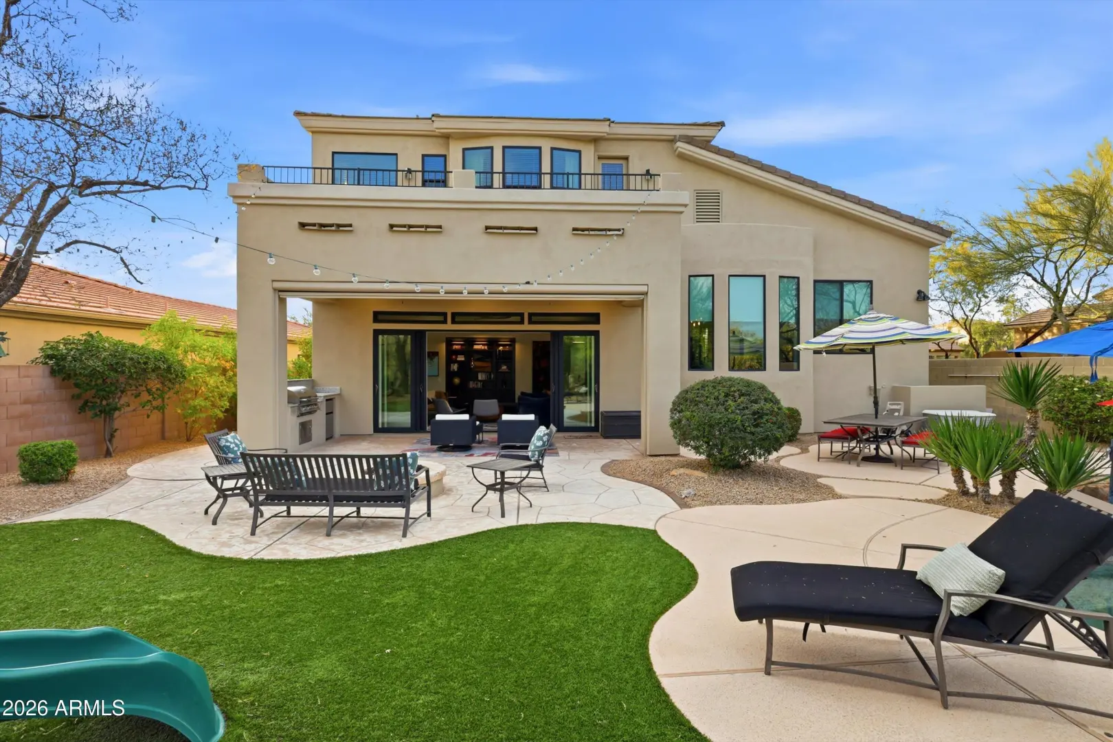 Thoughtfully remodeled by local mid-century modern designers, this Desert Ridge home is a rare find for buyers with a design eye. In a neighborhood where many homes feel similar, this one stands apart -- curated, cohesive, and architecturally expressive. The showpiece kitchen features waterfall quartz countertops, two-tone custom cabinetry, a statement vent hood, and designer lighting, all seamlessly connected to the dining and living areas for effortless entertaining. Soaring ceilings, real wood flooring, expansive floor to ceiling multi-slide glass doors, and a dramatic fireplace feature wall create light-filled spaces with exceptional indoor-outdoor flow.