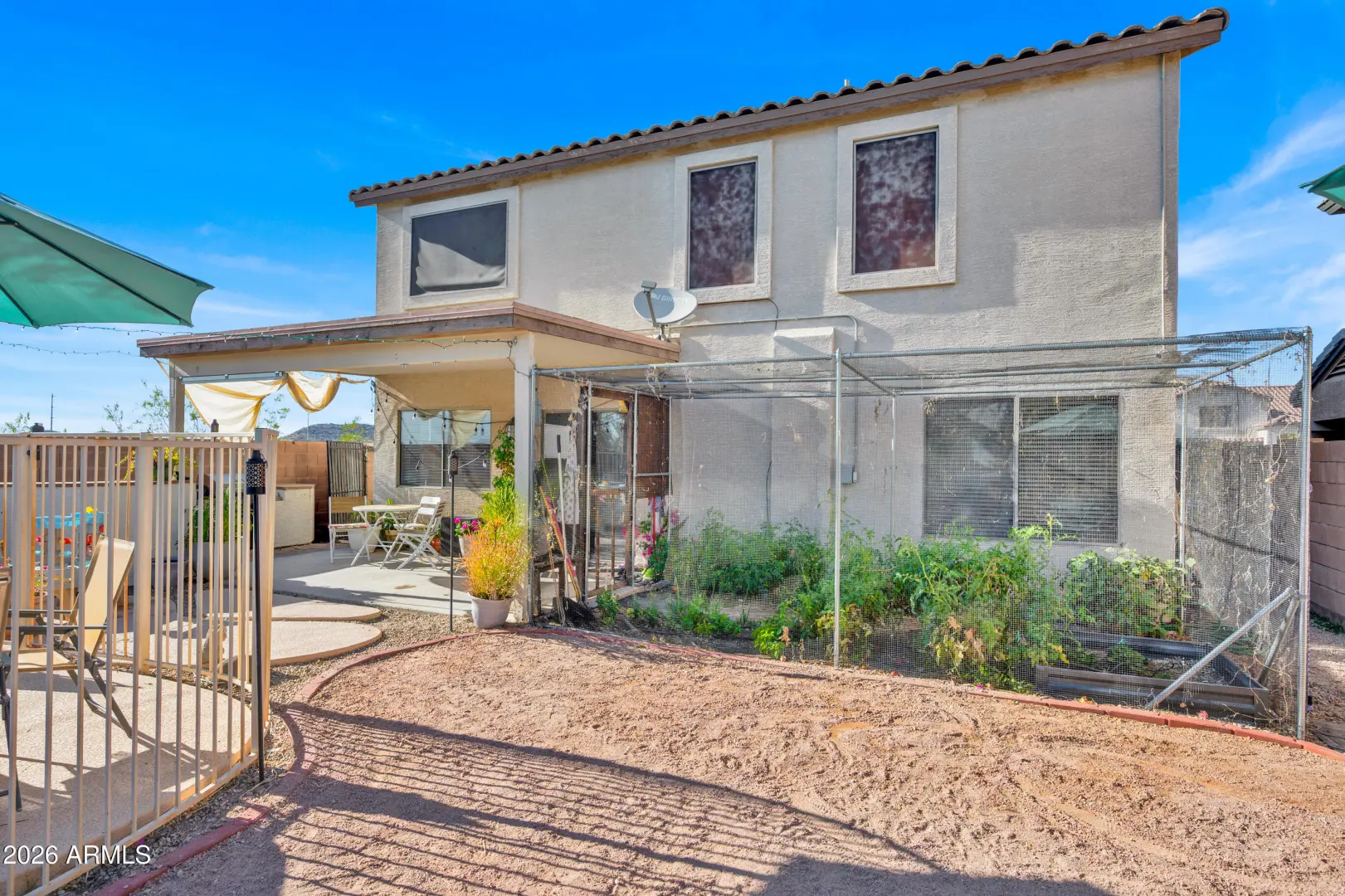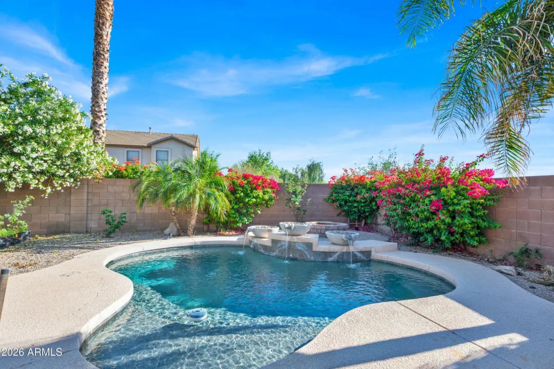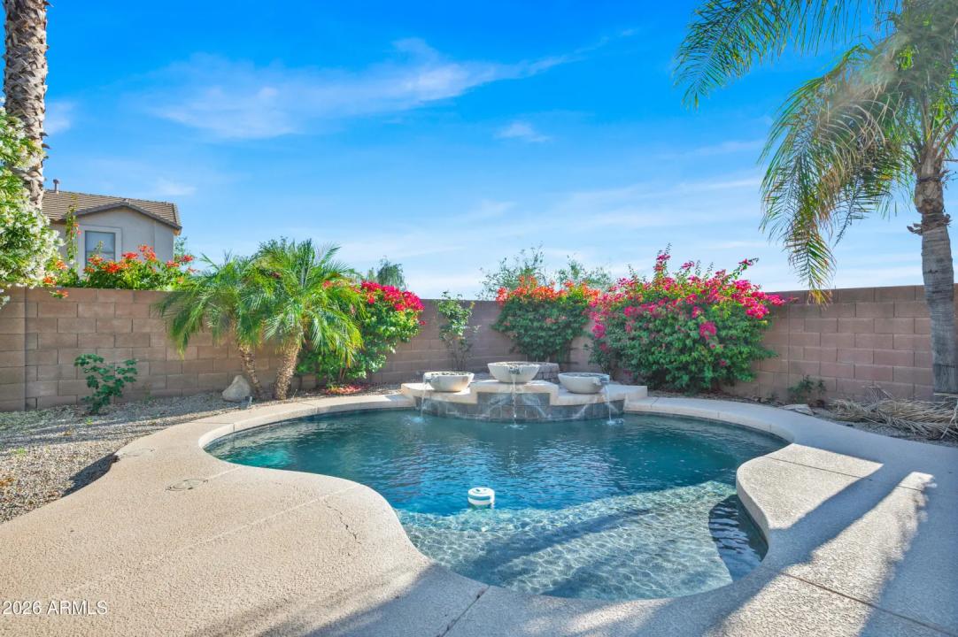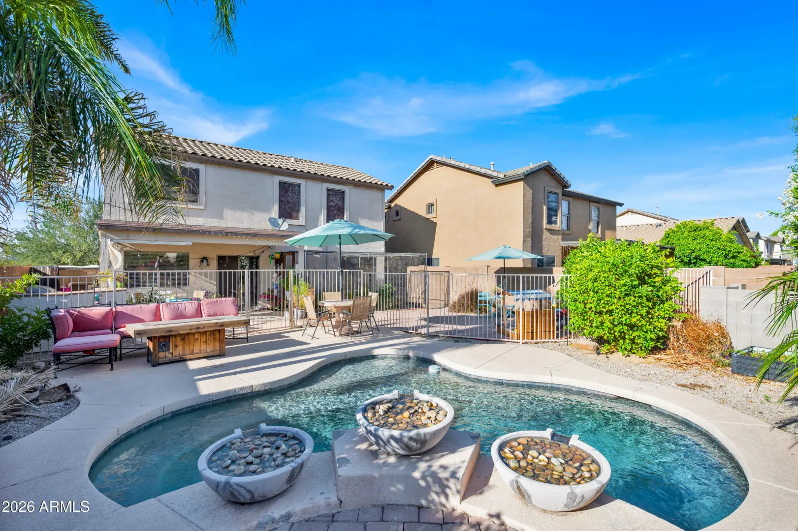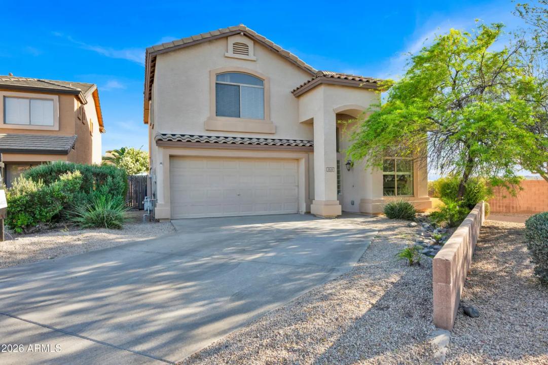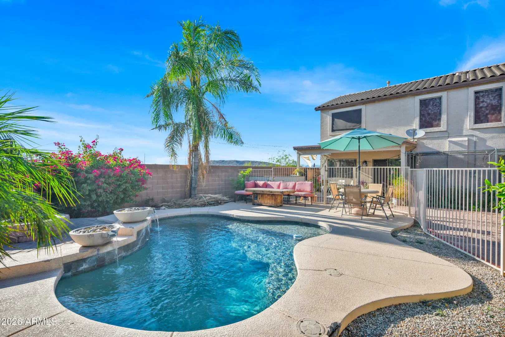 Beautiful move-in-ready 4-bedroom, 2.5-bath home with a fantastic floor plan featuring formal living and dining areas plus a spacious family room. The open kitchen offers an island, updated white cabinetry, stainless steel appliances, and a huge pantry. Upstairs, the large primary suite includes dual sinks, a separate tub and shower, and his-and-hers closets, while the secondary bedrooms are generously sized. The private backyard features a covered patio with surround sound, fenced spool, putting green, firepit, and BBQ/bar area for easy entertaining. Attached 2-car garage. Tucked at the end of a cul-de-sac for added privacy, with walking path and park access behind the home, and just minutes from Norterra, I-17, USAA, hiking trails, and Taiwan Semiconductor Manufacturing Company.