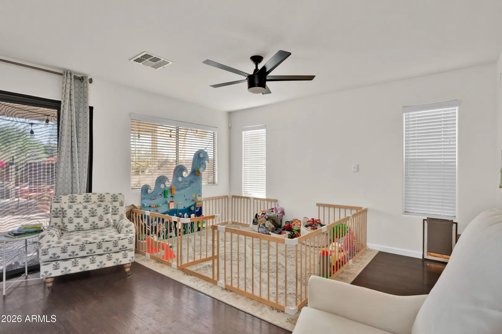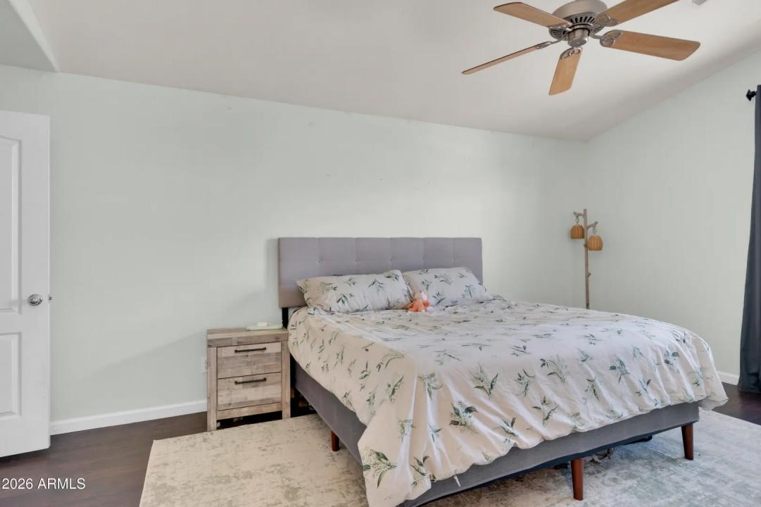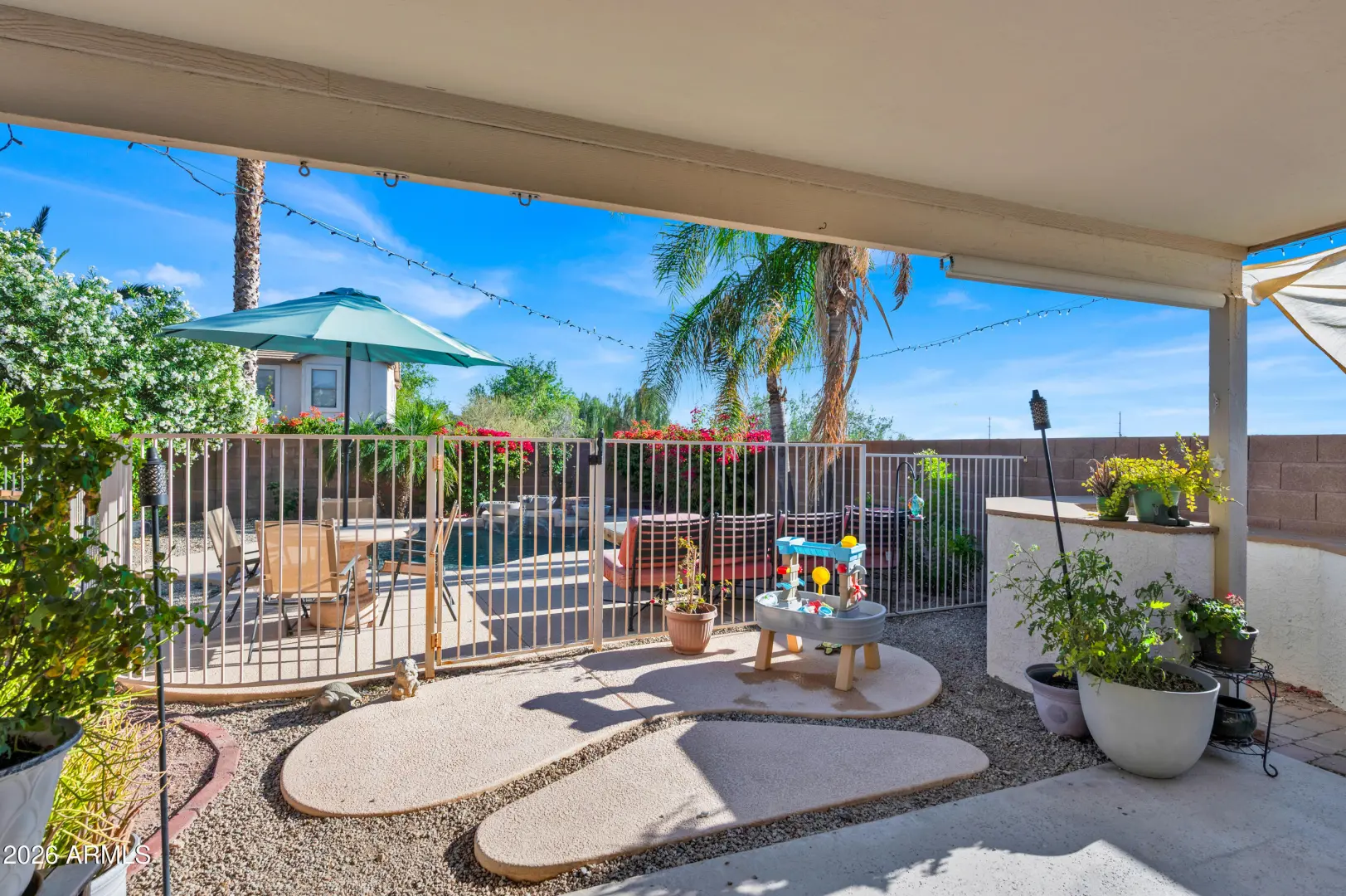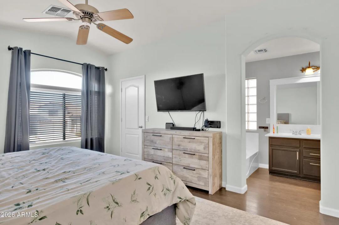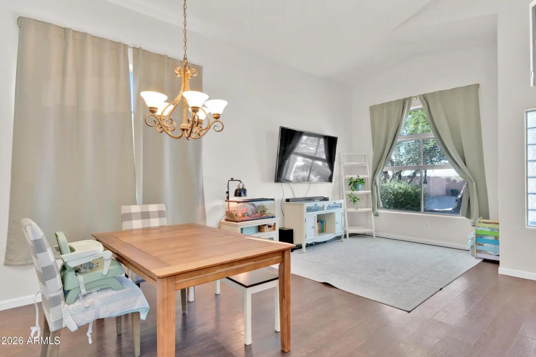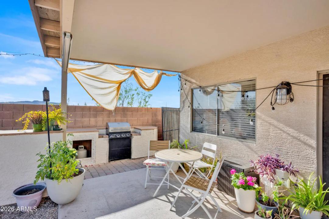 Beautiful move-in-ready 4-bedroom, 2.5-bath home with a fantastic floor plan featuring formal living and dining areas plus a spacious family room. The open kitchen offers an island, updated white cabinetry, stainless steel appliances, and a huge pantry. Upstairs, the large primary suite includes dual sinks, a separate tub and shower, and his-and-hers closets, while the secondary bedrooms are generously sized. The private backyard features a covered patio with surround sound, fenced spool, putting green, firepit, and BBQ/bar area for easy entertaining. Attached 2-car garage. Tucked at the end of a cul-de-sac for added privacy, with walking path and park access behind the home, and just minutes from Norterra, I-17, USAA, hiking trails, and Taiwan Semiconductor Manufacturing Company.