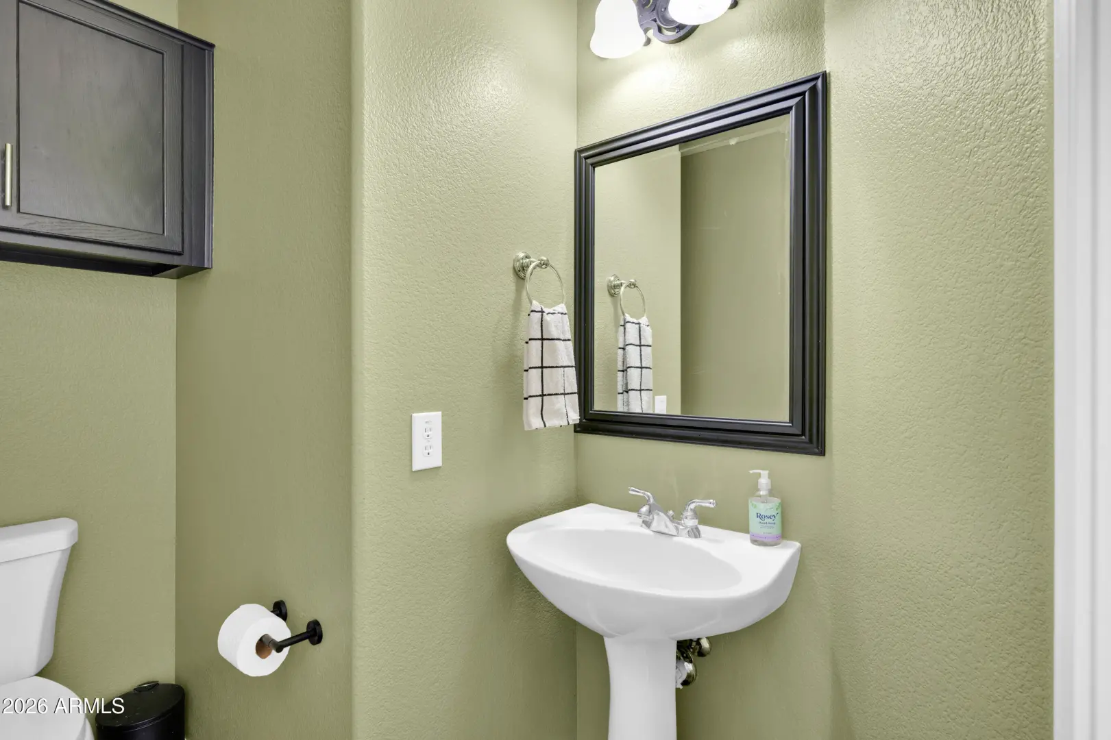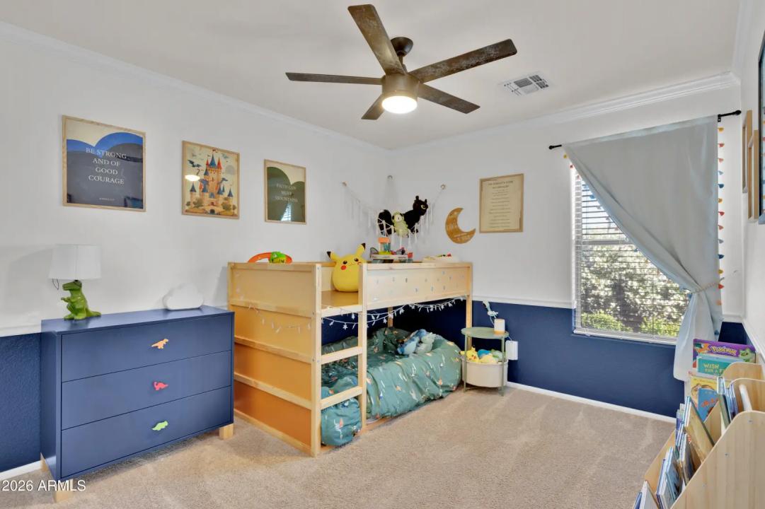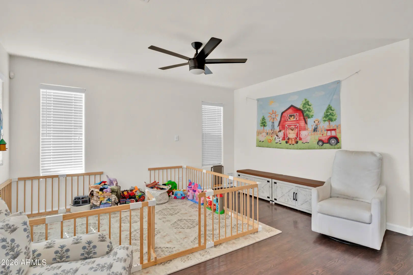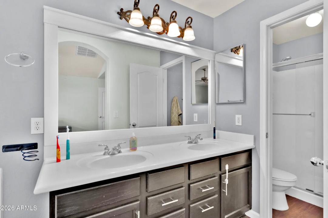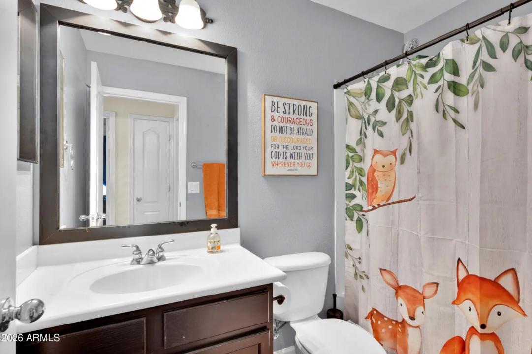 Beautiful move-in-ready 4-bedroom, 2.5-bath home with a fantastic floor plan featuring formal living and dining areas plus a spacious family room. The open kitchen offers an island, updated white cabinetry, stainless steel appliances, and a huge pantry. Upstairs, the large primary suite includes dual sinks, a separate tub and shower, and his-and-hers closets, while the secondary bedrooms are generously sized. The private backyard features a covered patio with surround sound, fenced spool, putting green, firepit, and BBQ/bar area for easy entertaining. Attached 2-car garage. Tucked at the end of a cul-de-sac for added privacy, with walking path and park access behind the home, and just minutes from Norterra, I-17, USAA, hiking trails, and Taiwan Semiconductor Manufacturing Company.