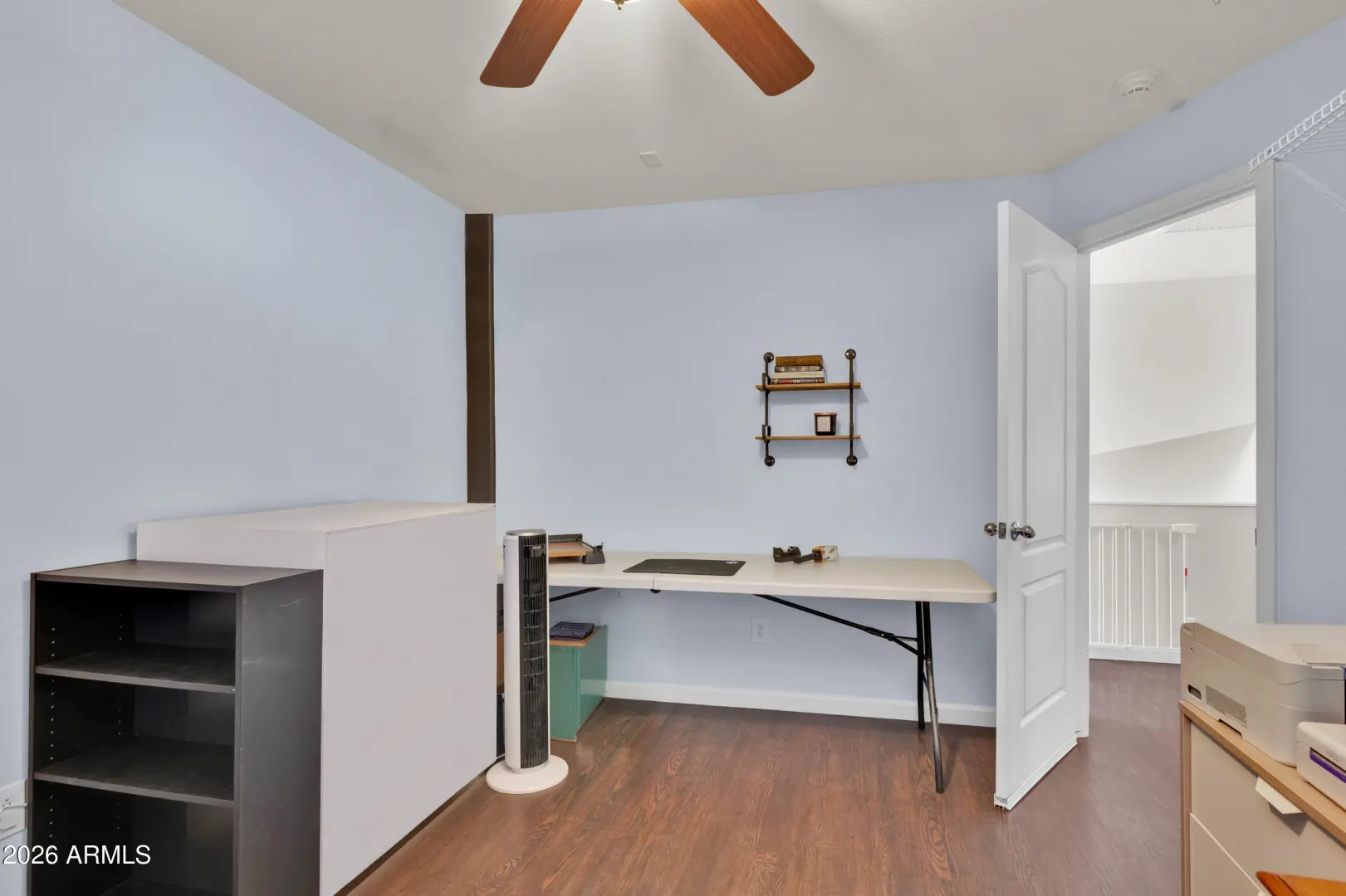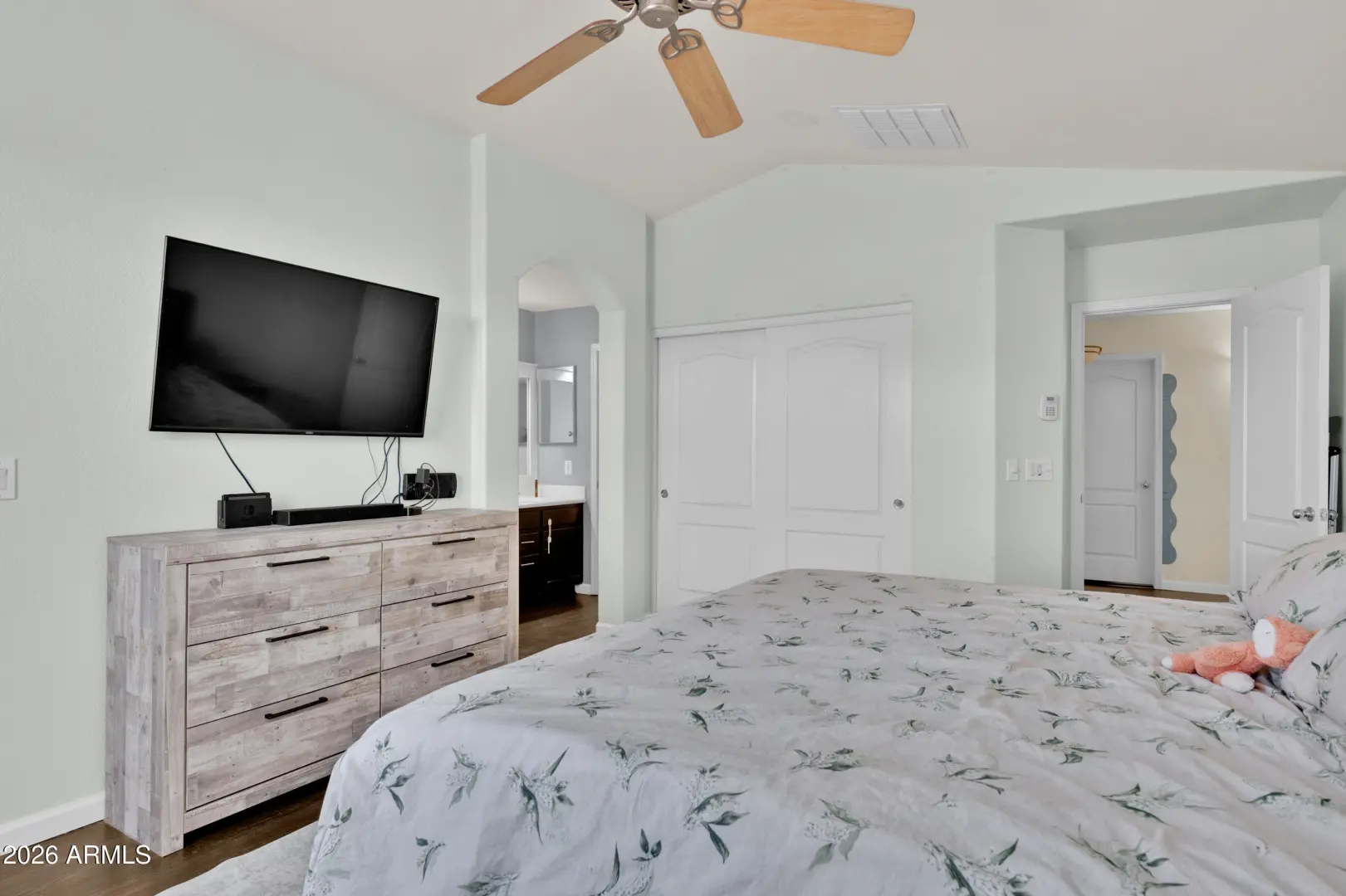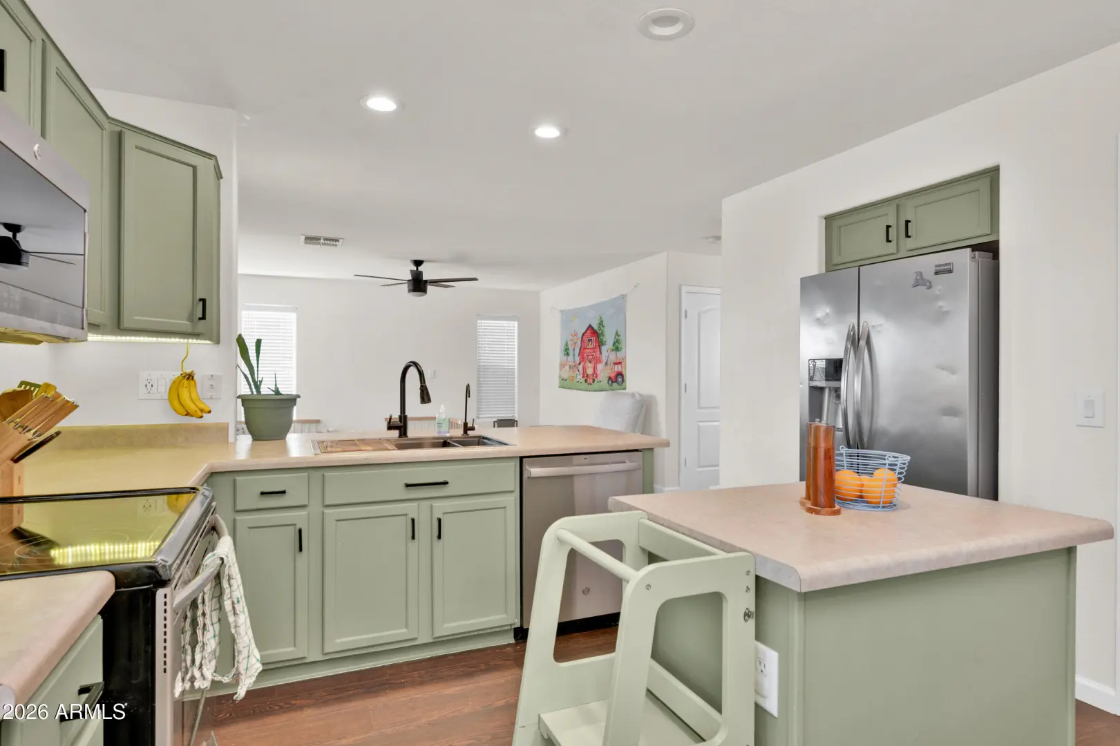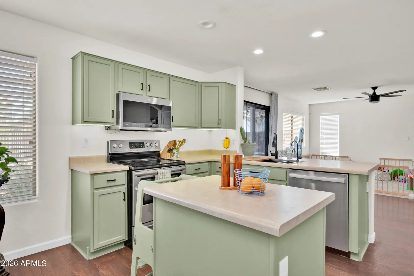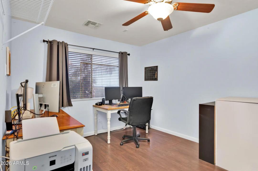 Beautiful move-in-ready 4-bedroom, 2.5-bath home with a fantastic floor plan featuring formal living and dining areas plus a spacious family room. The open kitchen offers an island, updated white cabinetry, stainless steel appliances, and a huge pantry. Upstairs, the large primary suite includes dual sinks, a separate tub and shower, and his-and-hers closets, while the secondary bedrooms are generously sized. The private backyard features a covered patio with surround sound, fenced spool, putting green, firepit, and BBQ/bar area for easy entertaining. Attached 2-car garage. Tucked at the end of a cul-de-sac for added privacy, with walking path and park access behind the home, and just minutes from Norterra, I-17, USAA, hiking trails, and Taiwan Semiconductor Manufacturing Company.