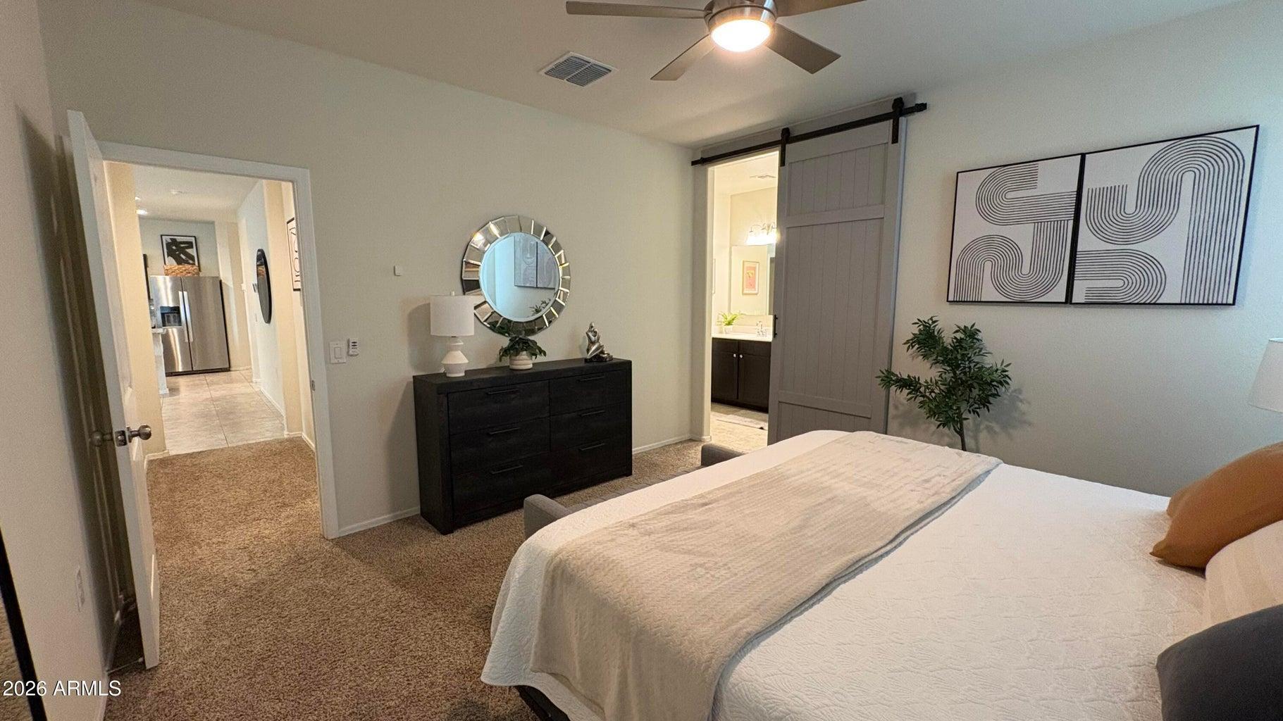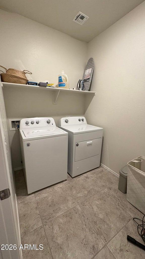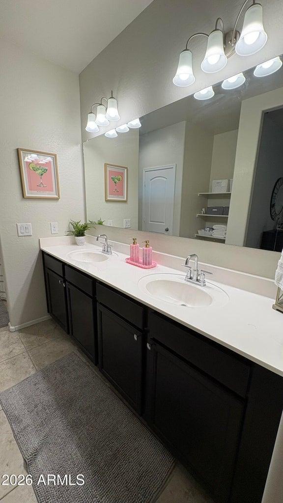 Welcome to the desirable Tartesso master-planned community in Buckeye. This well-maintained 4 bedroom, 2 bathroom furnished home features an open-concept living and kitchen area, ideal for comfortable living and entertaining. The kitchen offers a large center island, stainless steel appliances, granite countertops, tile backsplash, and ample pantry storage. Durable porcelain tile flooring runs throughout the main living areas and bathrooms. The private primary suite includes a custom barn door entry, walk-in closet, and en-suite bathroom with dual sinks. Secondary bedrooms are generously sized. The home features ceiling fans throughout and solar panels to help reduce energy costs. Enjoy the spacious backyard with covered patio, perfect for outdoor relaxation. Tartesso offers miles of