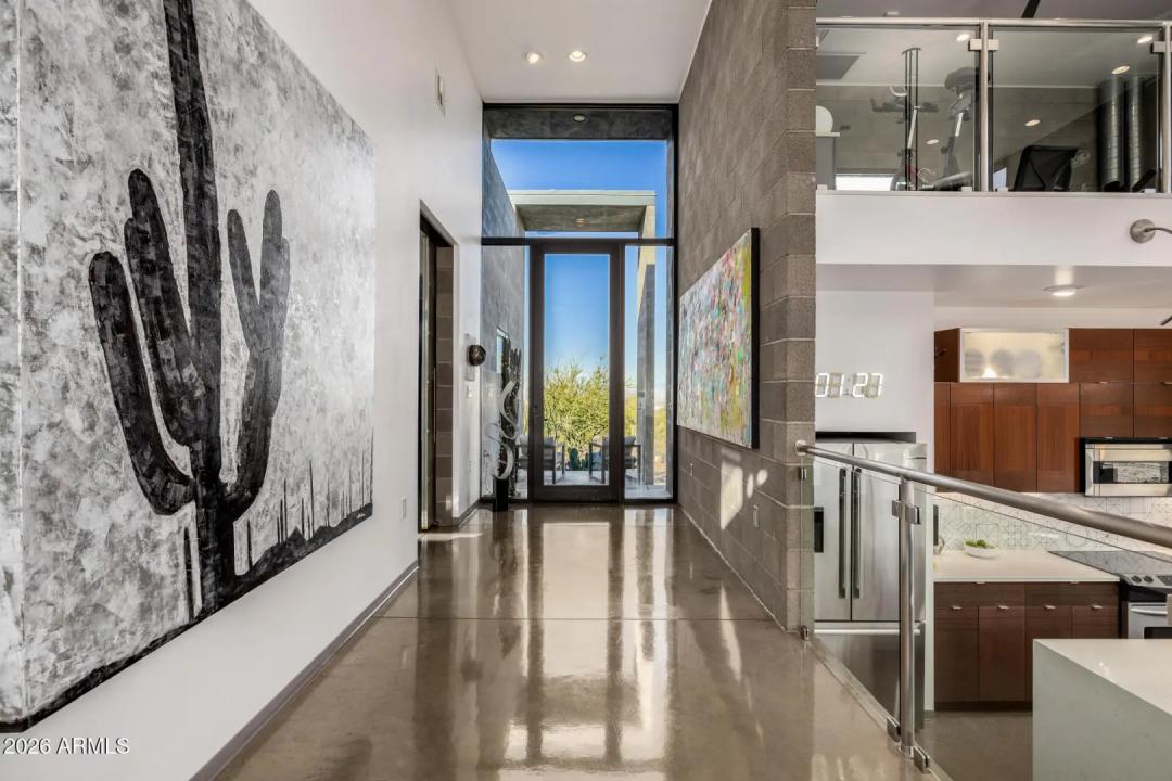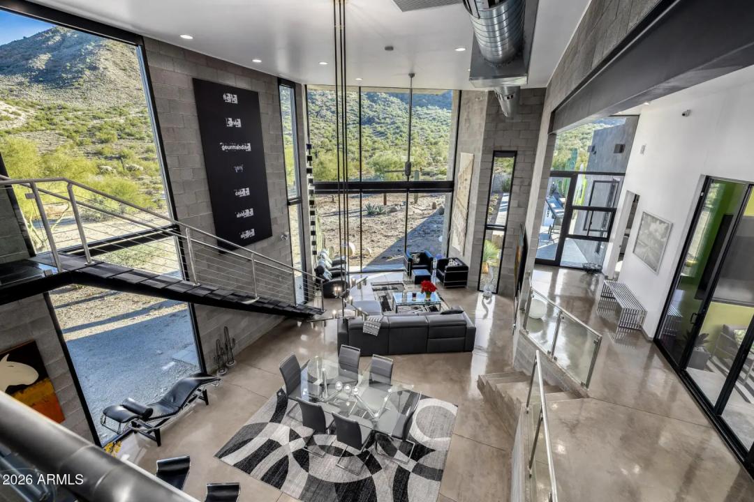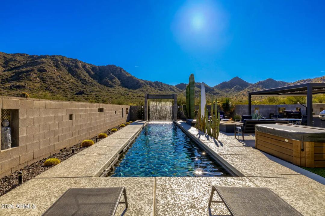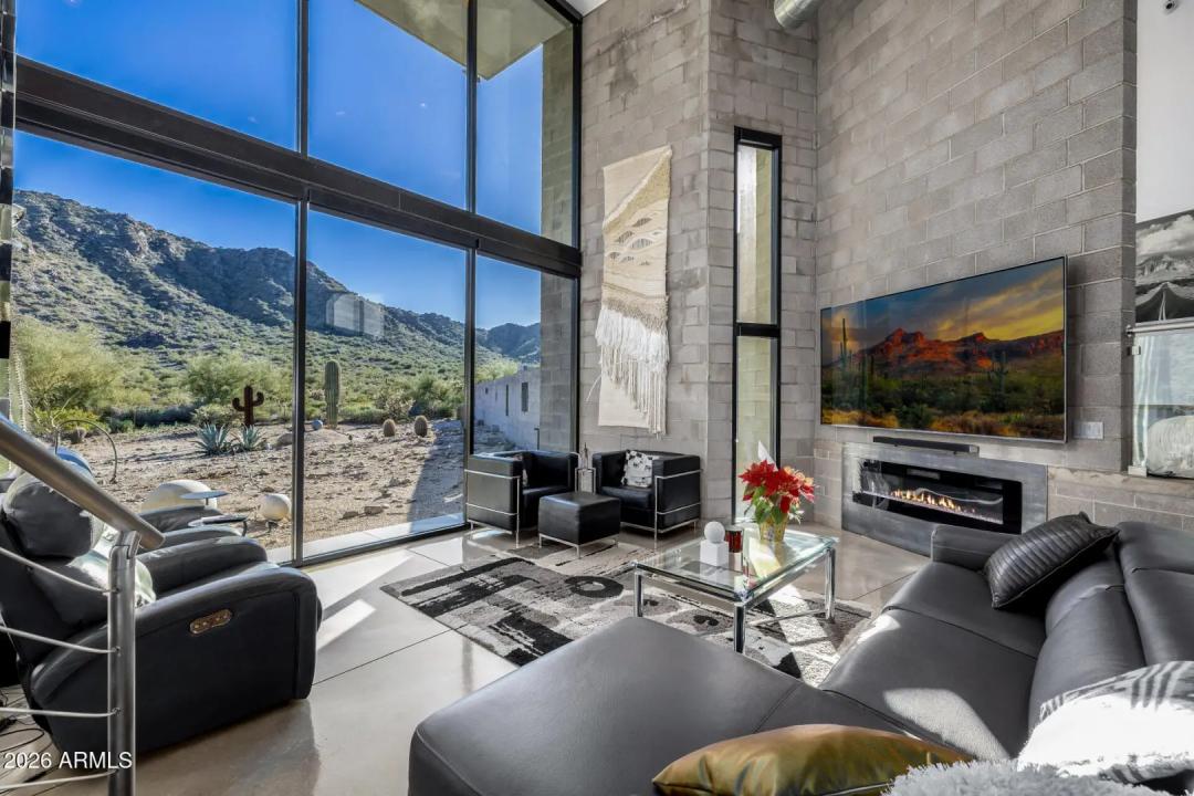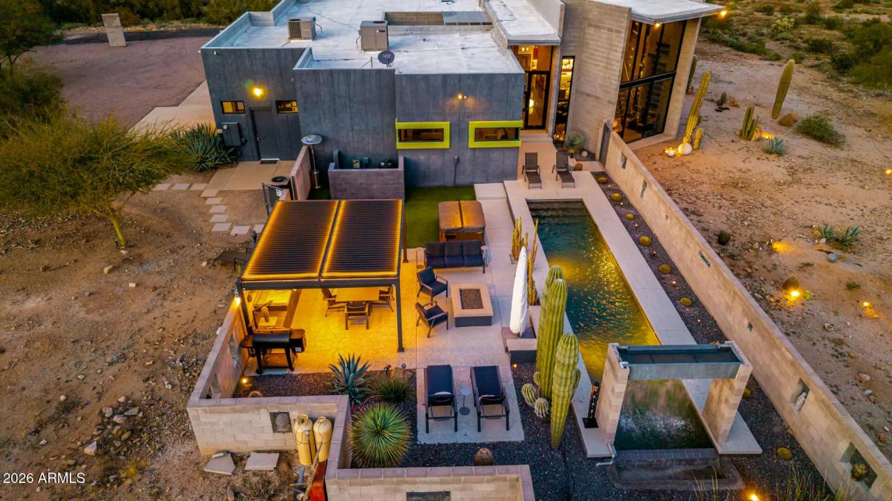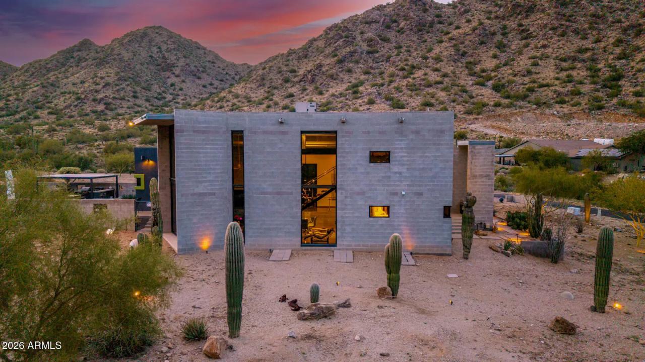 Welcome to The Mirage, a modern concrete sanctuary set at the base of the San Tan Mountains, where architecture, light, and desert landscape converge in quiet harmony. Conceived as a private retreat rather than a traditional residence, The Mirage emerges from its surroundings with intention. Clean lines, industrial materials, and expansive glass dissolve the boundary between structure and nature, creating a home that feels at once grounded and ethereal. The exterior presents a bold yet restrained profile of concrete masonry and steel, softened by curated desert plantings and sculptural lighting that comes alive at dusk. As daylight fades, the home glows subtly against the mountains, revealing itself slowly, much like its namesake. A walled courtyard unfolds into an