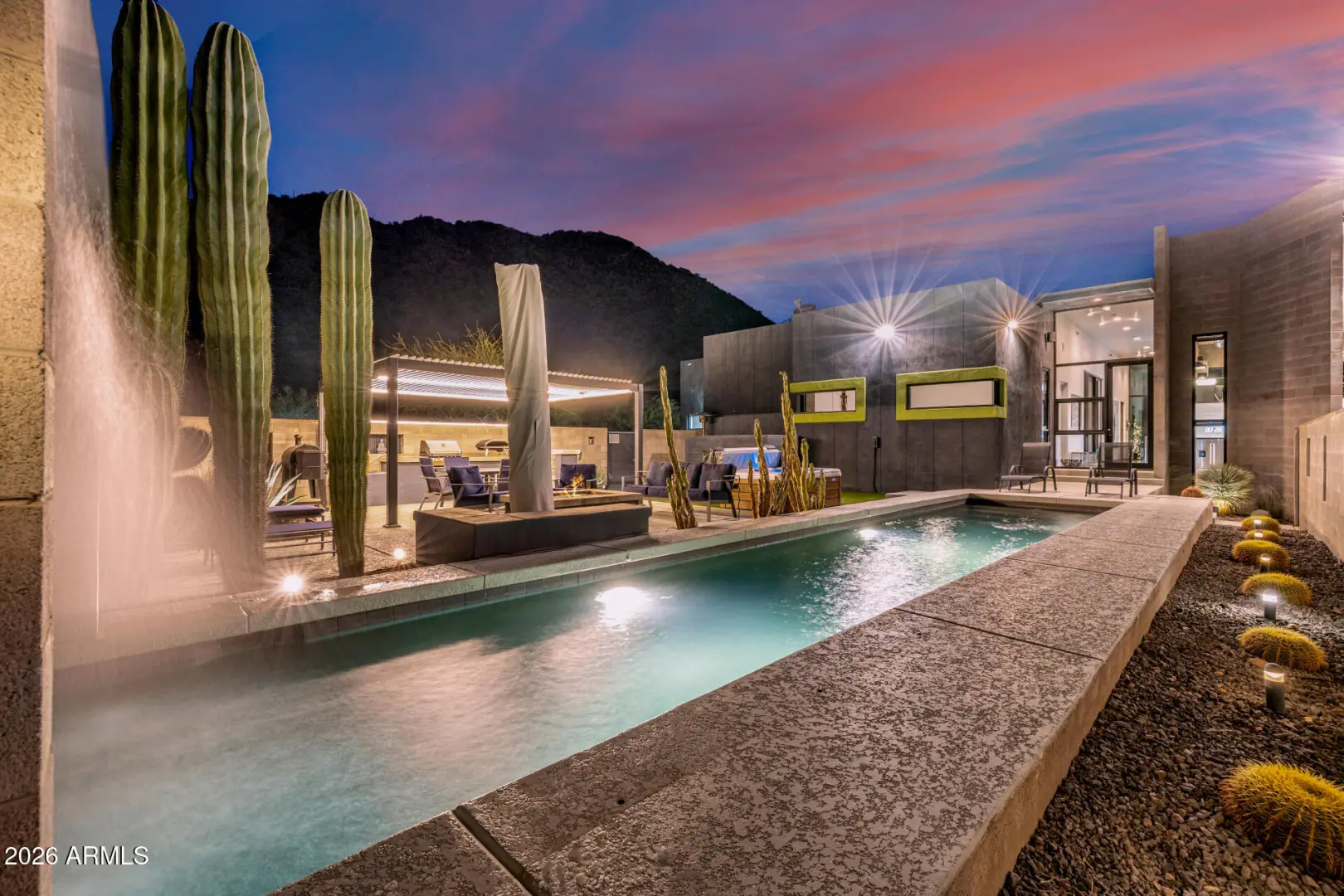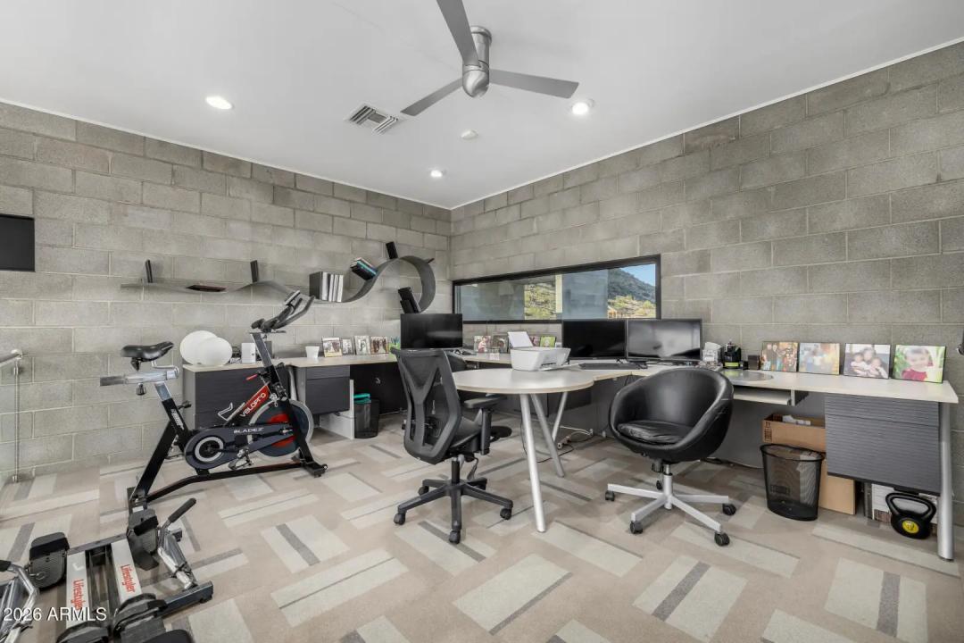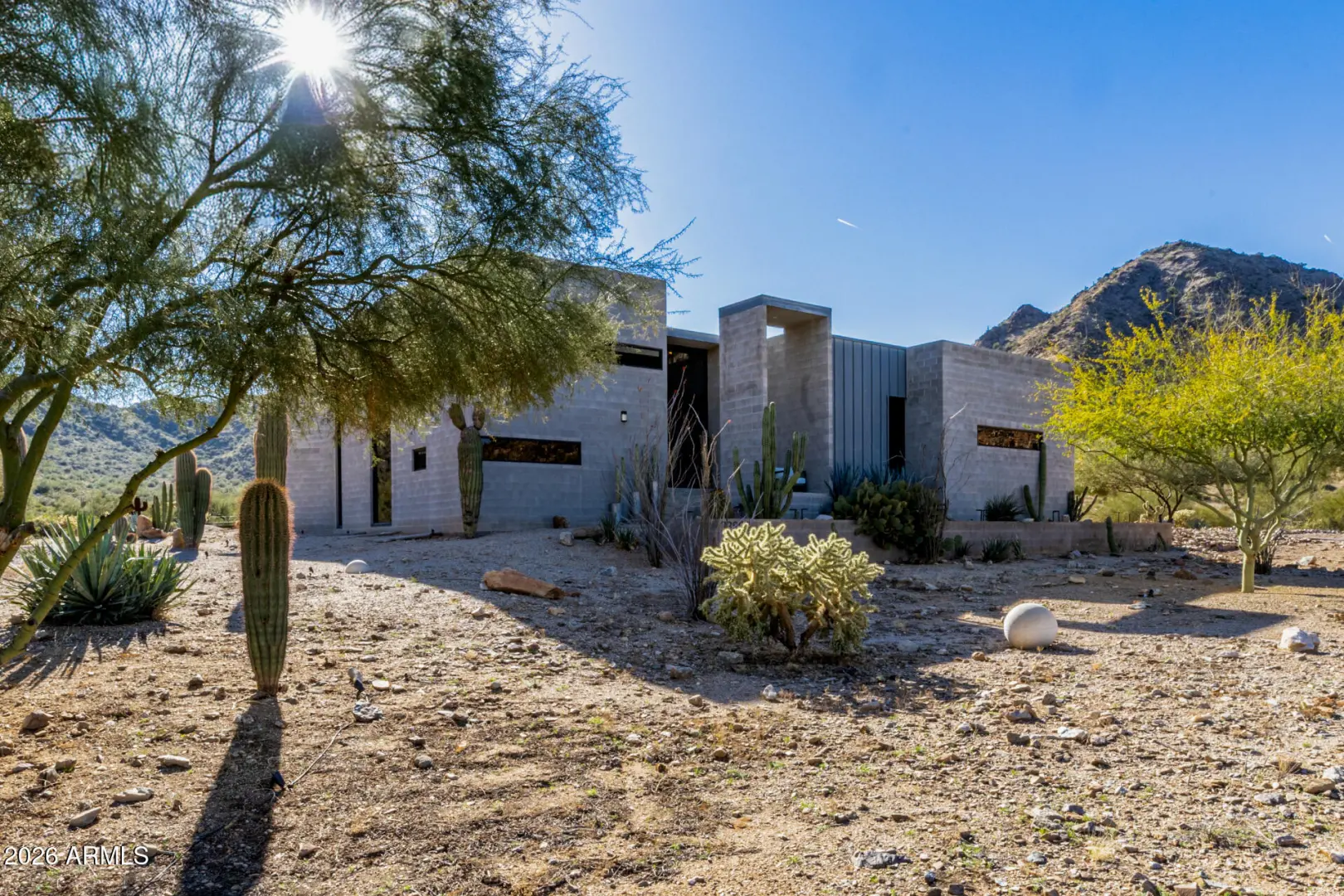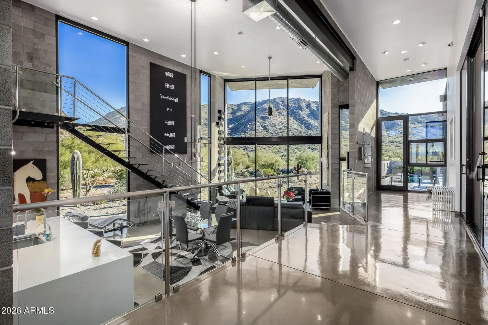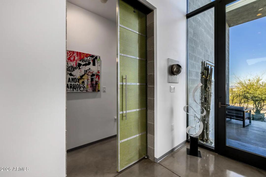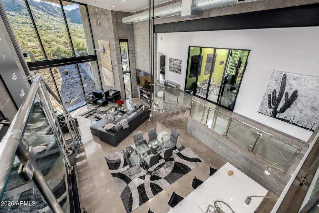 Welcome to The Mirage, a modern concrete sanctuary set at the base of the San Tan Mountains, where architecture, light, and desert landscape converge in quiet harmony. Conceived as a private retreat rather than a traditional residence, The Mirage emerges from its surroundings with intention. Clean lines, industrial materials, and expansive glass dissolve the boundary between structure and nature, creating a home that feels at once grounded and ethereal. The exterior presents a bold yet restrained profile of concrete masonry and steel, softened by curated desert plantings and sculptural lighting that comes alive at dusk. As daylight fades, the home glows subtly against the mountains, revealing itself slowly, much like its namesake. A walled courtyard unfolds into an