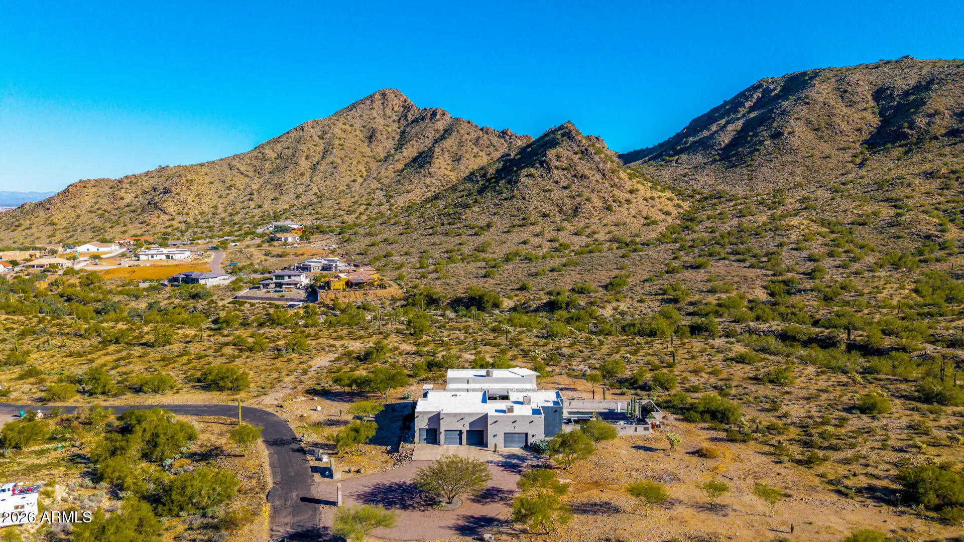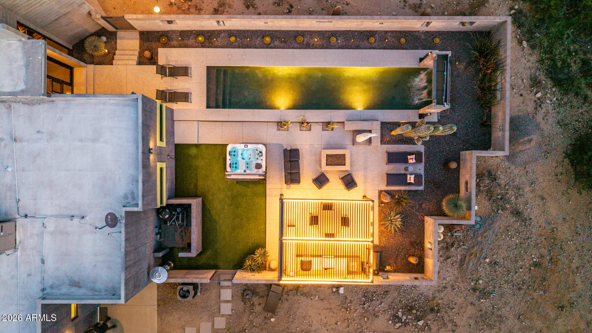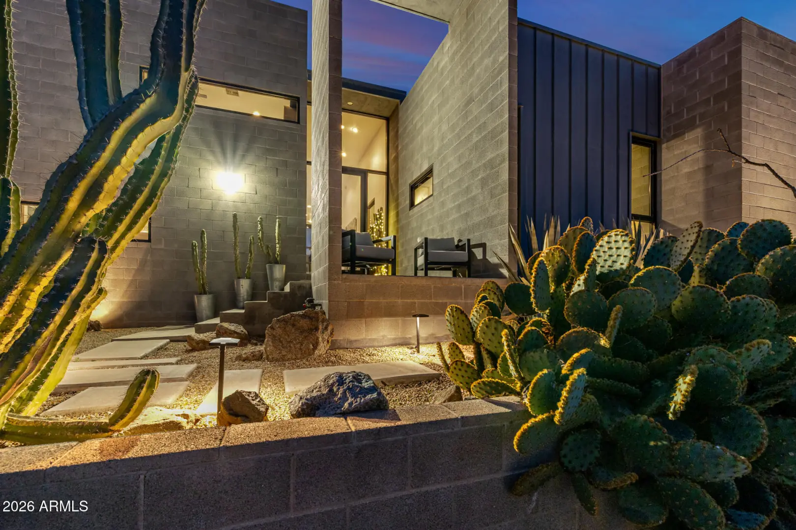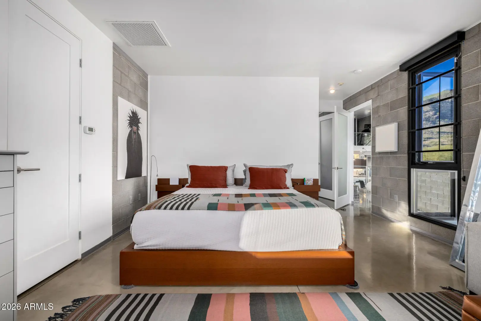 Welcome to The Mirage, a modern concrete sanctuary set at the base of the San Tan Mountains, where architecture, light, and desert landscape converge in quiet harmony. Conceived as a private retreat rather than a traditional residence, The Mirage emerges from its surroundings with intention. Clean lines, industrial materials, and expansive glass dissolve the boundary between structure and nature, creating a home that feels at once grounded and ethereal. The exterior presents a bold yet restrained profile of concrete masonry and steel, softened by curated desert plantings and sculptural lighting that comes alive at dusk. As daylight fades, the home glows subtly against the mountains, revealing itself slowly, much like its namesake. A walled courtyard unfolds into an