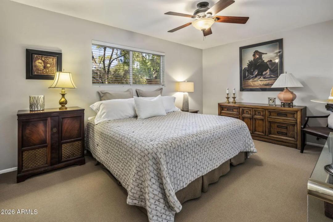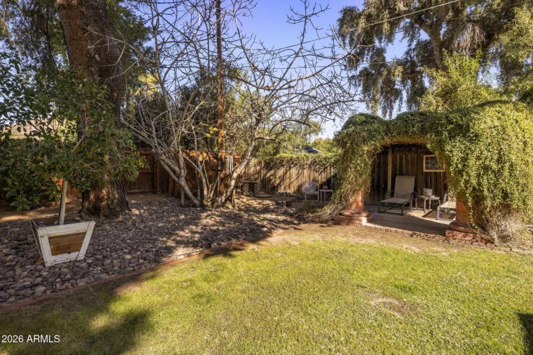 Tucked into the heart of Arcadia Lite, this charming, meticulously maintained ranch-style home sits on a desirable flood-irrigated quarter-acre lot along walkable streets with standout curb appeal. A welcoming entry courtyard feels like a private secret garden, leading to bright interiors and effortless indoor/outdoor living. The backyard is an entertainer's dream with beautifully landscaped grounds, a diving pool with cascading waterfall, and a covered patio with a stylish wood-plank ceiling—perfect for relaxing or hosting. Inside, you'll love the functional split floor plan filled with stylish design details including exposed block/brick accents, four skylights, and a cozy wood-burning fireplace in the great room. A dramatic 20+ ft window wall opens to the patio and pool,