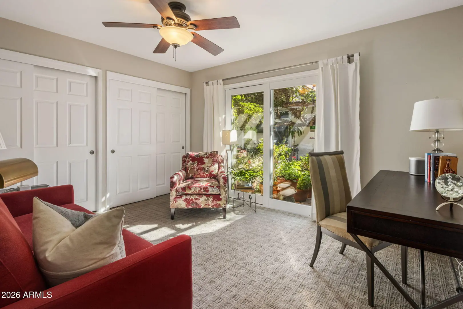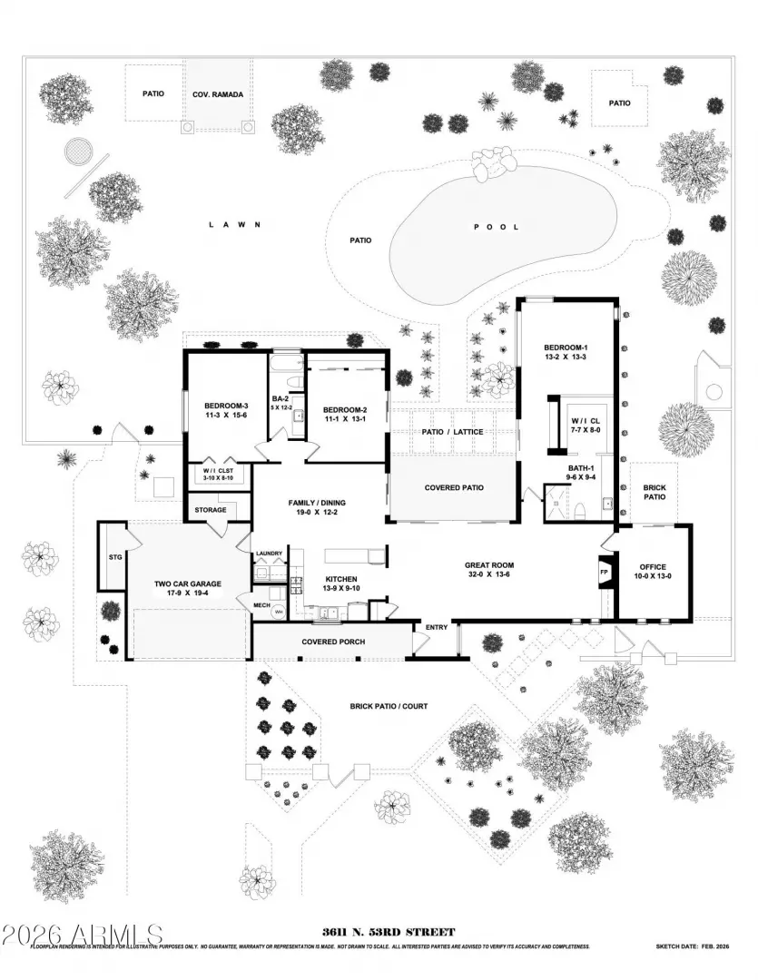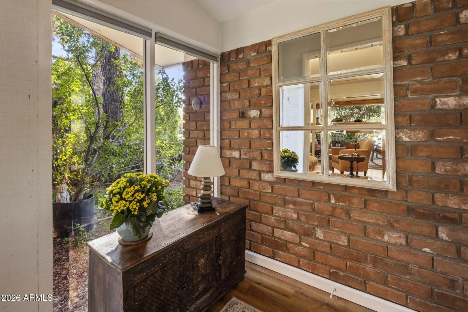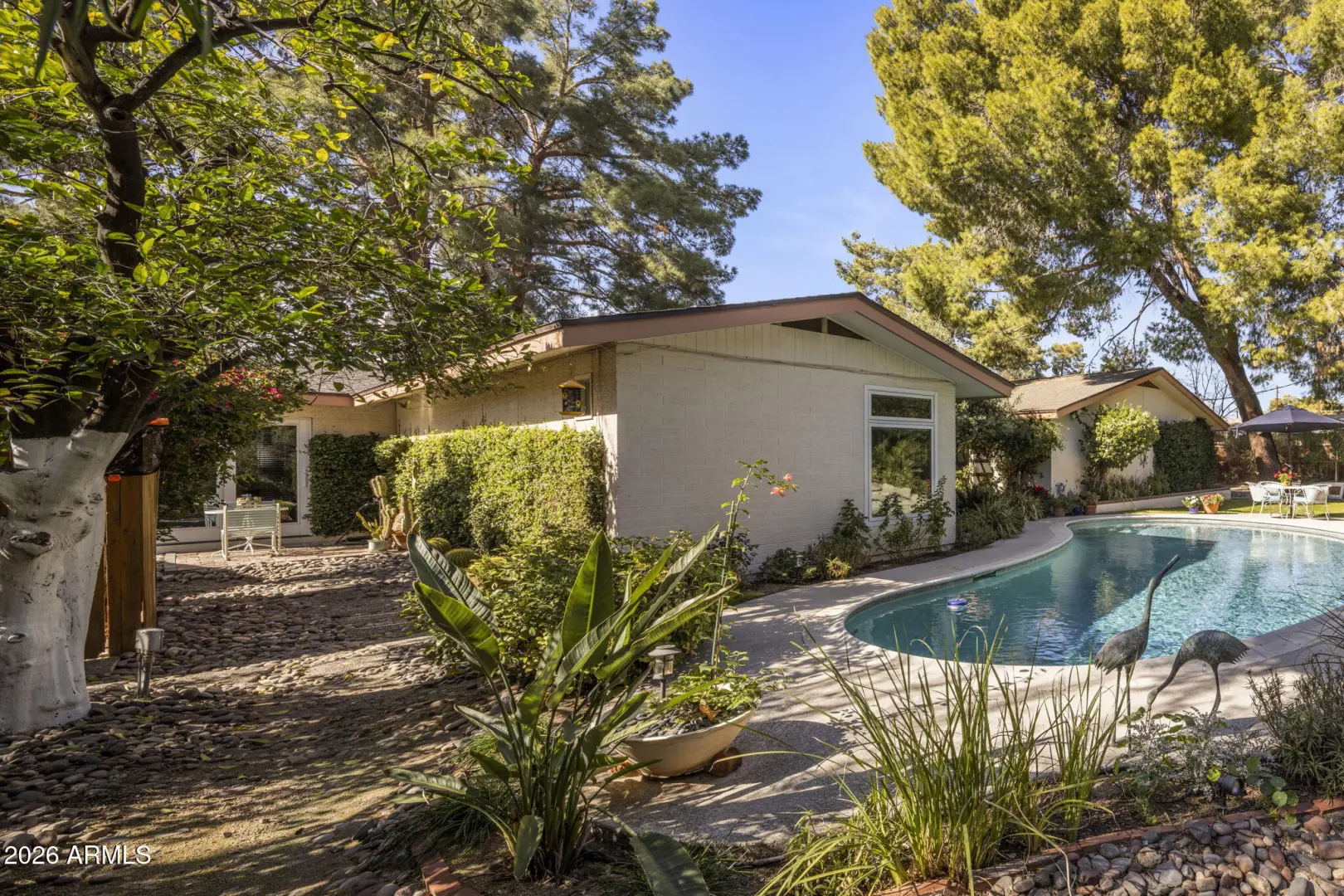 Tucked into the heart of Arcadia Lite, this charming, meticulously maintained ranch-style home sits on a desirable flood-irrigated quarter-acre lot along walkable streets with standout curb appeal. A welcoming entry courtyard feels like a private secret garden, leading to bright interiors and effortless indoor/outdoor living. The backyard is an entertainer's dream with beautifully landscaped grounds, a diving pool with cascading waterfall, and a covered patio with a stylish wood-plank ceiling—perfect for relaxing or hosting. Inside, you'll love the functional split floor plan filled with stylish design details including exposed block/brick accents, four skylights, and a cozy wood-burning fireplace in the great room. A dramatic 20+ ft window wall opens to the patio and pool,