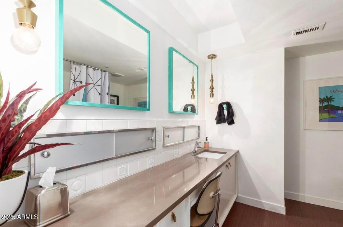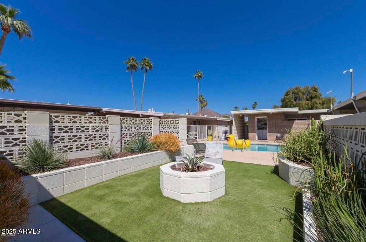 This Distinctive home was designed by Architect Ralph Haver. This is your chance to live in a work of art. The home encompasses design and elegance. From the large living room new floors, to the curved feature wall with shelving, lastly a tulip design breeze block divider located in the entry. Beautifully curved kitchen has under cabinet lighting, quartz counters, SS appliances, breakfast bar & Ann Sacks tiled back splash. Sizable secondary bedrooms. Well appointed hall bath has bronze colored quartz counters, built-in horizontal medicine cabinets, Large master has a private entrance to the patio and sitting area Front & back patios. Community pool. Frig/Washer Dryer Included Walking distance to The Porch, LGO, Postinos, and Ingo's