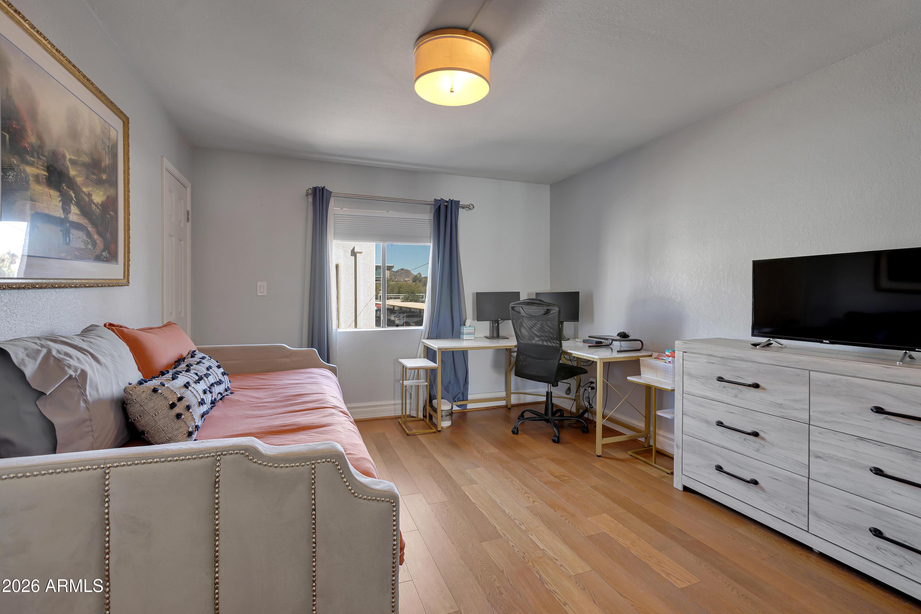 Fully furnished 2 bedroom, 2 bathroom en suite condo located in desirable 85018 zip code. Split floor plan with washer/dryer inside unit. Includes covered parking spot. No carpet inside unit! Lots or storage space. Gated community provides privacy and security. Close to dining, shopping, golf, highway, airport, and much more! Community offers pool/spa, community rec room and work out facility. No neighbors above unit.