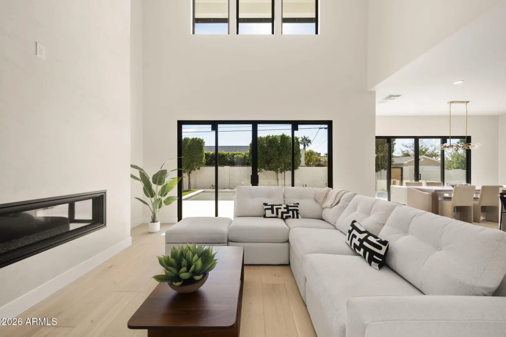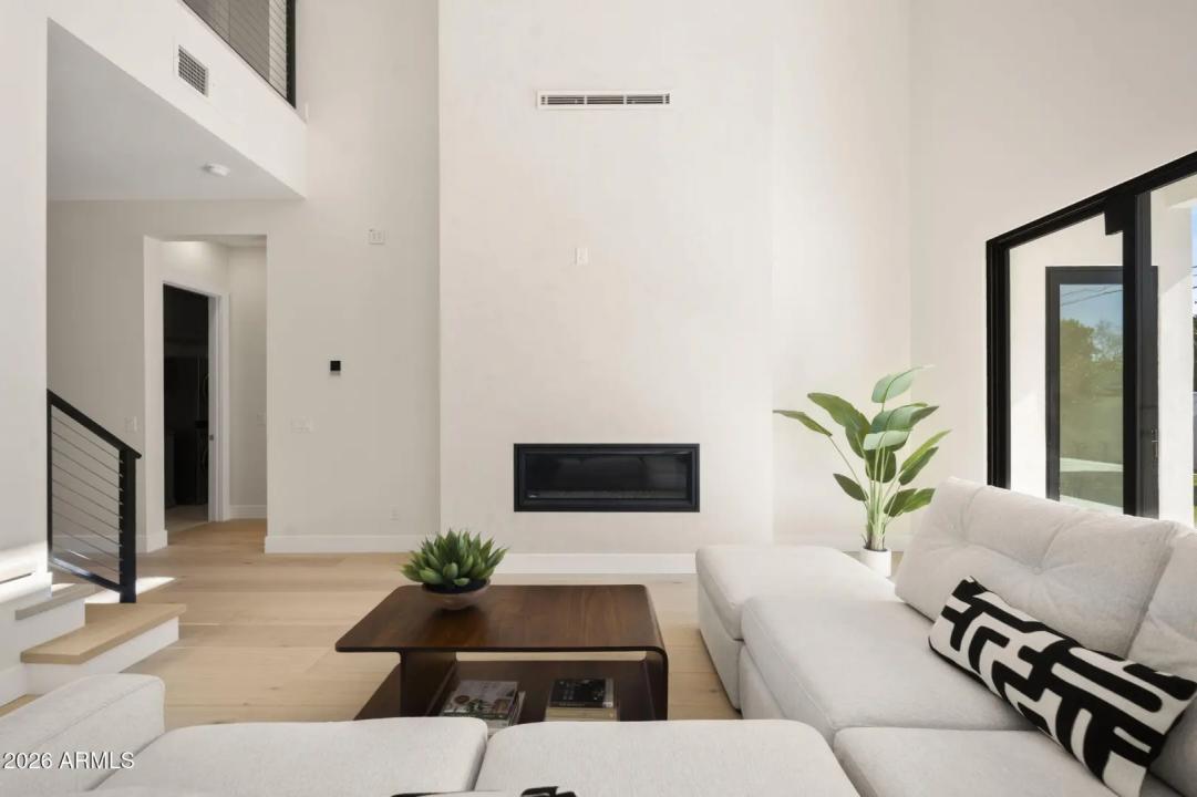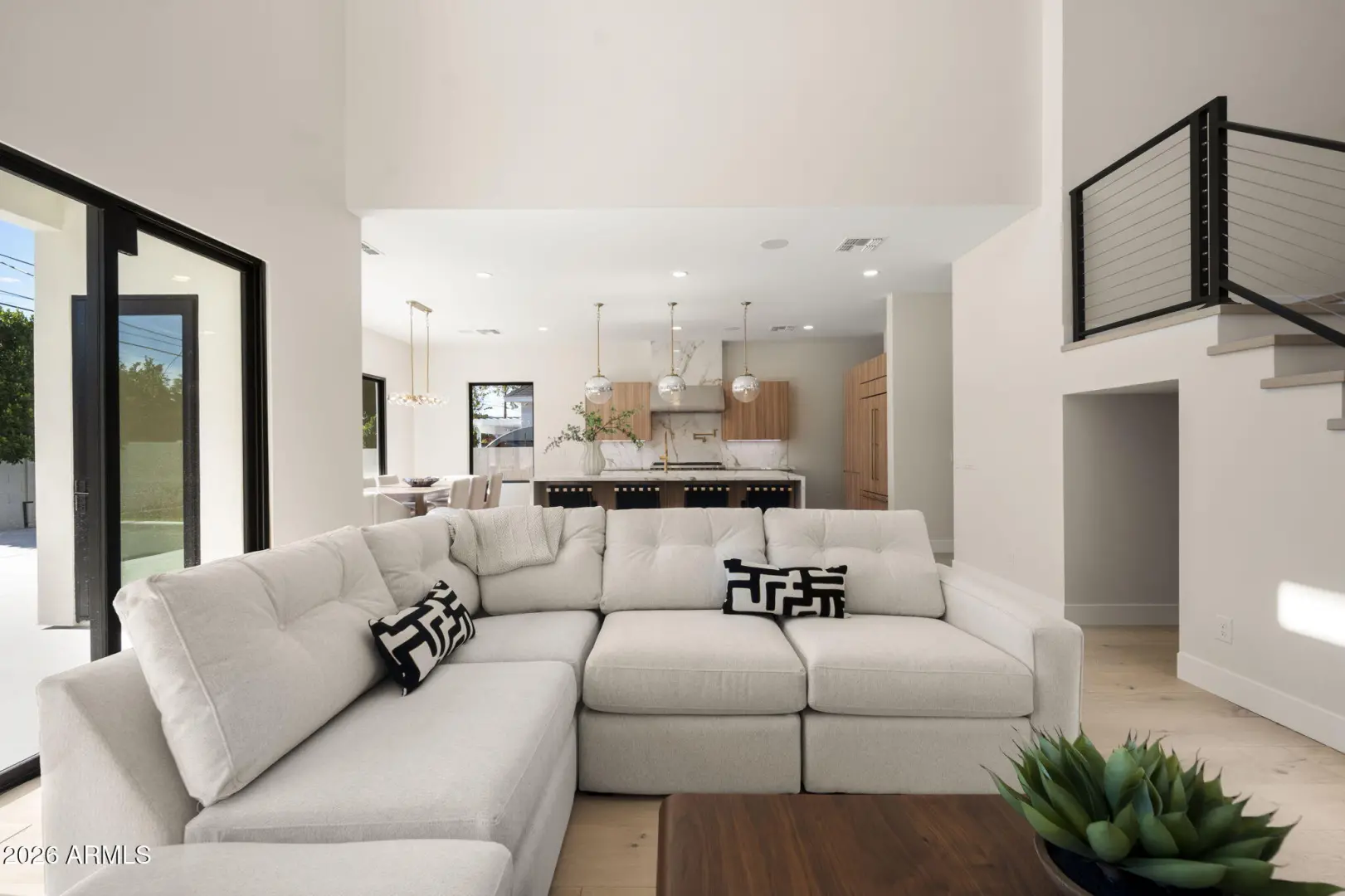 A striking new-construction contemporary in the heart of Arcadia Lite, designed for the way people actually live—bright, open, and effortlessly dialed-in. From the curb, clean white stucco is warmed by a statement wood-clad volume, a glass-panel garage door, and a sleek upper-level terrace that sets the tone before you even step inside. The interior delivers a true wow-factor with a soaring double-height great room, wide-plank flooring, and walls of glass that pull the backyard into everyday life. The kitchen is the centerpiece: an oversized waterfall island, warm modern cabinetry, professional-grade gas range with pot filler, and globe pendants that make the space feel equal parts designer and functional—perfect for entertaining without feeling formal. Out back, enjoy a private