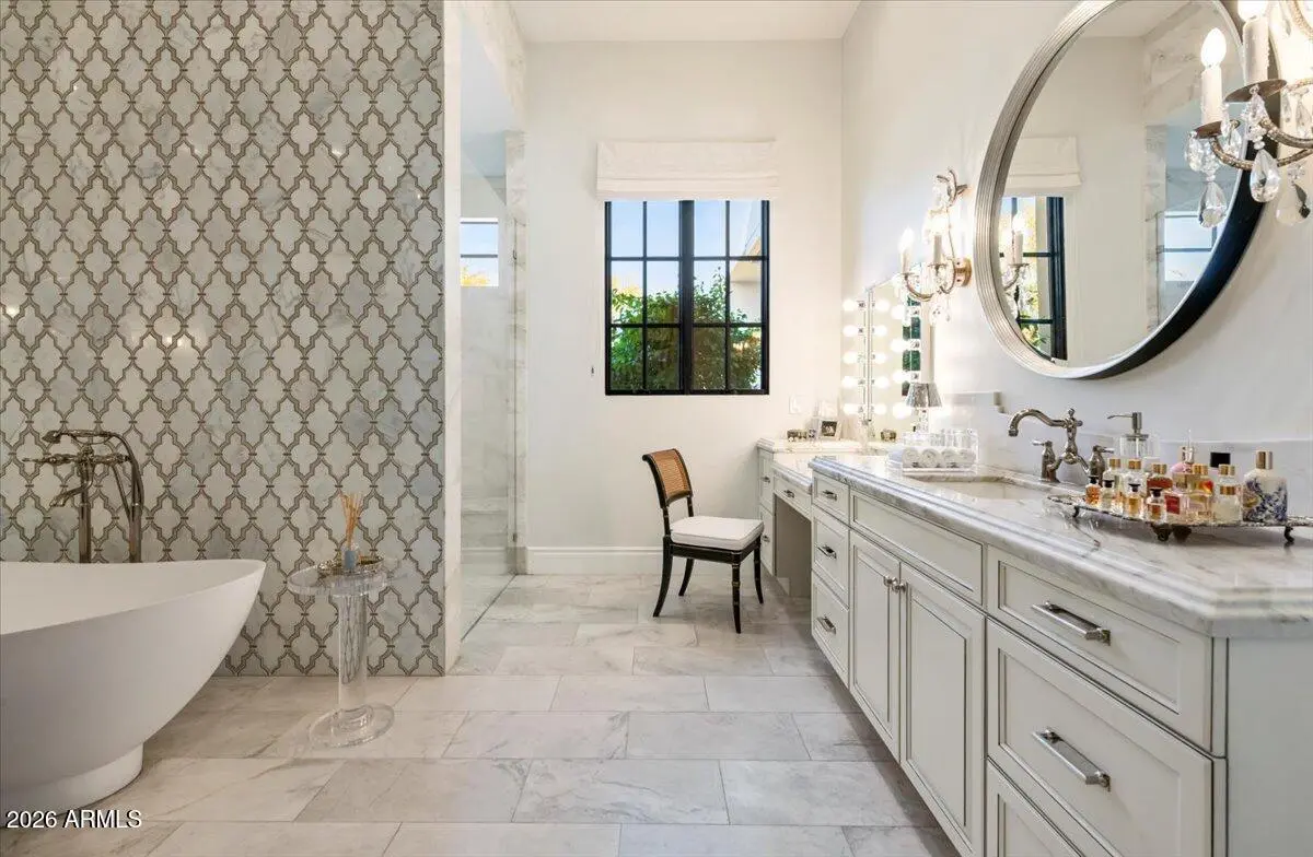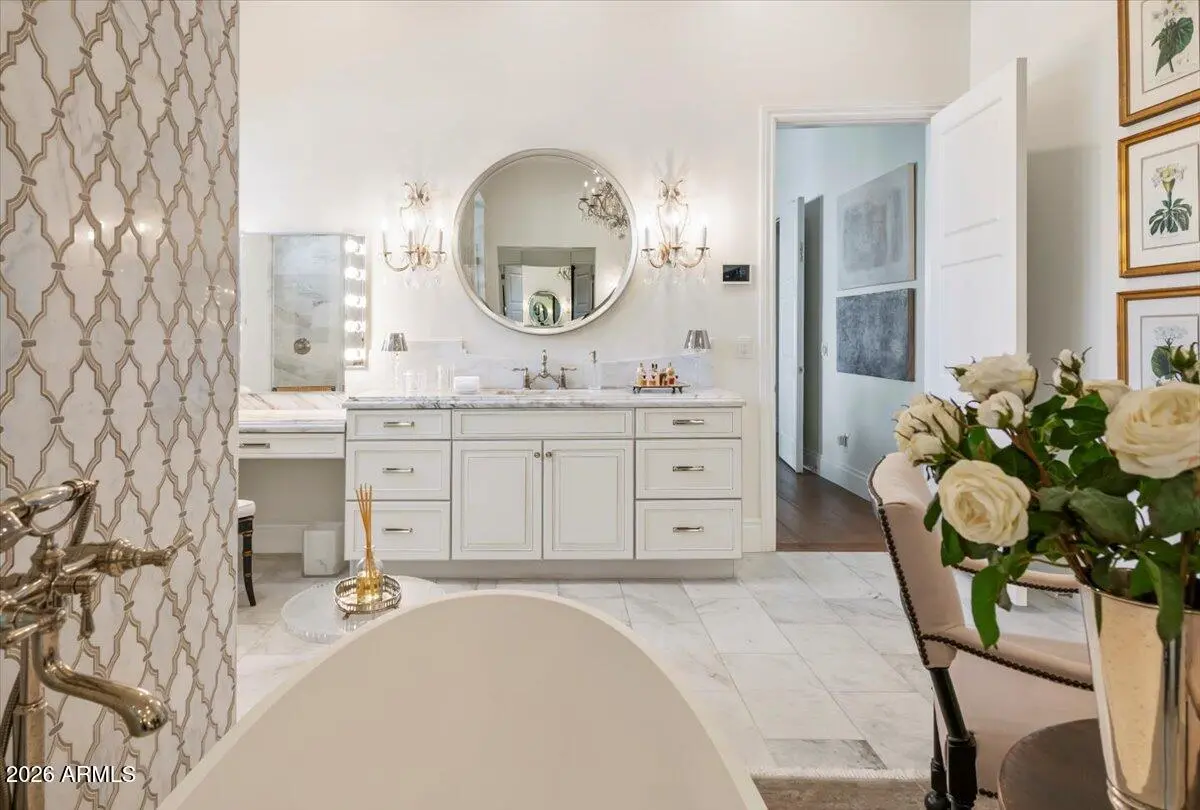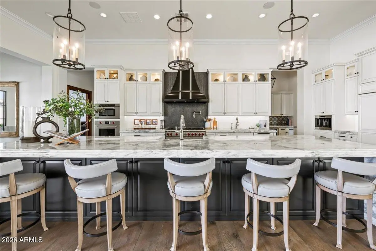 This private gated modern mediterranean inspired estate is absolutely spectacular. Custom built by Regal American, the pristine attention to detail and authentic european design elements makes it one of the most spectacular estates in all of Paradise Valley. The sleek architecture and chic design combine elegance and comfort, while incorporating contemporary elements and maintaining a sense of luxury and sophistication. Meticulous attention to detail elevates the overall quality of each room including the island kitchen that features exquisite custom cabinetry and a wolf/subzero appliance package. The stunning great room is the center of the home and has a floor to ceiling fireplace providing an excellent backdrop. The bar/game room has a full wet bar, plenty of room for a pool table,