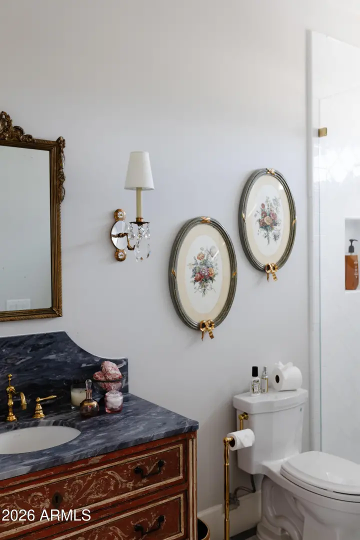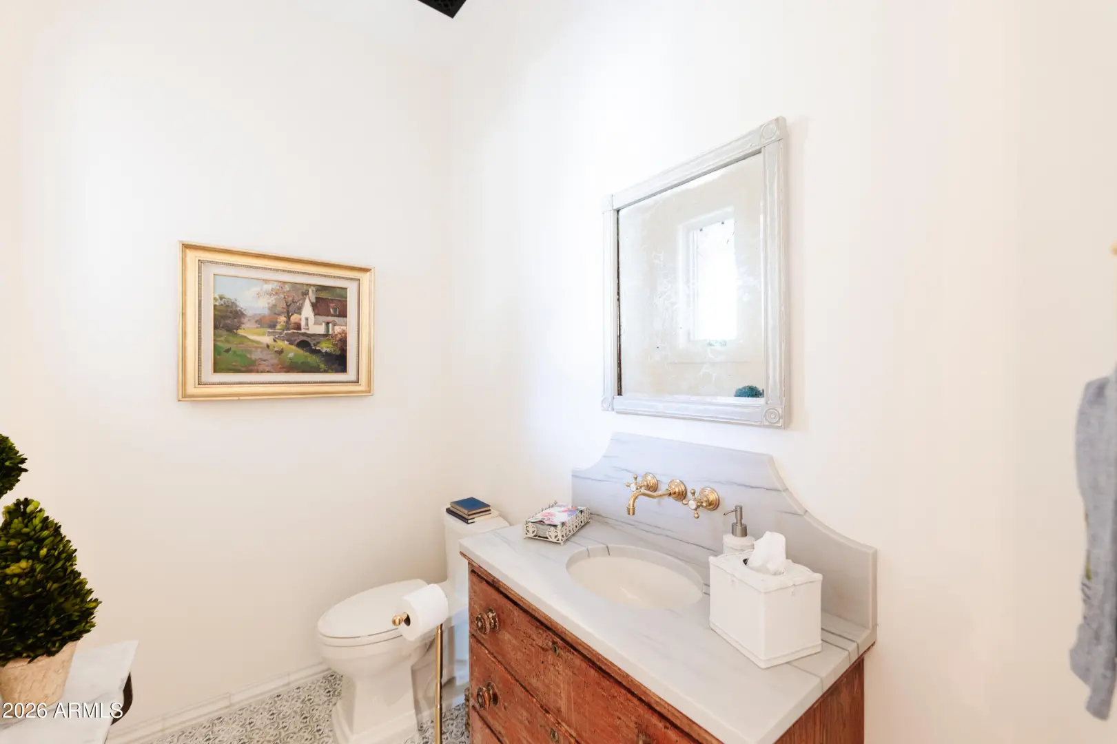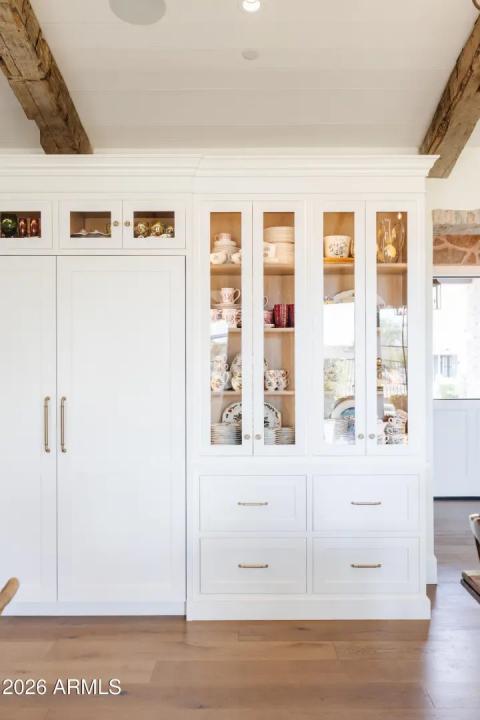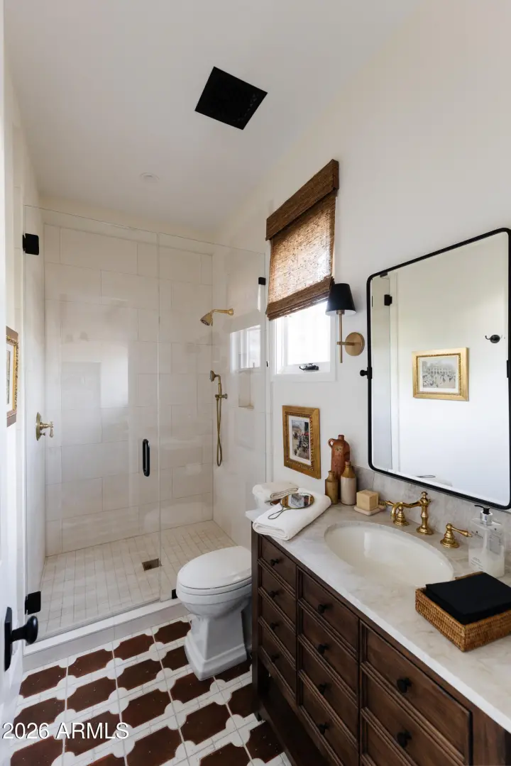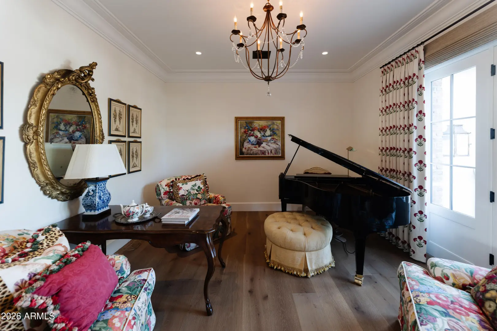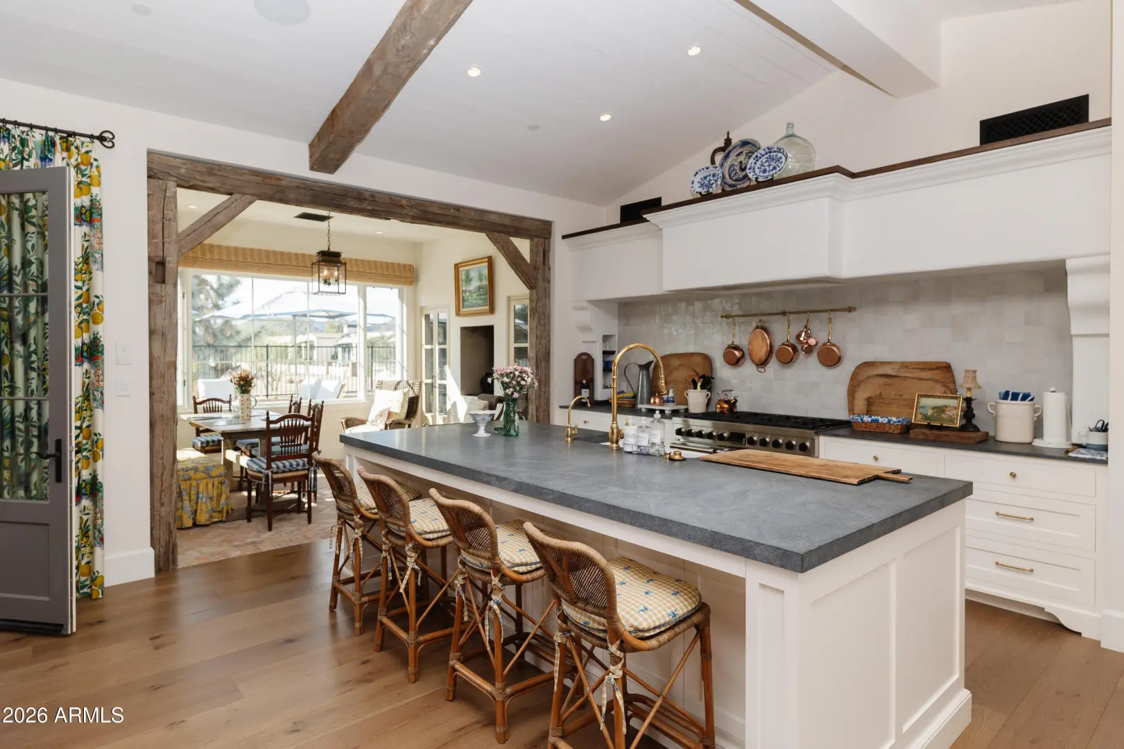 Welcome to a one-of-a-kind jewel box nestled in the gated community of Mountain Shadows East. Featuring Reclaimed beams from Quebec, Gas lanterns from New Orleans ,Chicago brick and custom cabinetry by Burdette . The layout is thoughtfully designed with a master suite, guest suite, third bedroom used as a dual office and a music room. Butlers pantry and coffee bar off open concept kitchen , a separate eating area with niche fireplace and stunning Camelback mountain views are just two examples of living well. Outside the charm continues with a welcoming front porch ,Dutch door and fountain . The deep covered back patio looking onto the pool and fire pit and open area is lush. A custom built masterpiece ,this home is a testament to craftsmanship, history and the art of fine living
