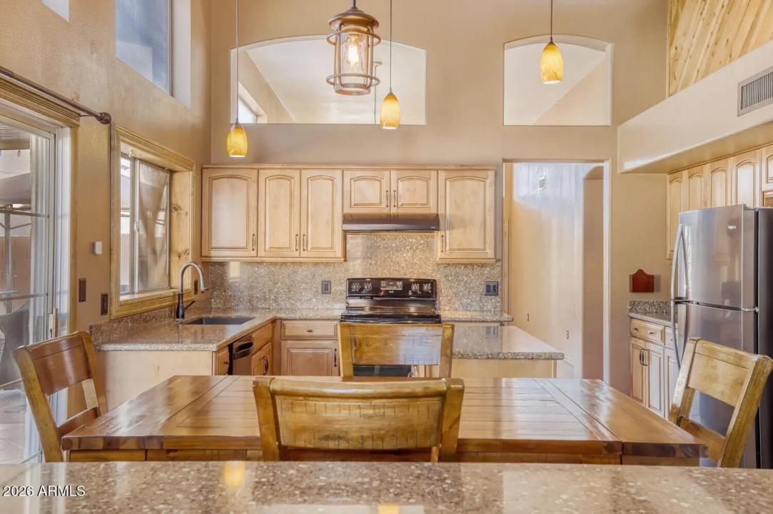 Step inside this Mesa home and it's easy to imagine a lifestyle built around comfort, convenience, and connection. From the moment you walk in, the vaulted ceilings, thoughtful layout, and inviting living spaces make the home feel instantly livable. With 3 bedrooms, a loft and 2.5 baths, plus newer flooring, a newer roof, and a refreshed kitchen, the home blends everyday functionality with updates buyers appreciate. The primary bedroom is thoughtfully located on the first floor, providing added comfort and accessibility. The kitchen sits at the heart of the home, creating a natural gathering place for meals, conversation, and the rhythm of daily life.