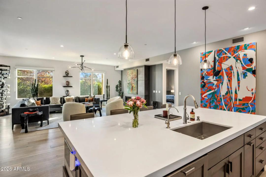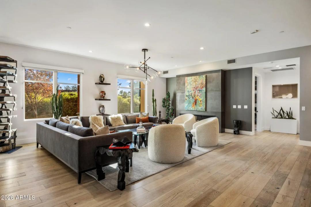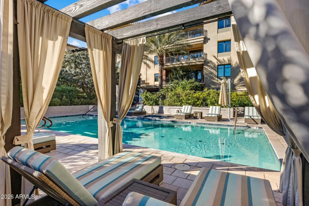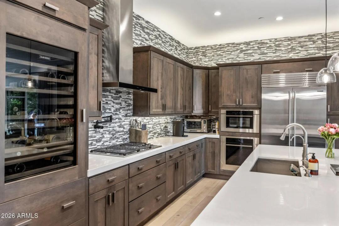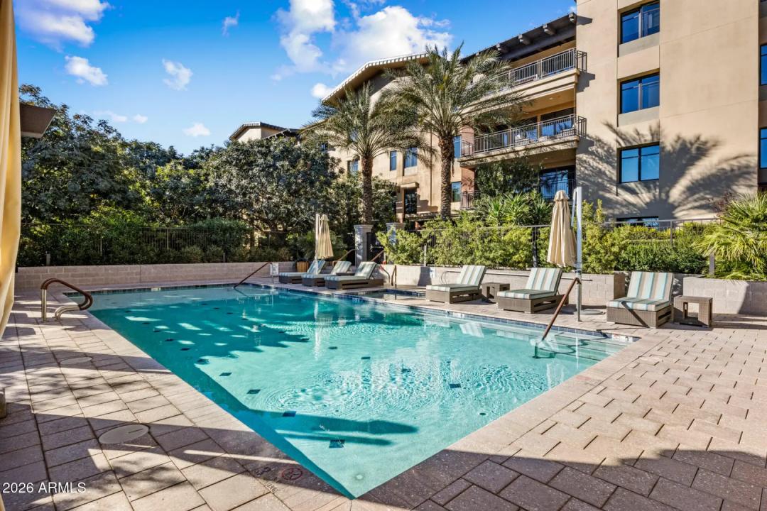 Luxury Living awaits at the exclusive Enclave at Borgata community, perfectly located in walking distance of the best Paradise Valley offers, and complemented by residents-only, resort-style amenities including a fitness center, pool, spa and dog park. Designed for an elevated lock-and-leave lifestyle with true indoor-outdoor ease, this stunning contemporary ground-floor residence offers an expansive open layout with premium finishes throughout. Bright, open-concept living is defined by a sophisticated neutral palette featuring wide-plank wood flooring and designer lighting. The chef's kitchen anchors the home with a dramatic statement backsplash, generous island seating, sleek cabinetry, 90-bottle wine chiller and premium Wolf & SubZero stainless appliances - perfect for effortless