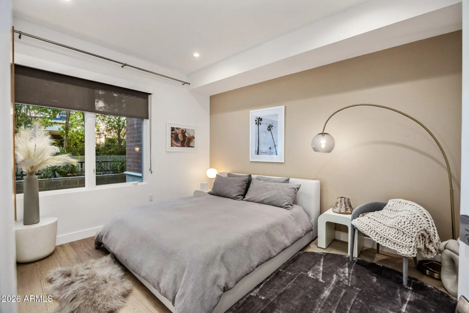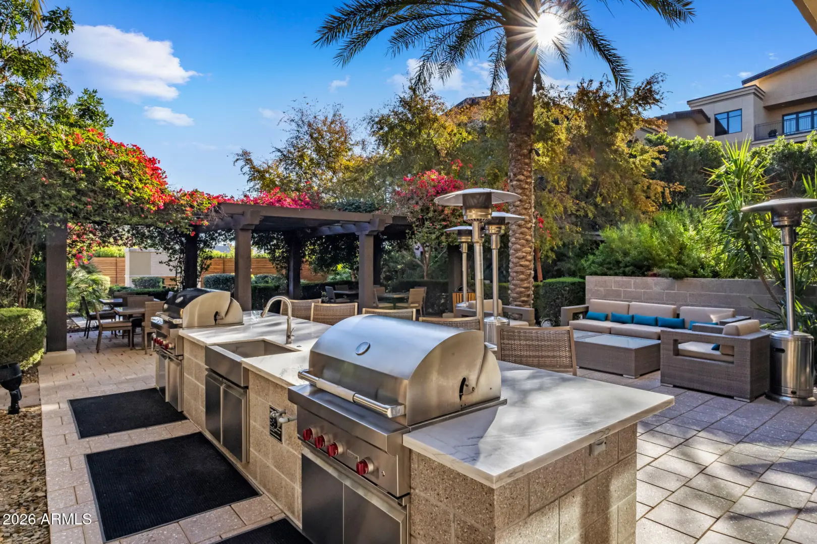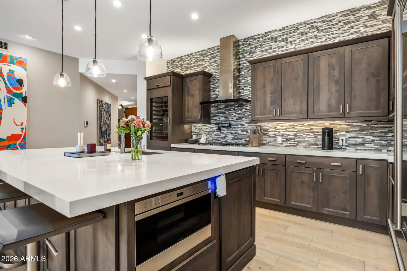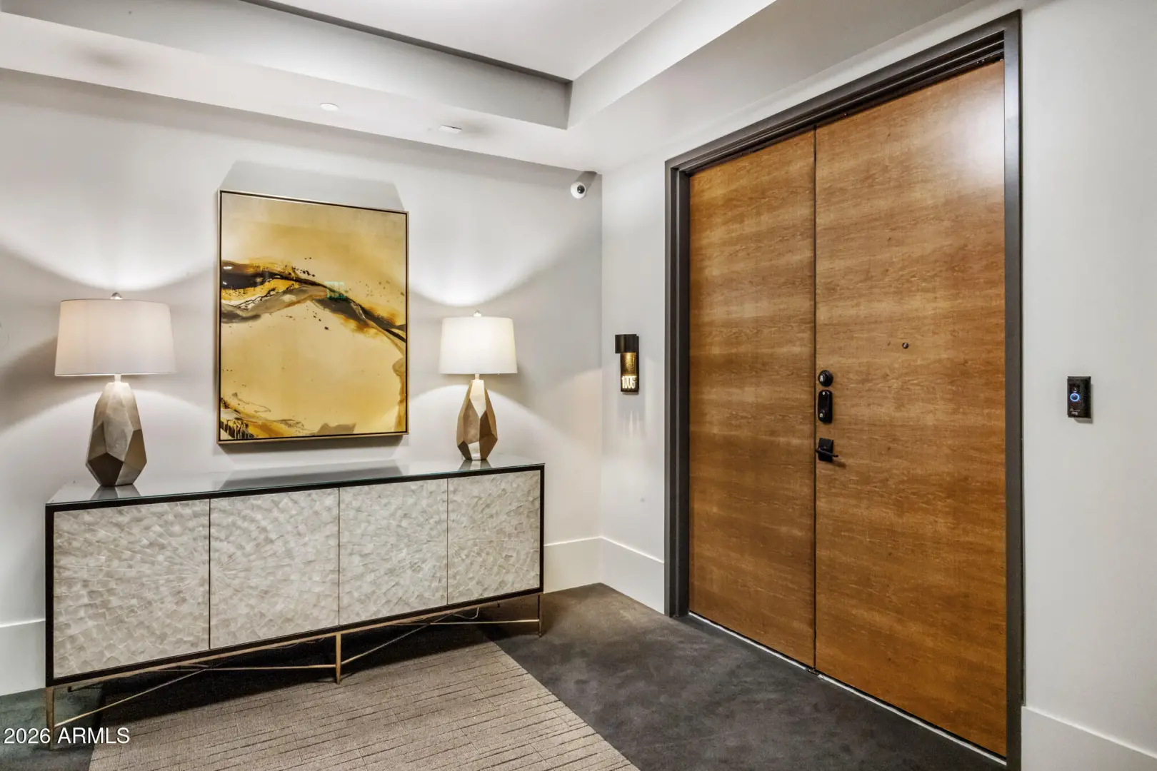 Luxury Living awaits at the exclusive Enclave at Borgata community, perfectly located in walking distance of the best Paradise Valley offers, and complemented by residents-only, resort-style amenities including a fitness center, pool, spa and dog park. Designed for an elevated lock-and-leave lifestyle with true indoor-outdoor ease, this stunning contemporary ground-floor residence offers an expansive open layout with premium finishes throughout. Bright, open-concept living is defined by a sophisticated neutral palette featuring wide-plank wood flooring and designer lighting. The chef's kitchen anchors the home with a dramatic statement backsplash, generous island seating, sleek cabinetry, 90-bottle wine chiller and premium Wolf & SubZero stainless appliances - perfect for effortless