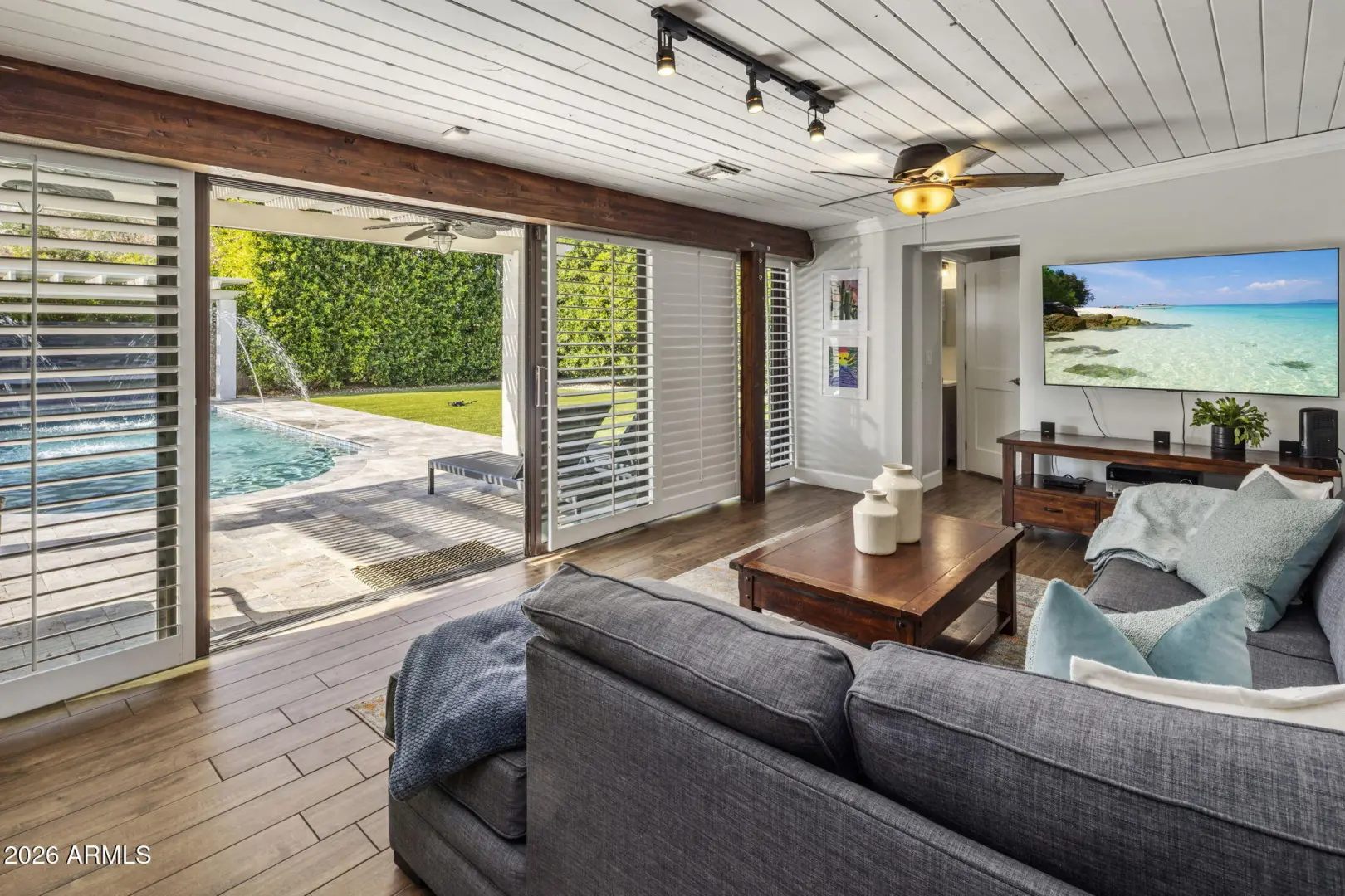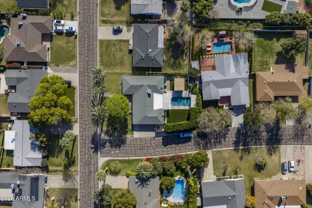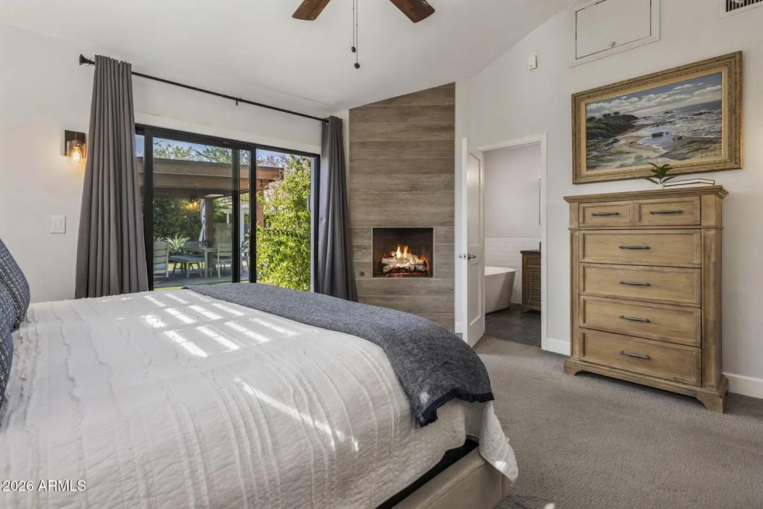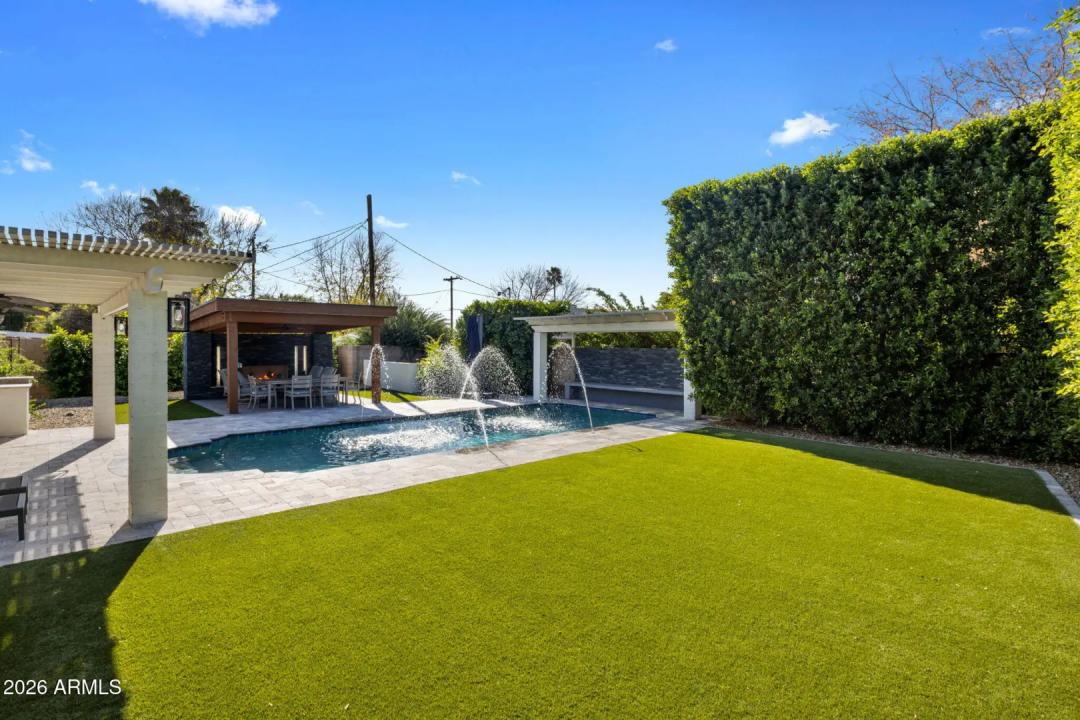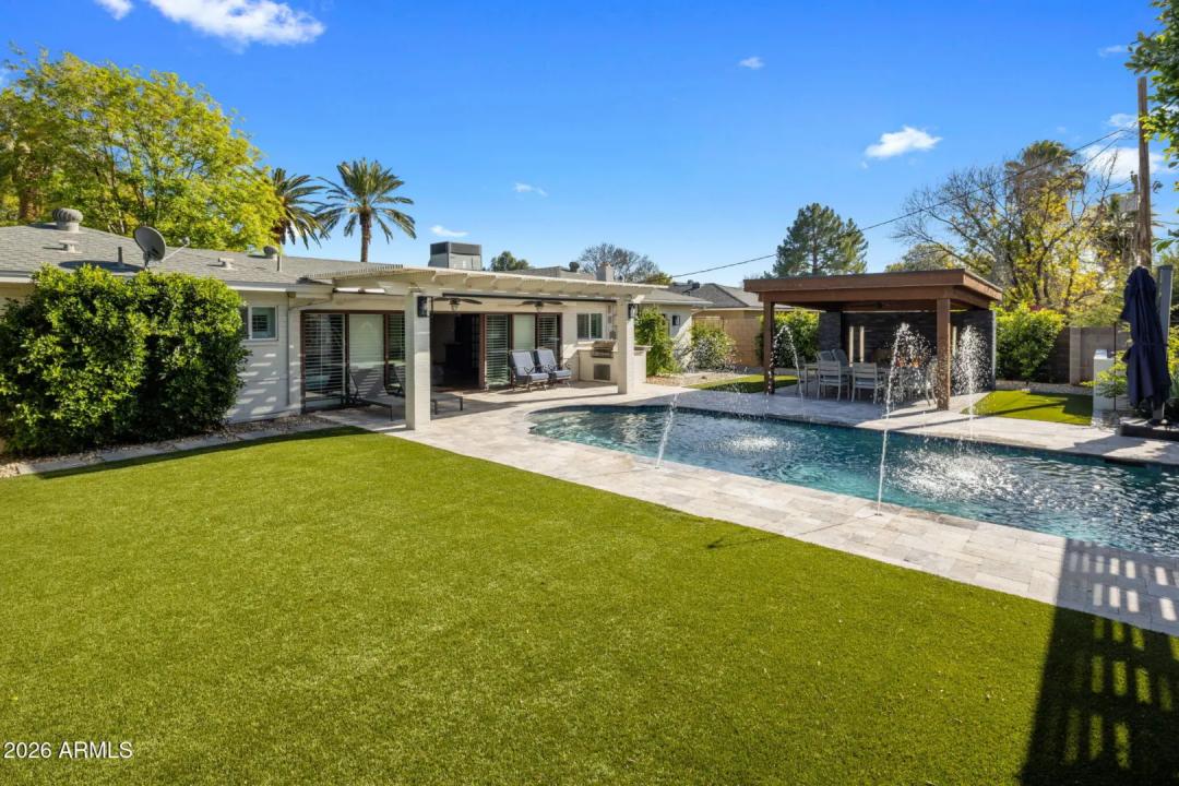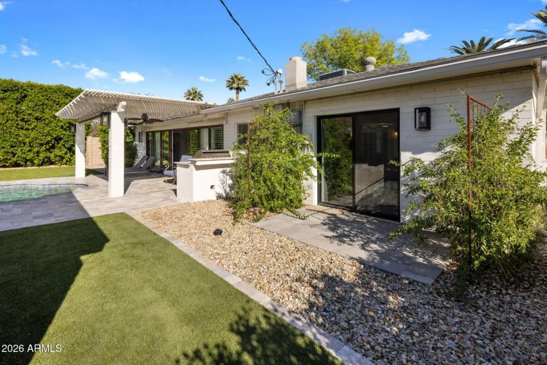 Tucked at the very end of a serene North Central Phoenix block, this charming 1956 ranch blends timeless character with extensive, high-quality updates inside and out. The inviting front patio—with a rare wood-burning fireplace—sets the tone for relaxed mornings and cozy evenings. Inside, the home was remodeled with entertaining in mind. A dramatic telescoping wall of glass opens the family room to the backyard for true indoor/outdoor living and effortless flow. Step outside to your own private retreat featuring a self-cleaning pool with water features, gas fire pit, built-in BBQ, and cooling misters for comfort year round. Towering mature ficus trees provide exceptional privacy, while the backyard shines with a gazebo/ramada with fireplace and a full outdoor kitchen—ideal for
