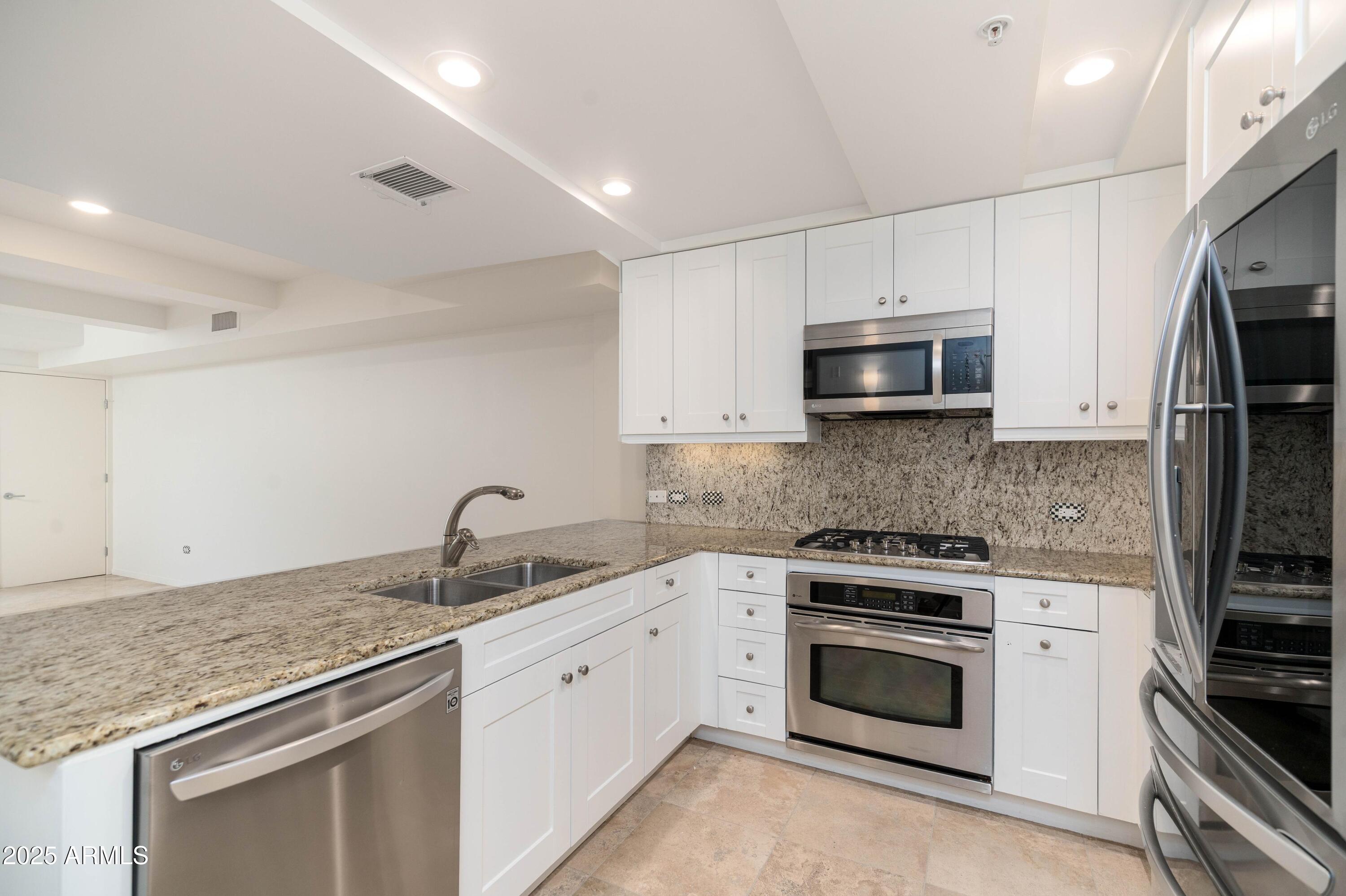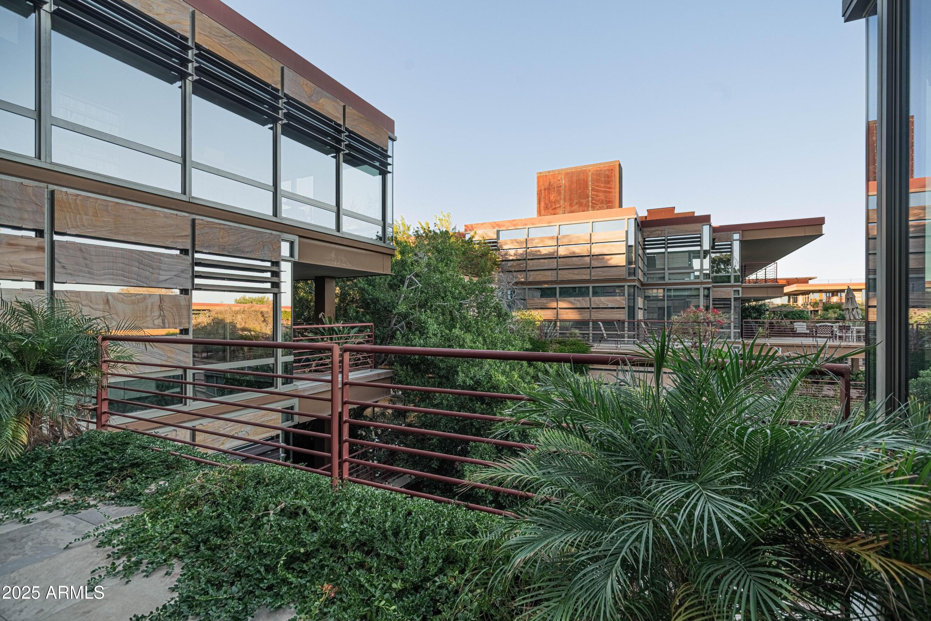 Welcome to your new home in the highly sought-after Optima Camelview Village! This stunning 2-bedroom, 2-bathroom condo offers a bright and open living space filled with natural light from the floor-to-ceiling windows that showcase city and community views. The home features tile flooring throughout the main living areas and warm wood-like flooring in the bedrooms, complemented by neutral paint tones that create an inviting atmosphere. The modern kitchen is equipped with stainless steel appliances, stone countertops, and a peninsula with additional seating. It opens seamlessly to the dining area and spacious living room, making it perfect for entertaining or relaxing. The primary suite serves as a serene retreat, featuring a ceiling fan, the same expansive windows, a walk-in closet with