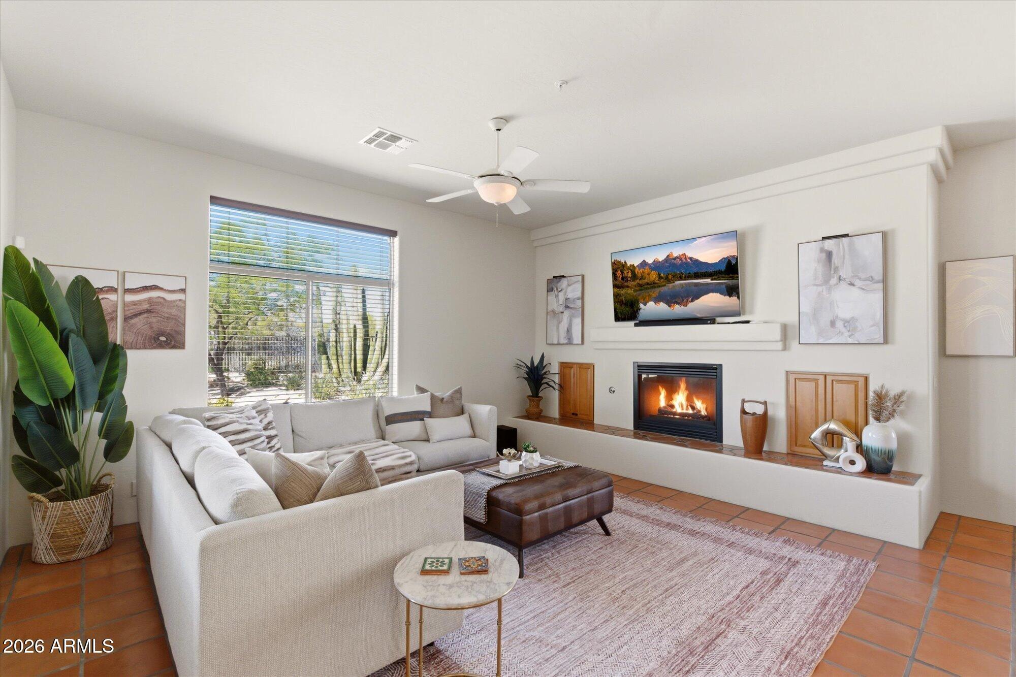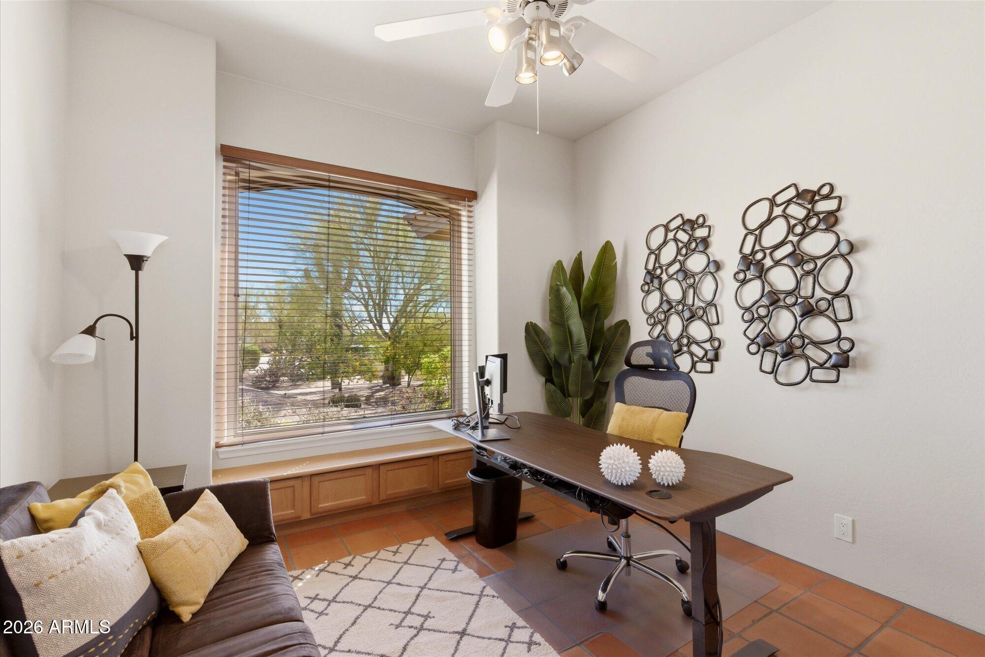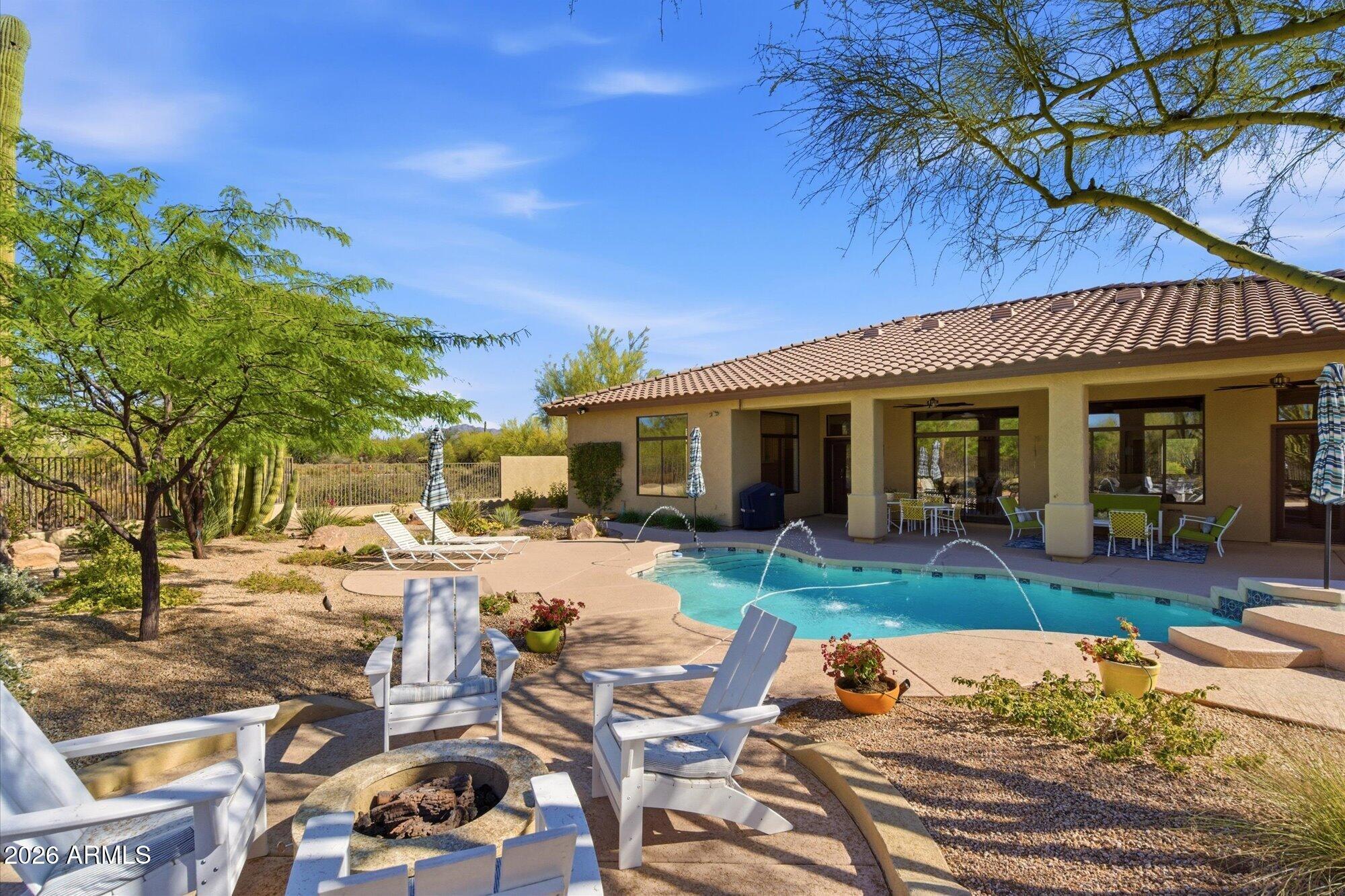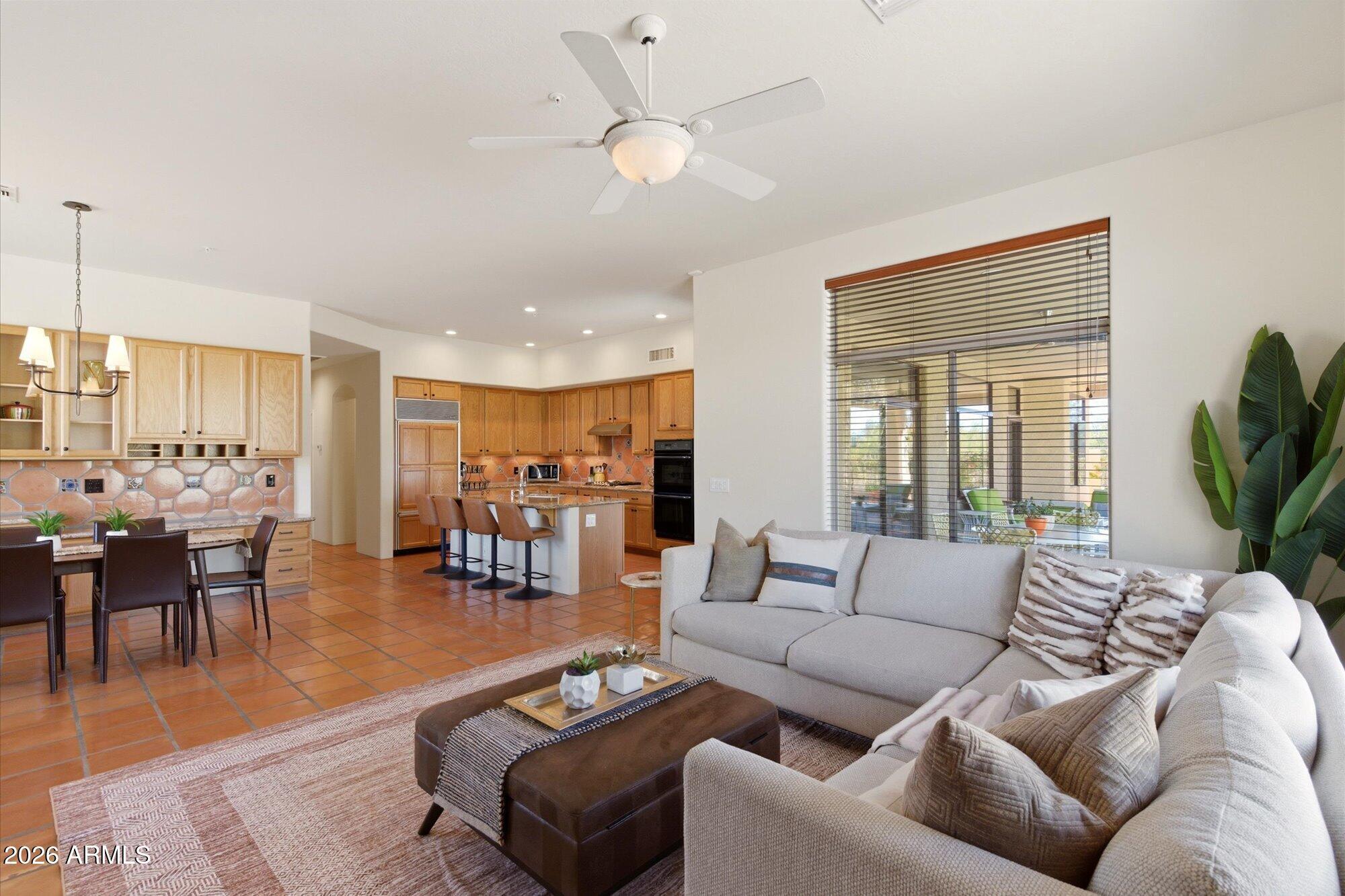 Welcome to Monterra, one of North Scottsdale's premier communities, and this beautifully updated fully furnished single-level home available for lease on a private 1.33-acre cul-de-sac lot featuring a rare 5-car garage. Offering an exceptional combination of space and privacy, this property is ideal for families, car enthusiasts, hobbyists, or anyone needing additional room for vehicles, storage, or recreational equipment. The 2,955 sq. ft. residence features a thoughtfully designed split floor plan with 4 bedrooms, a dedicated office near the front entrance, and 3 full bathrooms, providing flexibility for families, guests, or those working from home. The home showcases a warm Southwestern and Mediterranean character, highlighted by Saltillo tile flooring, solid oak hardwood floors,