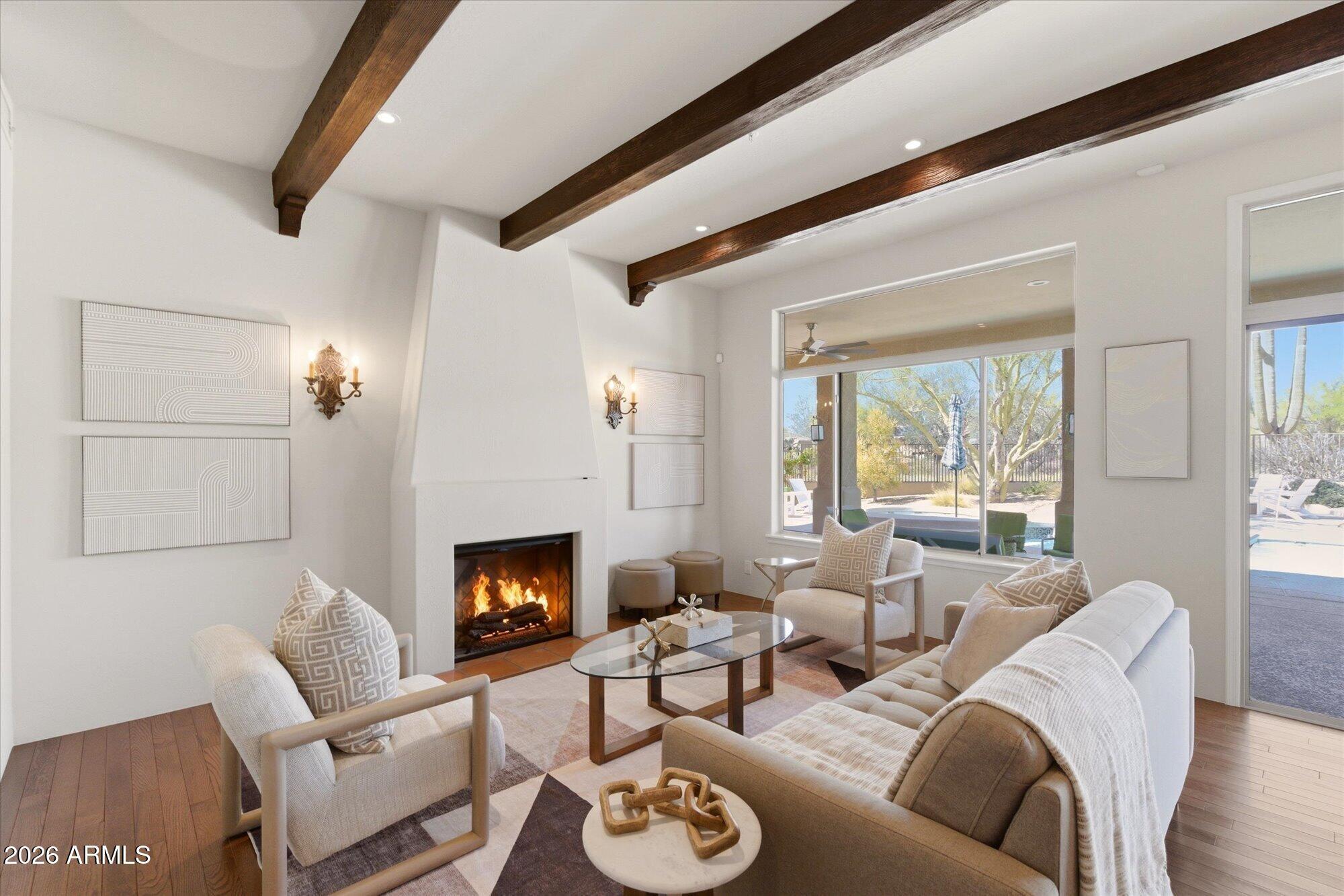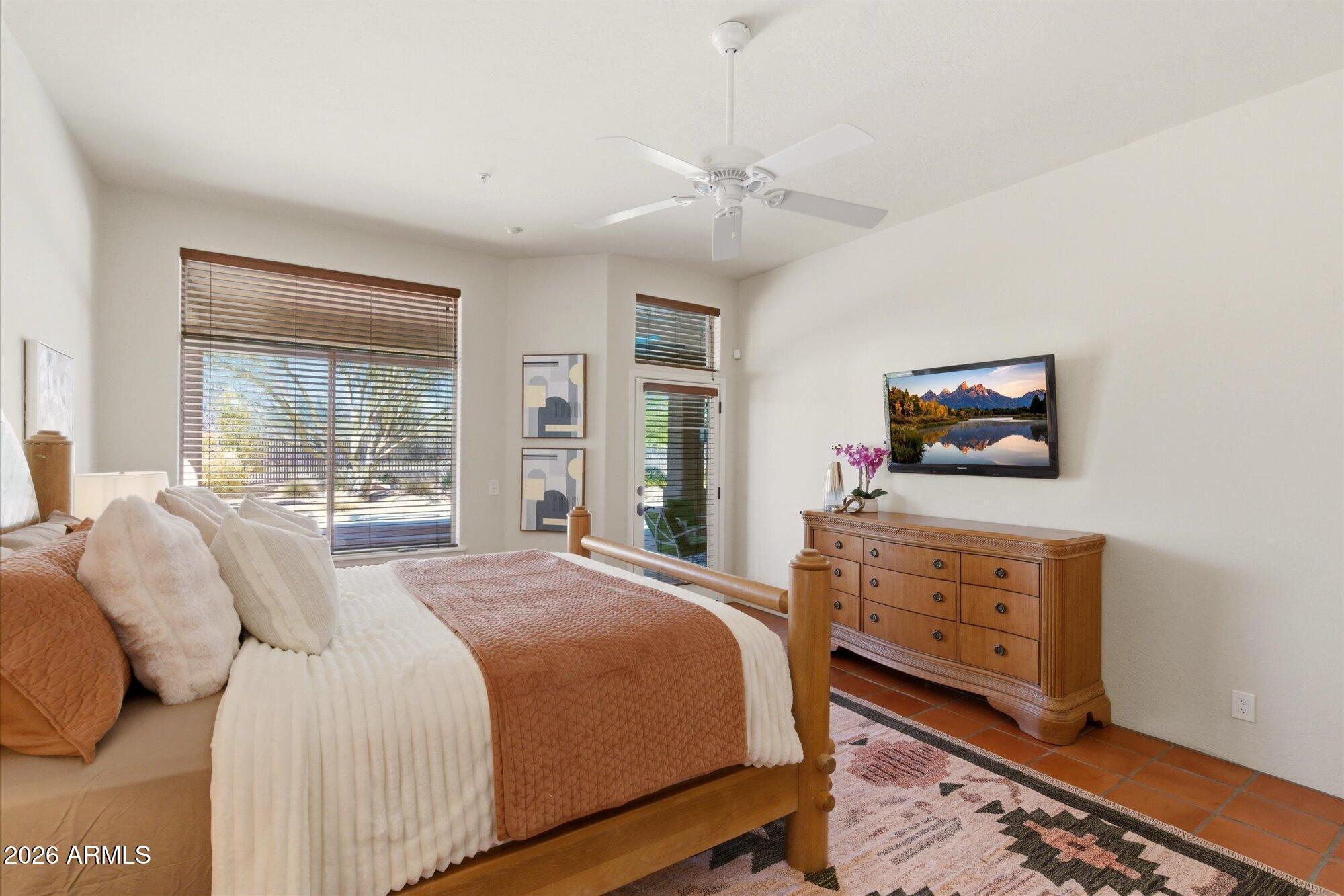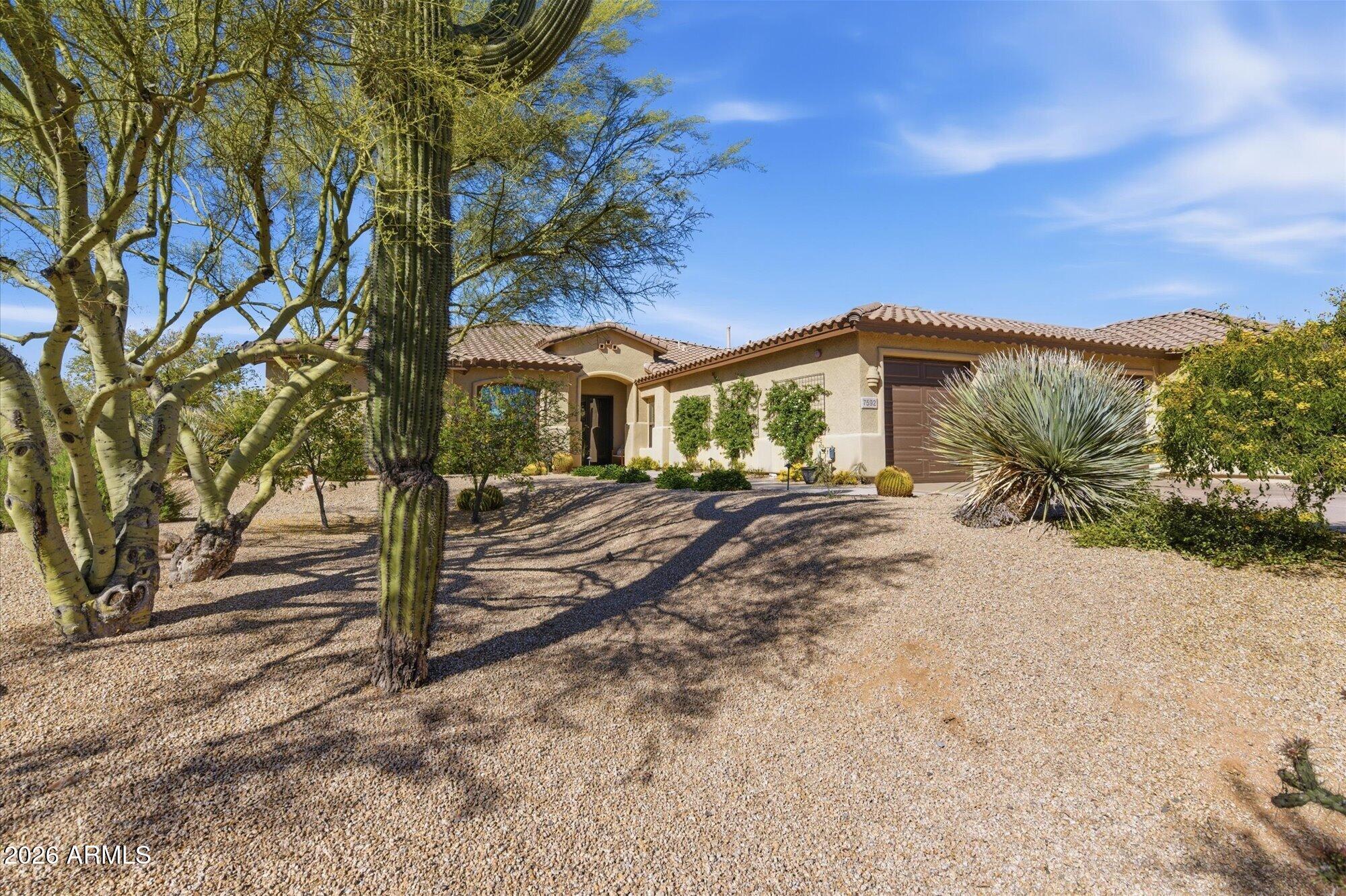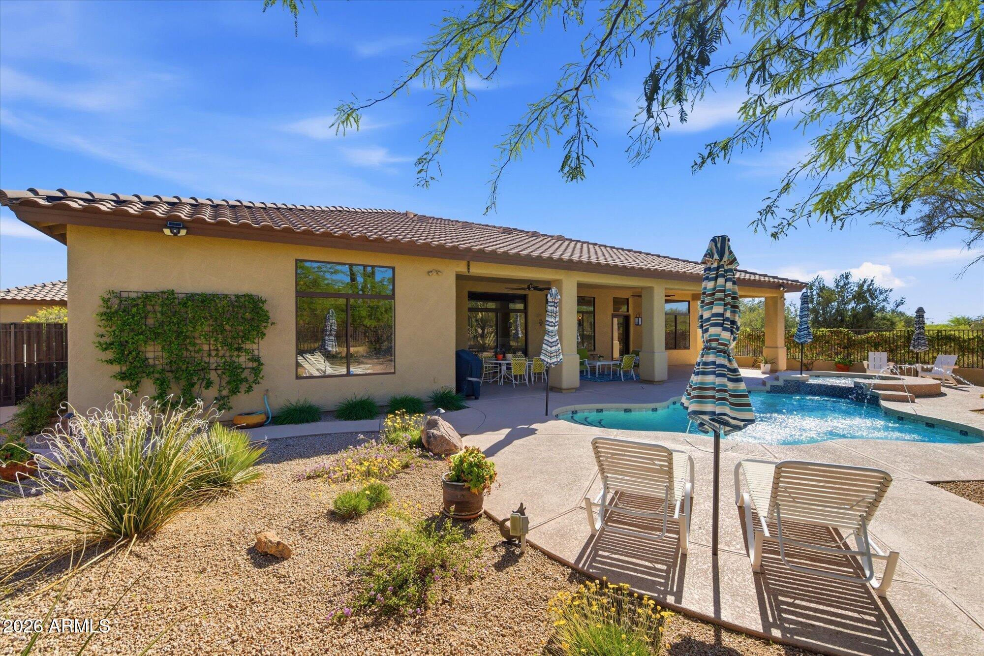 Welcome to Monterra, one of North Scottsdale's premier communities, and this beautifully updated fully furnished single-level home available for lease on a private 1.33-acre cul-de-sac lot featuring a rare 5-car garage. Offering an exceptional combination of space and privacy, this property is ideal for families, car enthusiasts, hobbyists, or anyone needing additional room for vehicles, storage, or recreational equipment. The 2,955 sq. ft. residence features a thoughtfully designed split floor plan with 4 bedrooms, a dedicated office near the front entrance, and 3 full bathrooms, providing flexibility for families, guests, or those working from home. The home showcases a warm Southwestern and Mediterranean character, highlighted by Saltillo tile flooring, solid oak hardwood floors,
