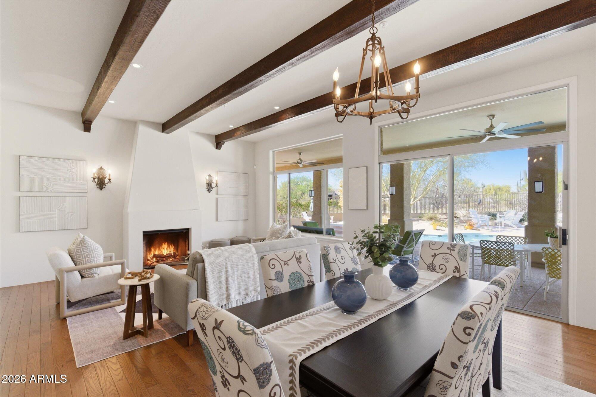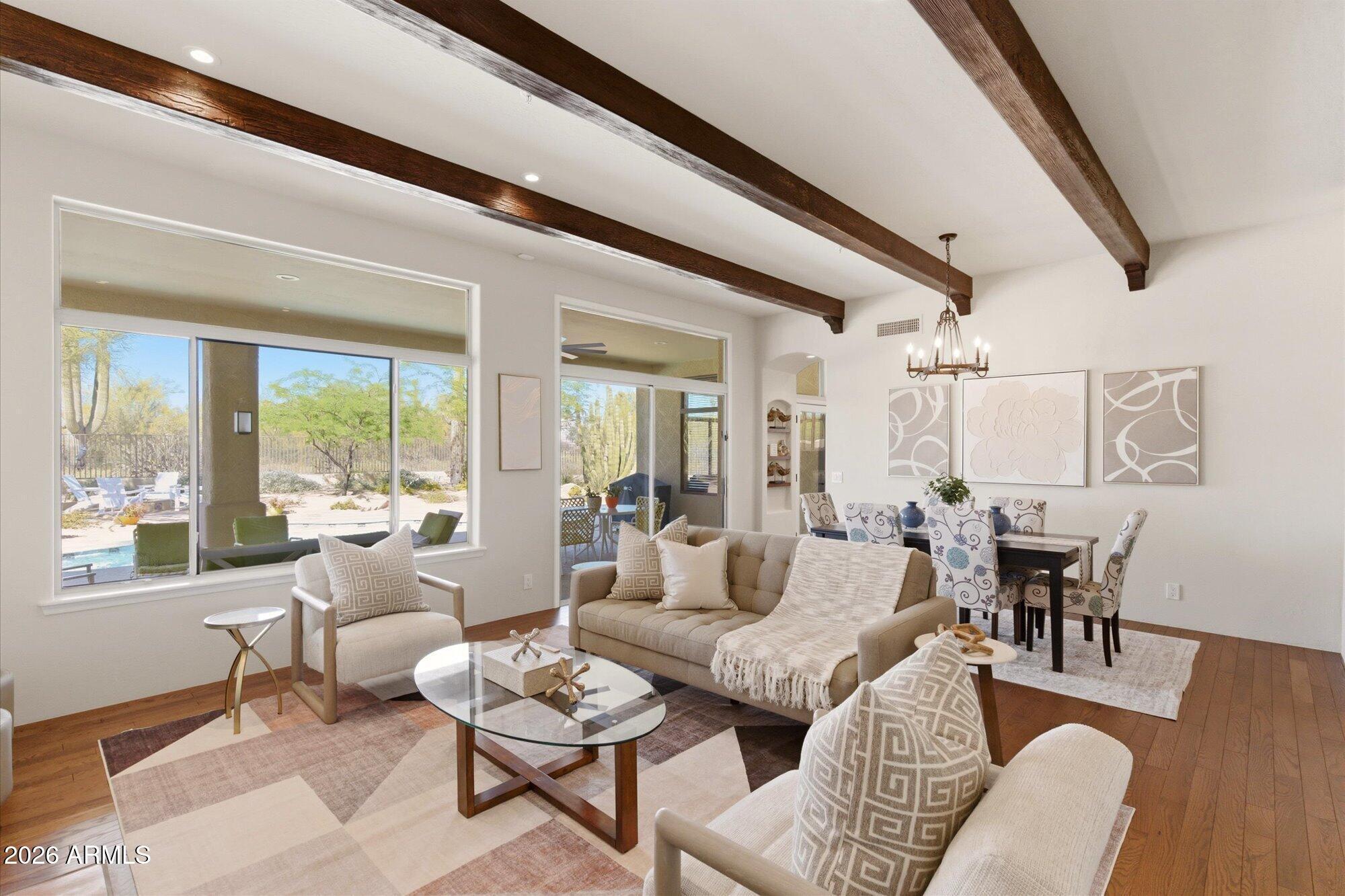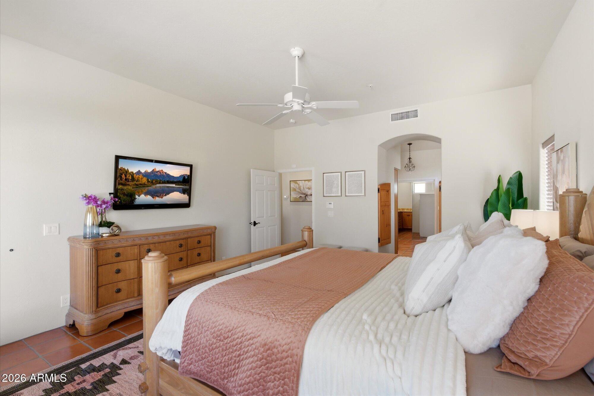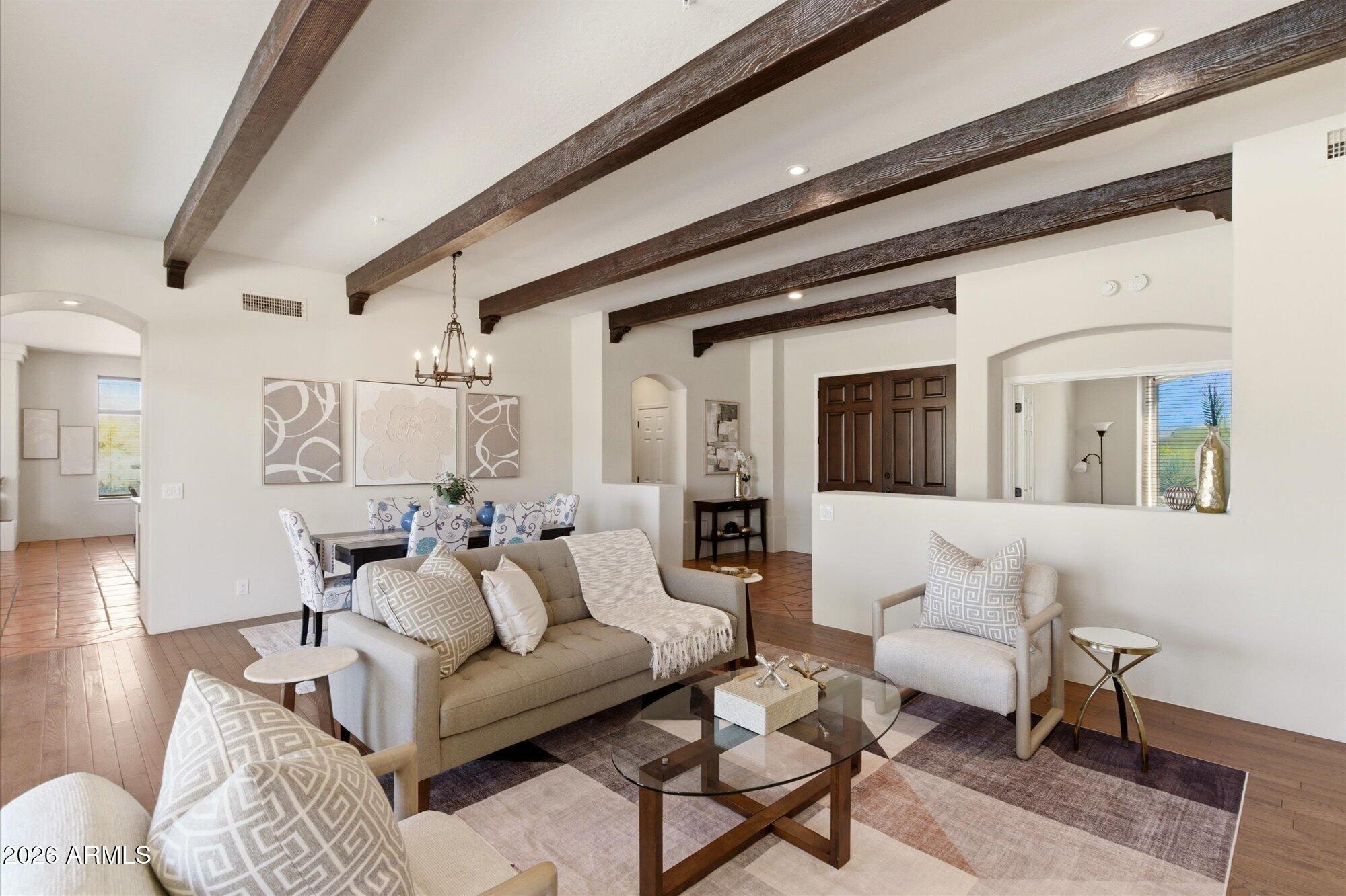 Welcome to Monterra, one of North Scottsdale's premier communities, and this beautifully updated fully furnished single-level home available for lease on a private 1.33-acre cul-de-sac lot featuring a rare 5-car garage. Offering an exceptional combination of space and privacy, this property is ideal for families, car enthusiasts, hobbyists, or anyone needing additional room for vehicles, storage, or recreational equipment. The 2,955 sq. ft. residence features a thoughtfully designed split floor plan with 4 bedrooms, a dedicated office near the front entrance, and 3 full bathrooms, providing flexibility for families, guests, or those working from home. The home showcases a warm Southwestern and Mediterranean character, highlighted by Saltillo tile flooring, solid oak hardwood floors,