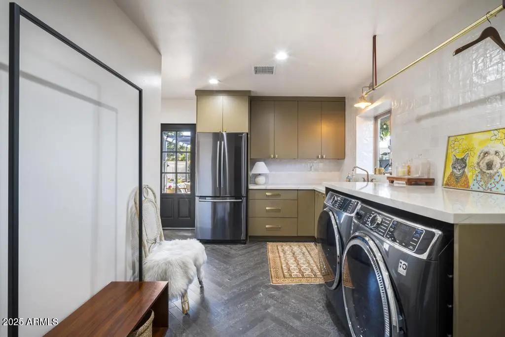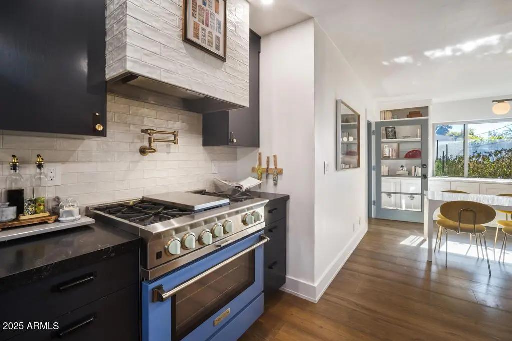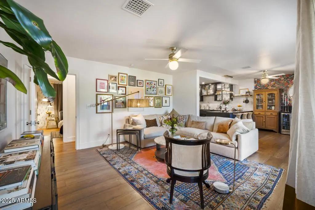 Welcome to 8221 E Edgemont Ave—an exquisitely remodeled home where timeless design meets elevated, modern living. Reimagined by Grace Lauren Design, this residence showcases a full-scale transformation that brings custom craftsmanship, luxury finishes, and functional upgrades to every corner of the home. Step inside to an inviting open layout enhanced by raised soffits, all-new wood flooring, and designer millwork that sets the tone for a refined yet comfortable living experience. The kitchen is a showpiece—featuring custom cabinetry, granite countertops, ceramic tile backsplash, Brizo plumbing, and an enviable lineup of luxury appliances, including a built-in JennAir refrigerator, built-in Bosch dishwasher, 36'' custom Bluestar gas range, and under-counter beverage fridge.