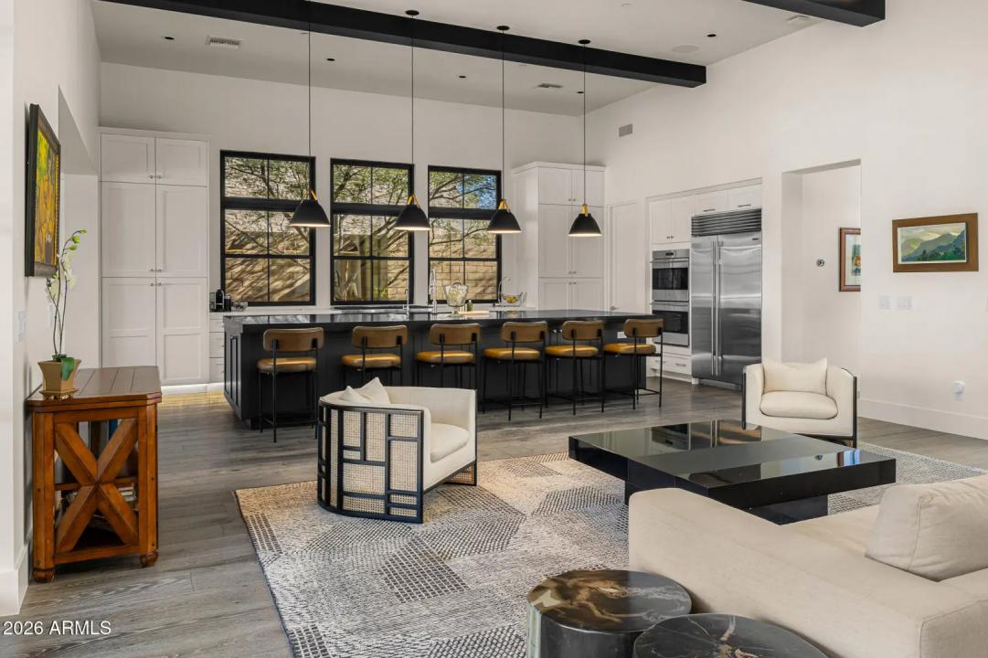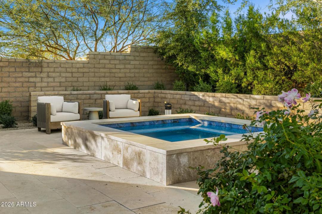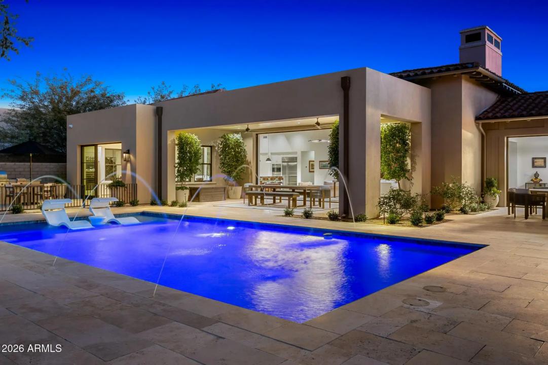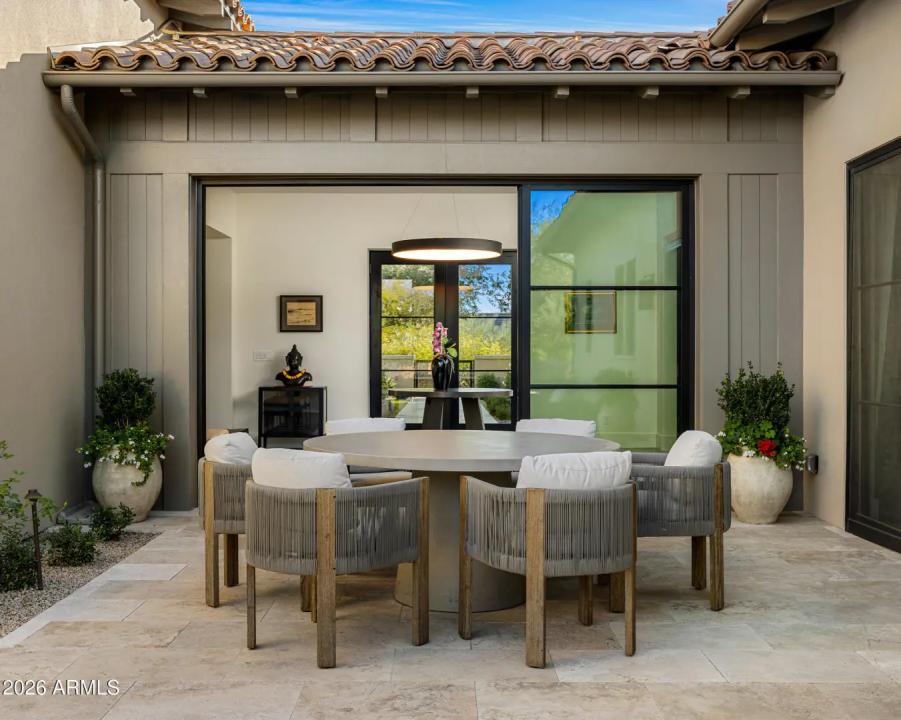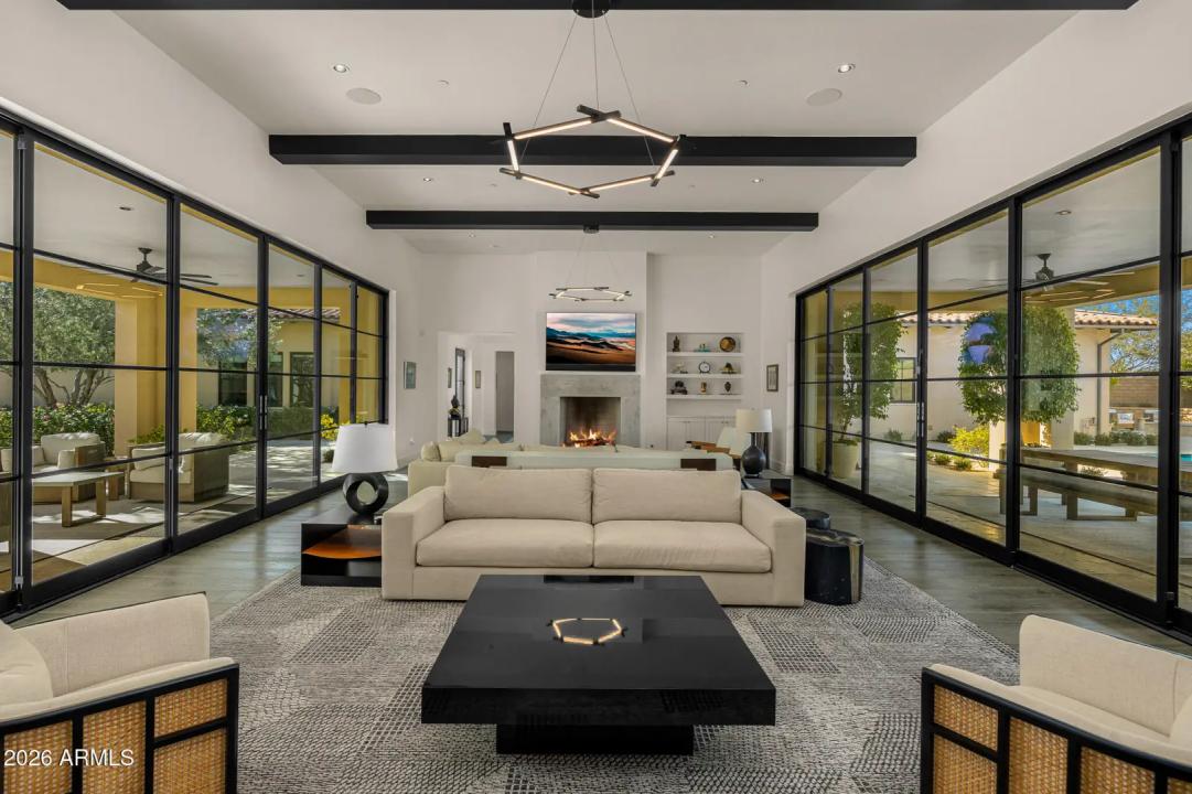Welcome to White Horse, Scottsdale's top gated luxury community. A serene front courtyard sets the tone, featuring mature trees, a cozy fireplace, and inviting spaces for outdoor dining and entertaining. Step through the grand front vestibule into a stunning great room where open-concept living takes center stage. A statement fireplace anchors the space, while sliding glass doors on both sides capture views of the tranquil courtyard in front and the sparkling backyard pool beyond—creating seamless indoor-outdoor flow. The chef's kitchen is both beautiful and functional, offering a large island with gas cook top, high-end appliances, walk-in pantry, and a charming breakfast nook ideal for everyday living. The private primary suite overlooks the backyard and serves as a true retreat,