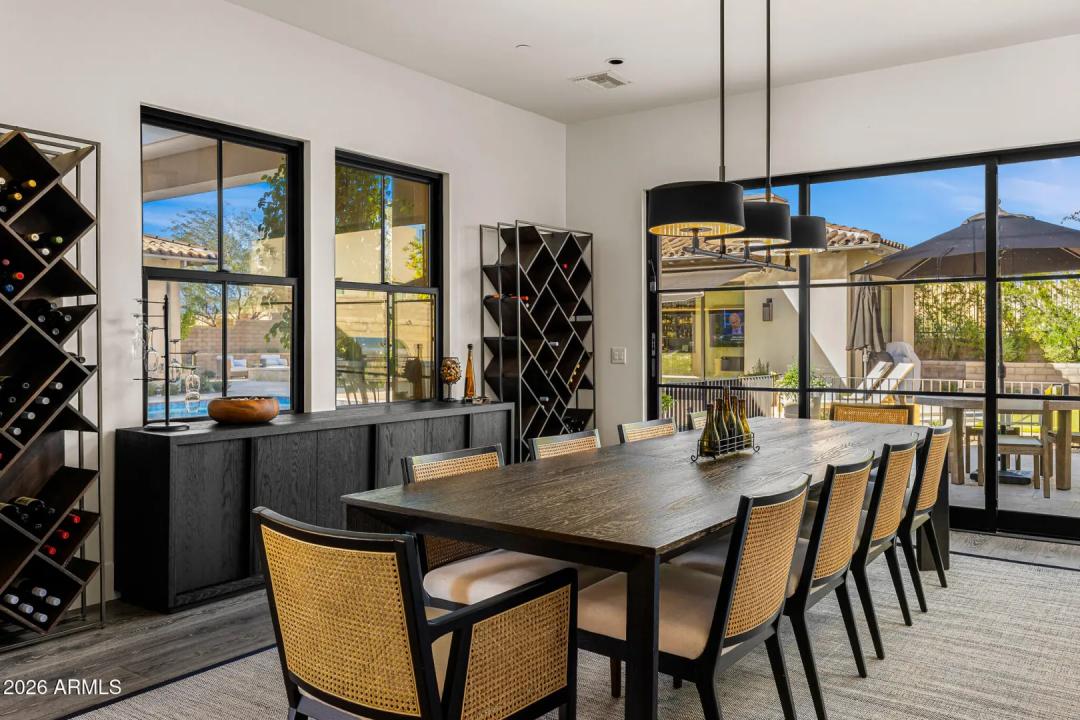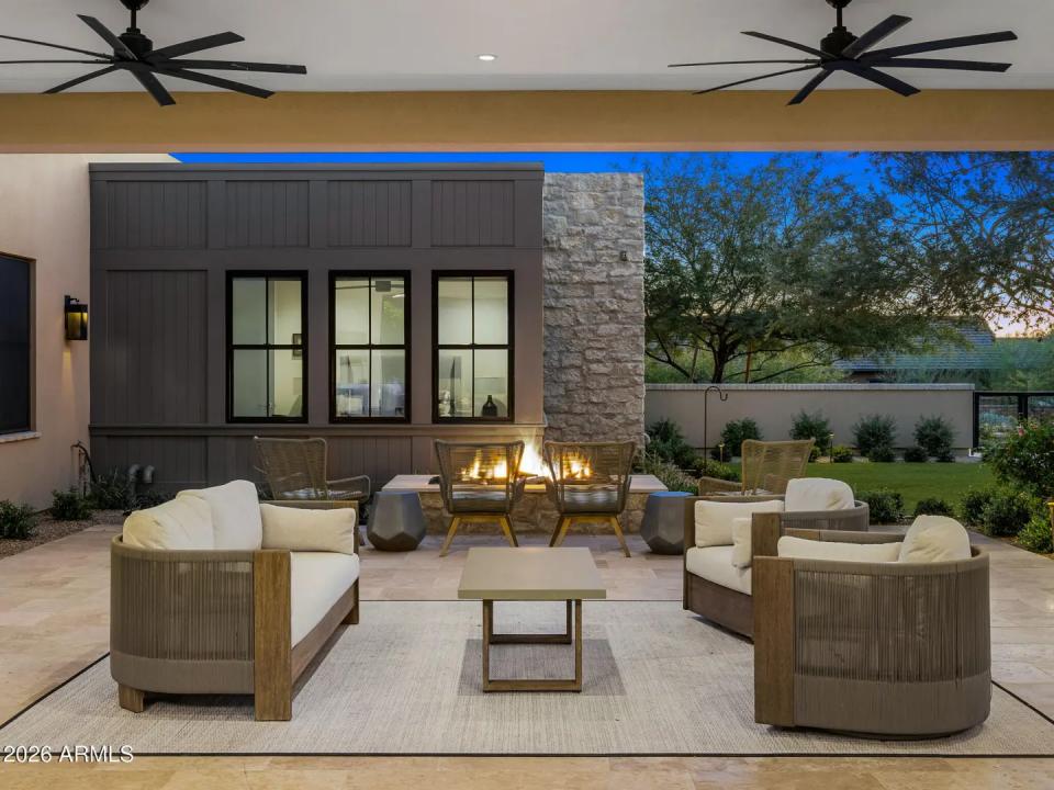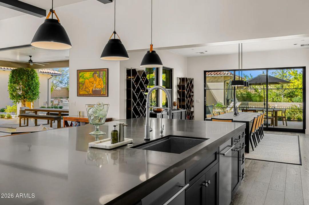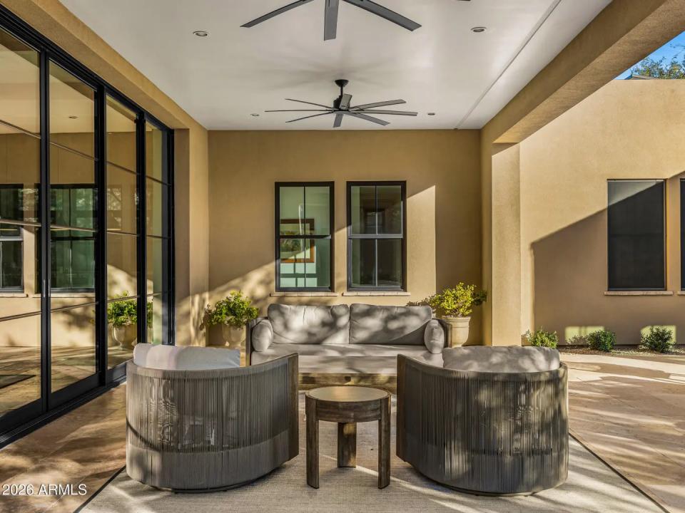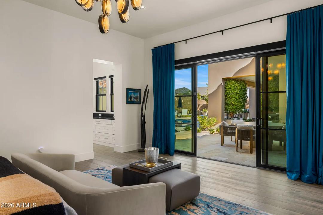 Welcome to White Horse, Scottsdale's top gated luxury community. A serene front courtyard sets the tone, featuring mature trees, a cozy fireplace, and inviting spaces for outdoor dining and entertaining. Step through the grand front vestibule into a stunning great room where open-concept living takes center stage. A statement fireplace anchors the space, while sliding glass doors on both sides capture views of the tranquil courtyard in front and the sparkling backyard pool beyond—creating seamless indoor-outdoor flow. The chef's kitchen is both beautiful and functional, offering a large island with gas cook top, high-end appliances, walk-in pantry, and a charming breakfast nook ideal for everyday living. The private primary suite overlooks the backyard and serves as a true retreat,
