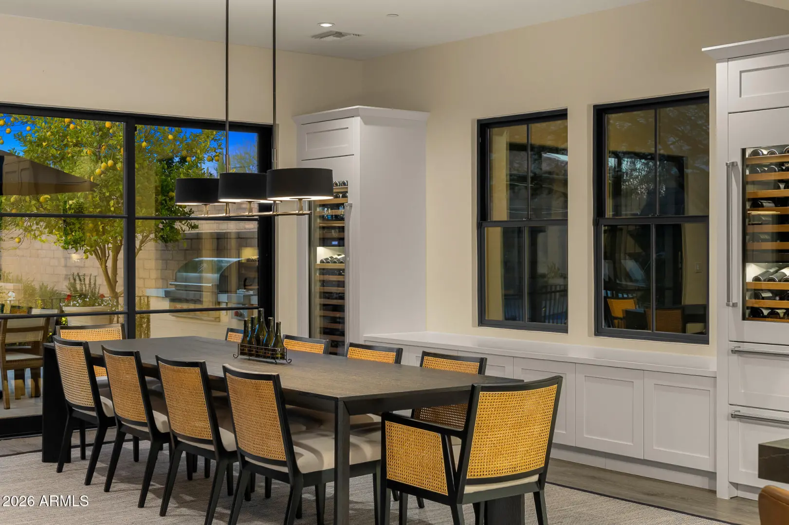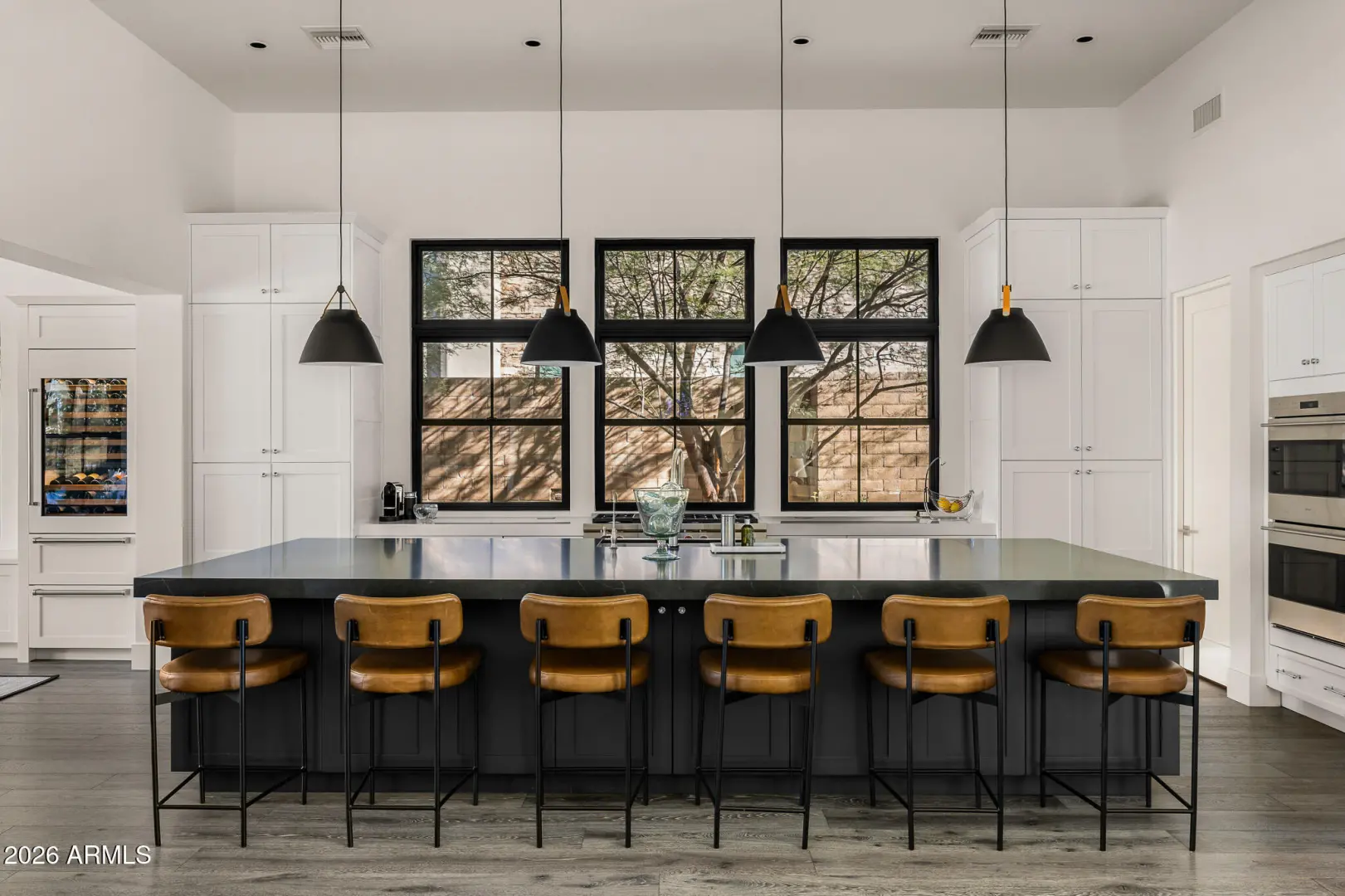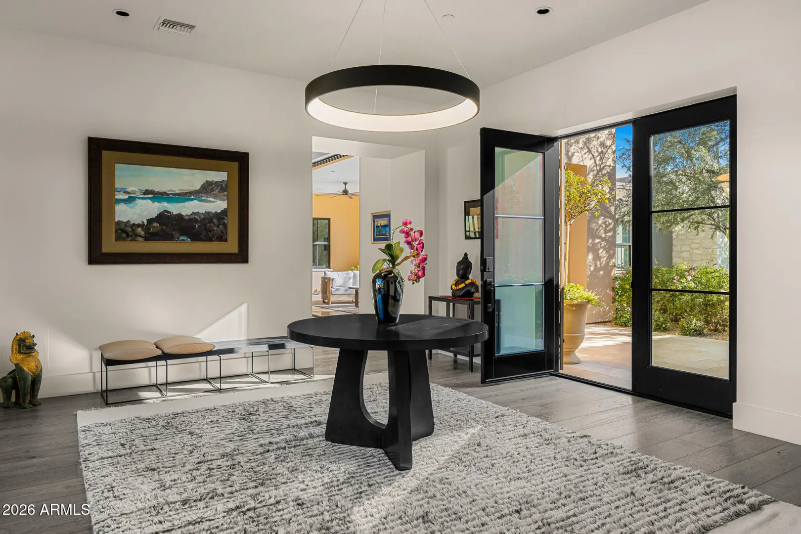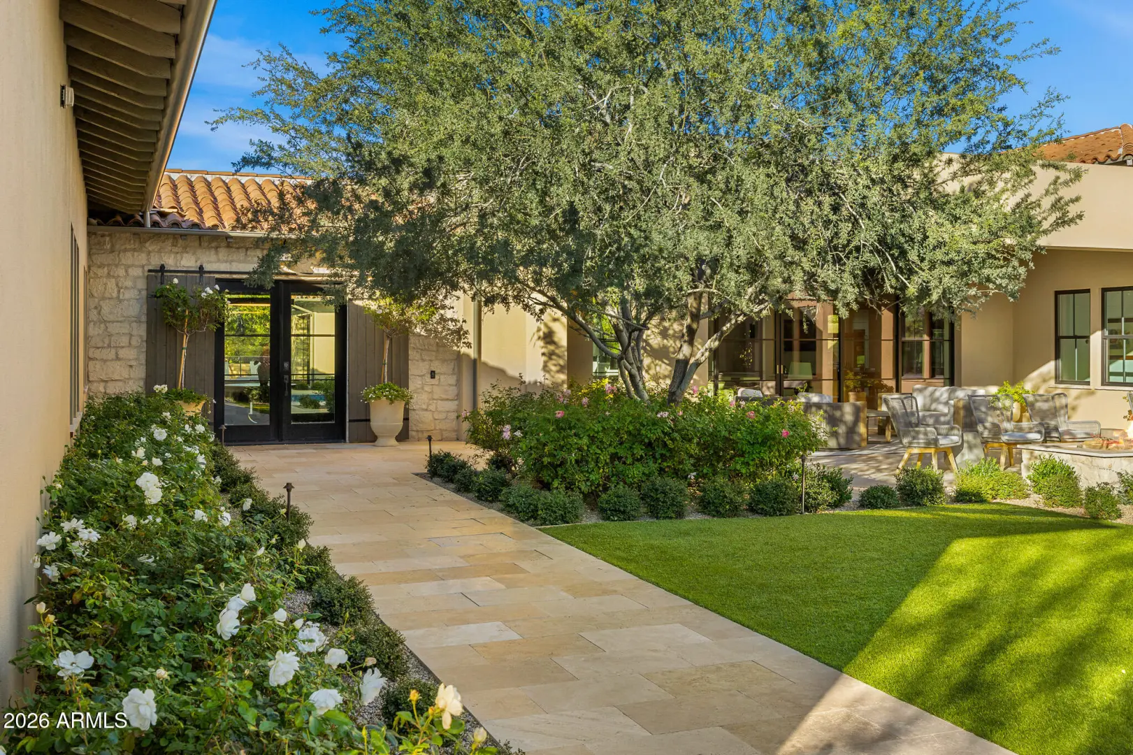 Welcome to White Horse, Scottsdale's top gated luxury community. A serene front courtyard sets the tone, featuring mature trees, a cozy fireplace, and inviting spaces for outdoor dining and entertaining. Step through the grand front vestibule into a stunning great room where open-concept living takes center stage. A statement fireplace anchors the space, while sliding glass doors on both sides capture views of the tranquil courtyard in front and the sparkling backyard pool beyond—creating seamless indoor-outdoor flow. The chef's kitchen is both beautiful and functional, offering a large island with gas cook top, high-end appliances, walk-in pantry, and a charming breakfast nook ideal for everyday living. The private primary suite overlooks the backyard and serves as a true retreat,